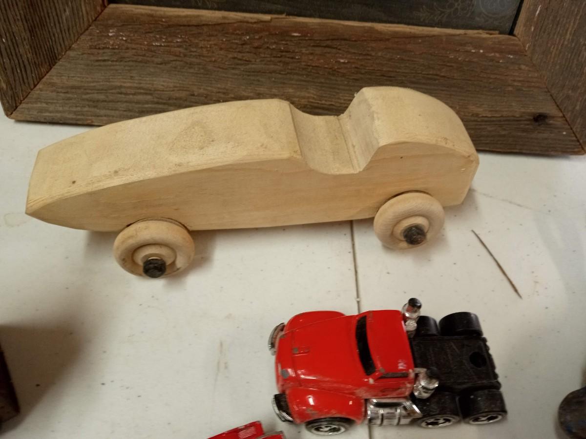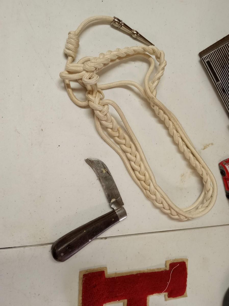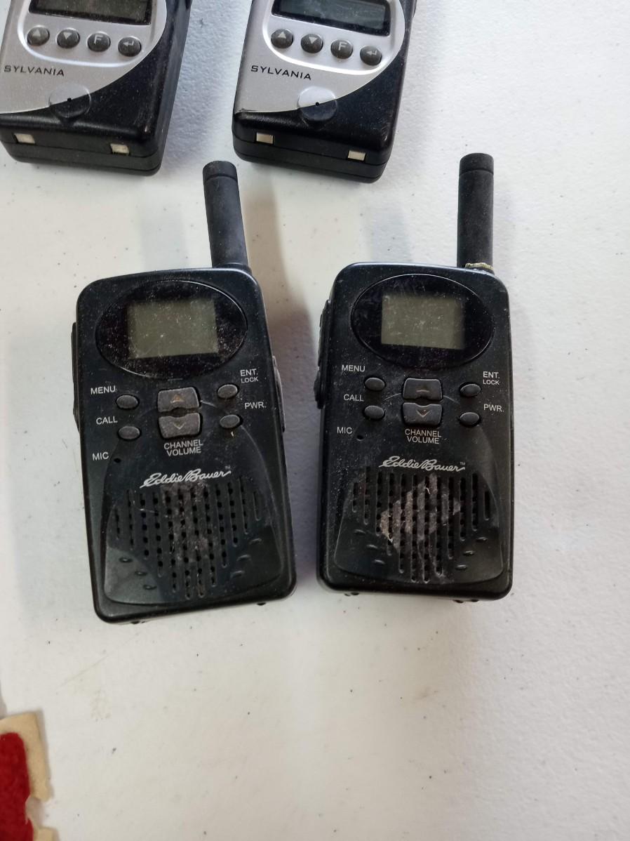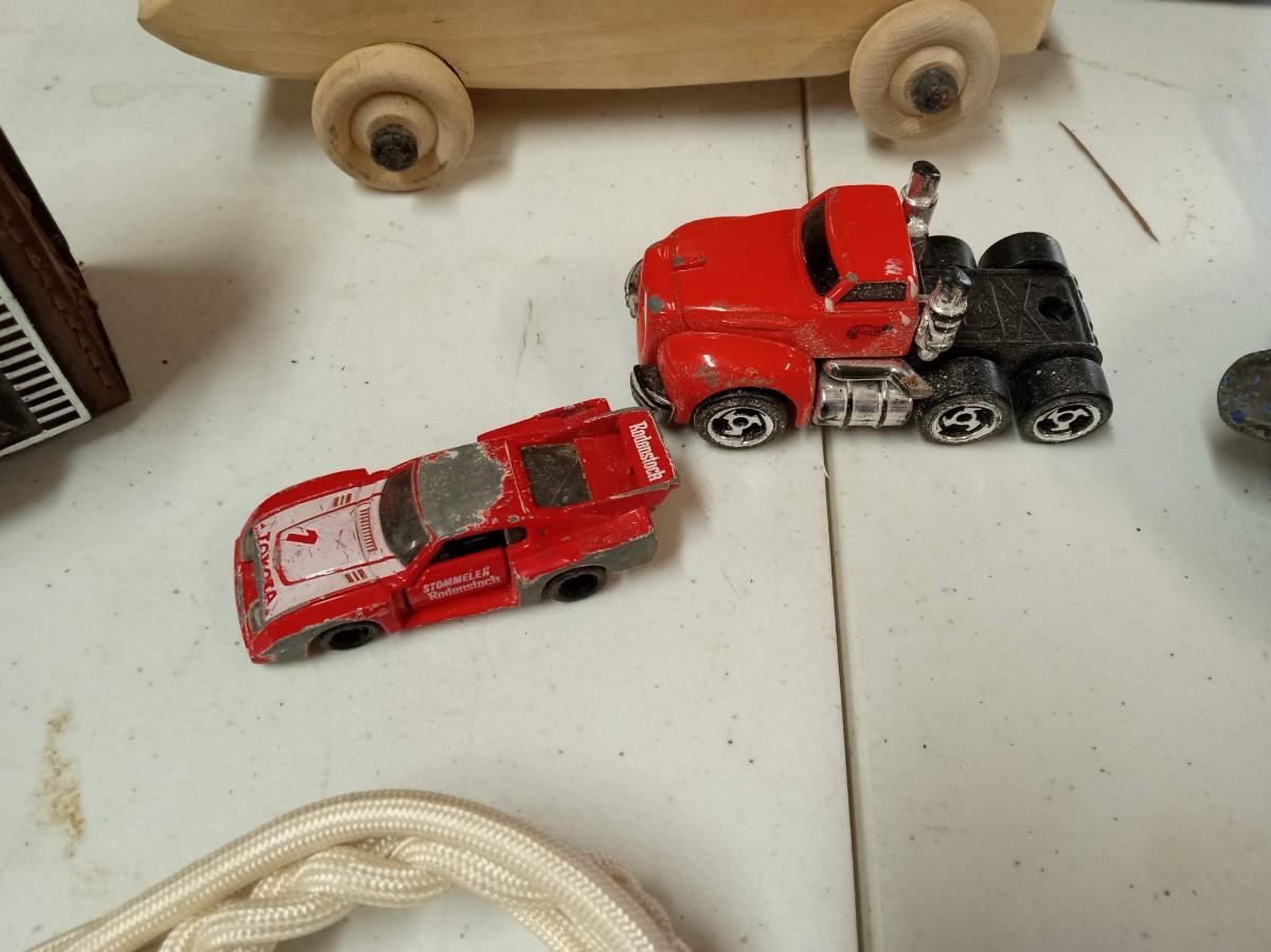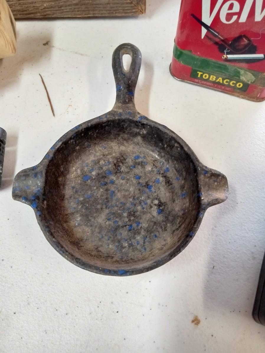 BARN WOOD FRAME, TRANSISTER RADIO, 2 SETS OF WALKIE TALKIE LIKE, CAST IRON SKILLET ASHTRAY, WOODEN CAR, POCKET KNIFE, RED VELVET TIN CAN AND MORE