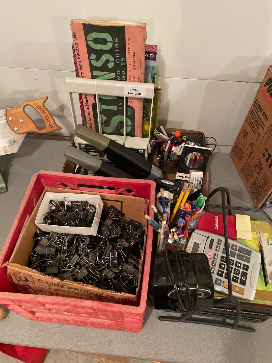 2 industrial staplers/trays/Huge box of metal clips/stencils/adding machine/electric pencil sharpener/pens & pencils - see photos of all in 2 boxes & red plastic crate.