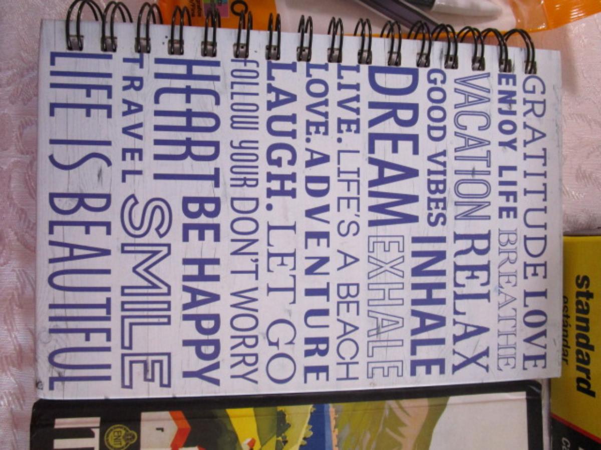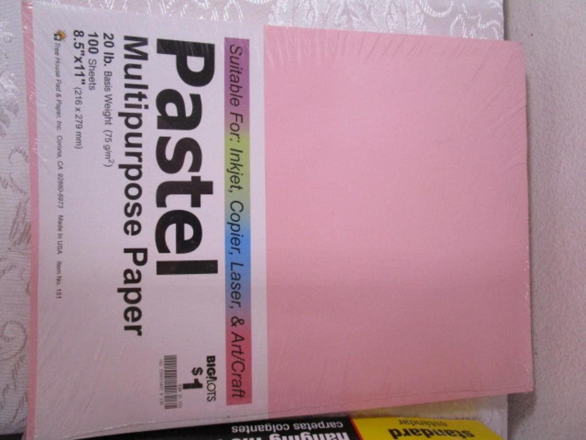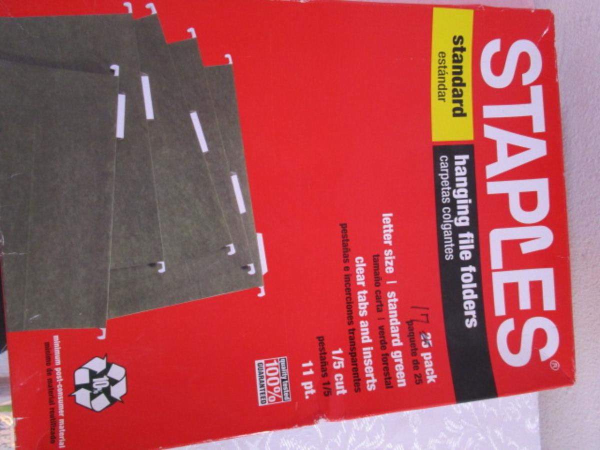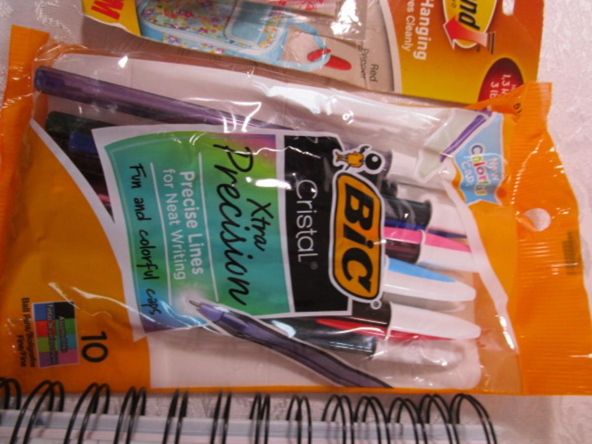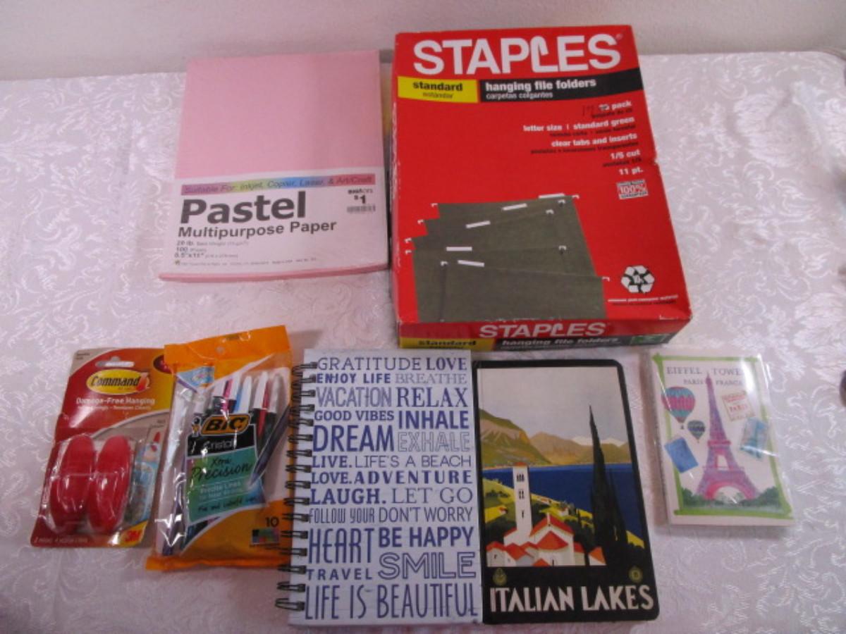 17 Staples hanging file folders, 3 journals, 10 Bic Pens, 2 hanging Commando hooks, Multi-purpose pink paper