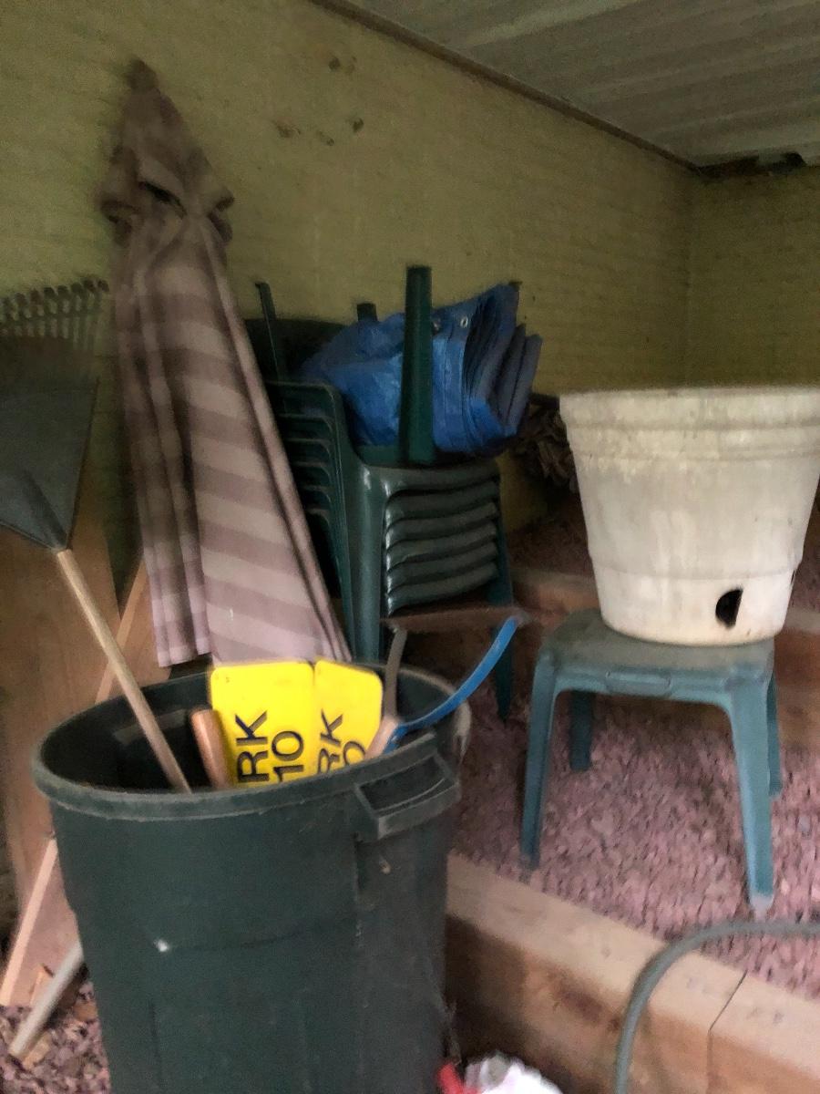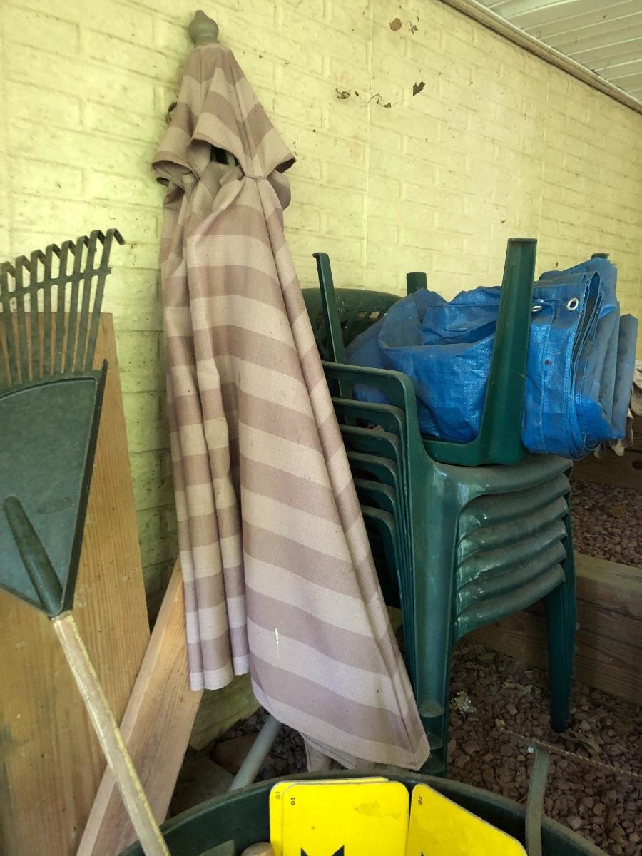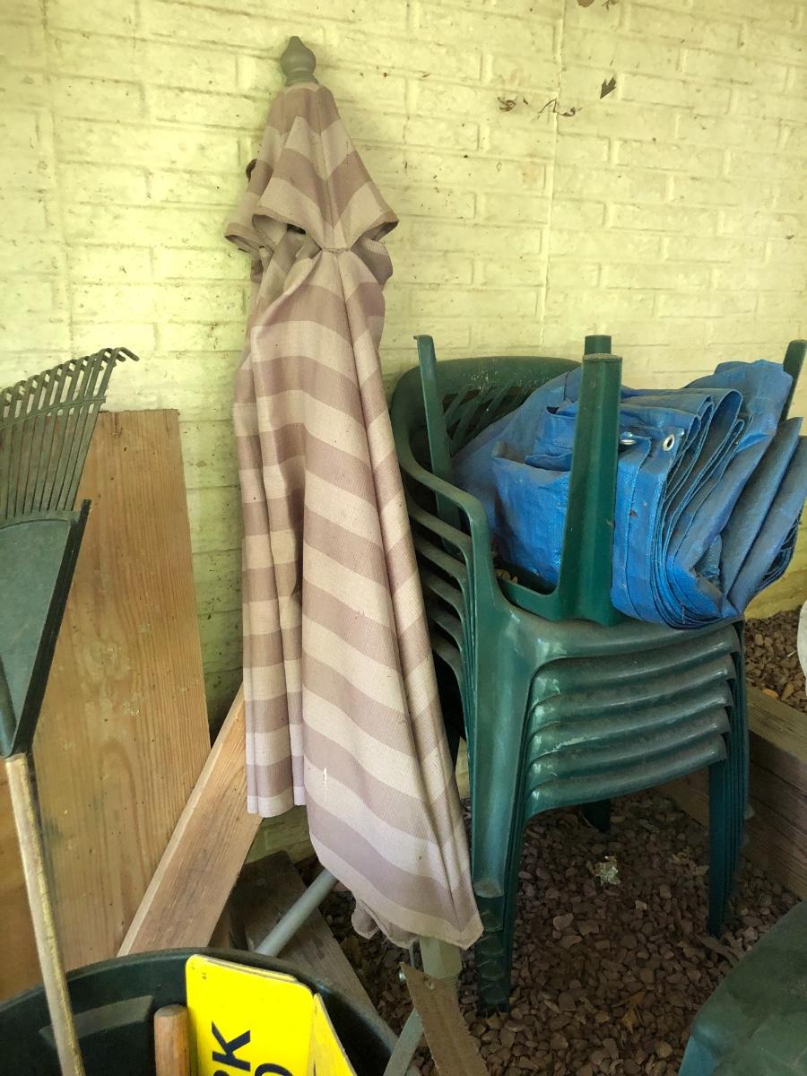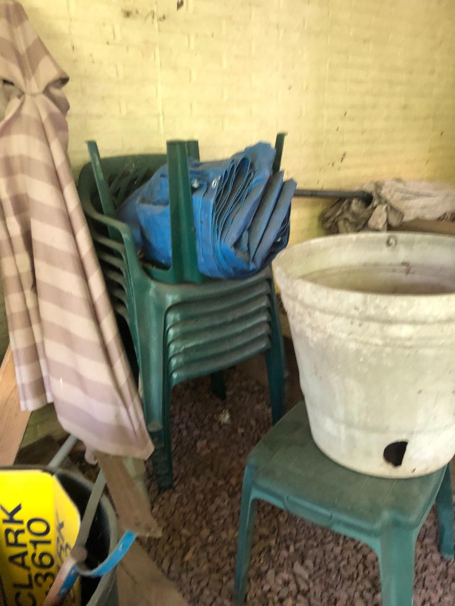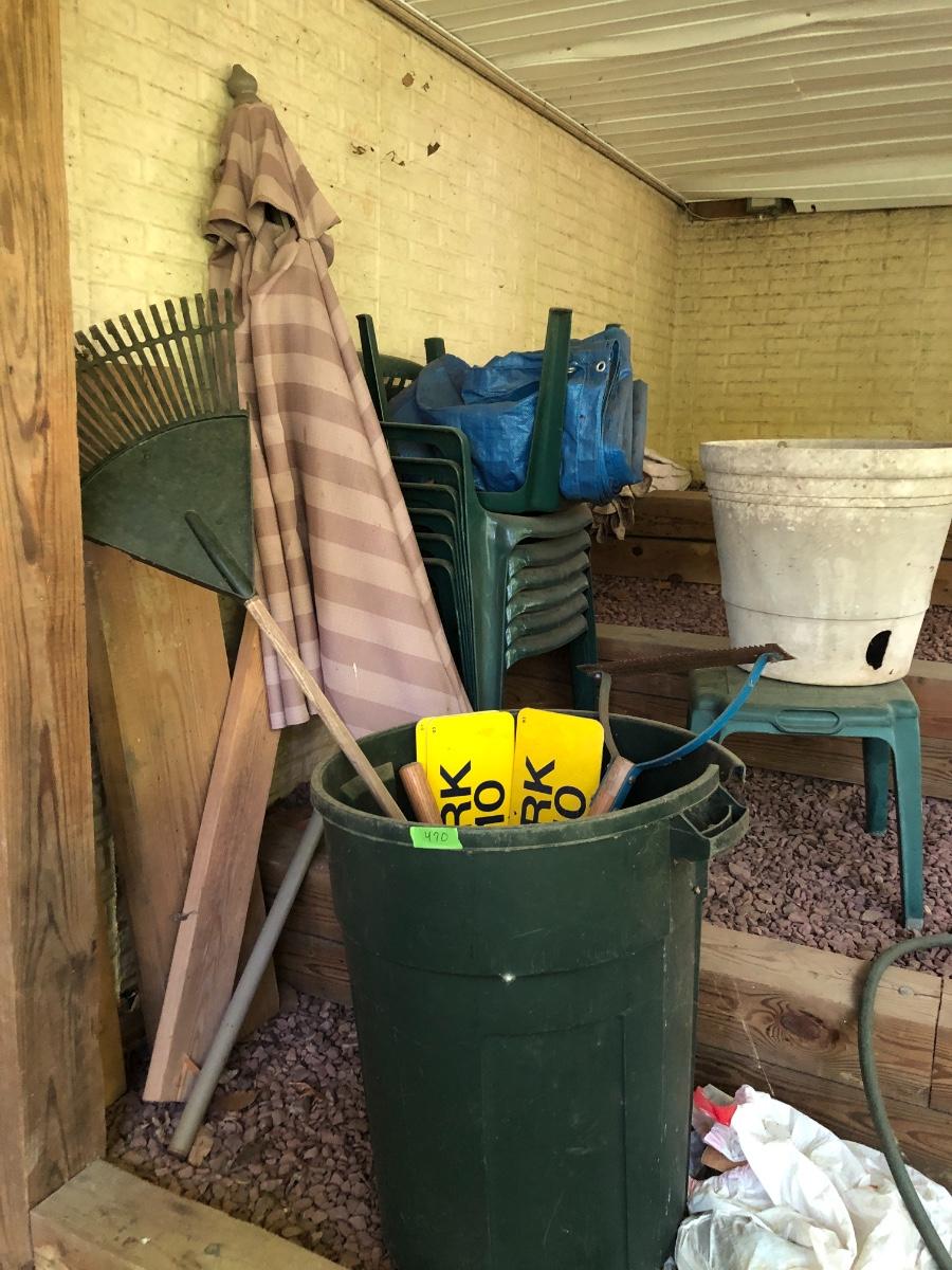 We have added many quality photos for each lot showing content, condition, & dimensions. Feel free to e-mail or text any questions. All items are sold as is, as found in the estate. Please see all photos for content, measurements and condition. Unknown condition... Two Umbrellas, Green Plastic Outdoor Patio Chairs, Small Green Outdoor Table, Plant Pot, Blue Tarp, Rake/Garden Tools in Green Trash Can, to include the Green Trash Can.