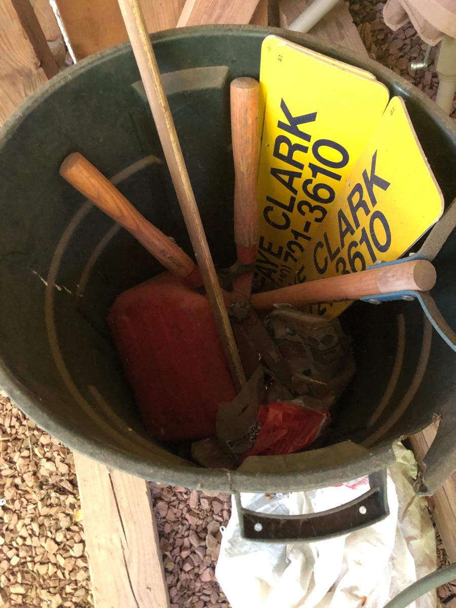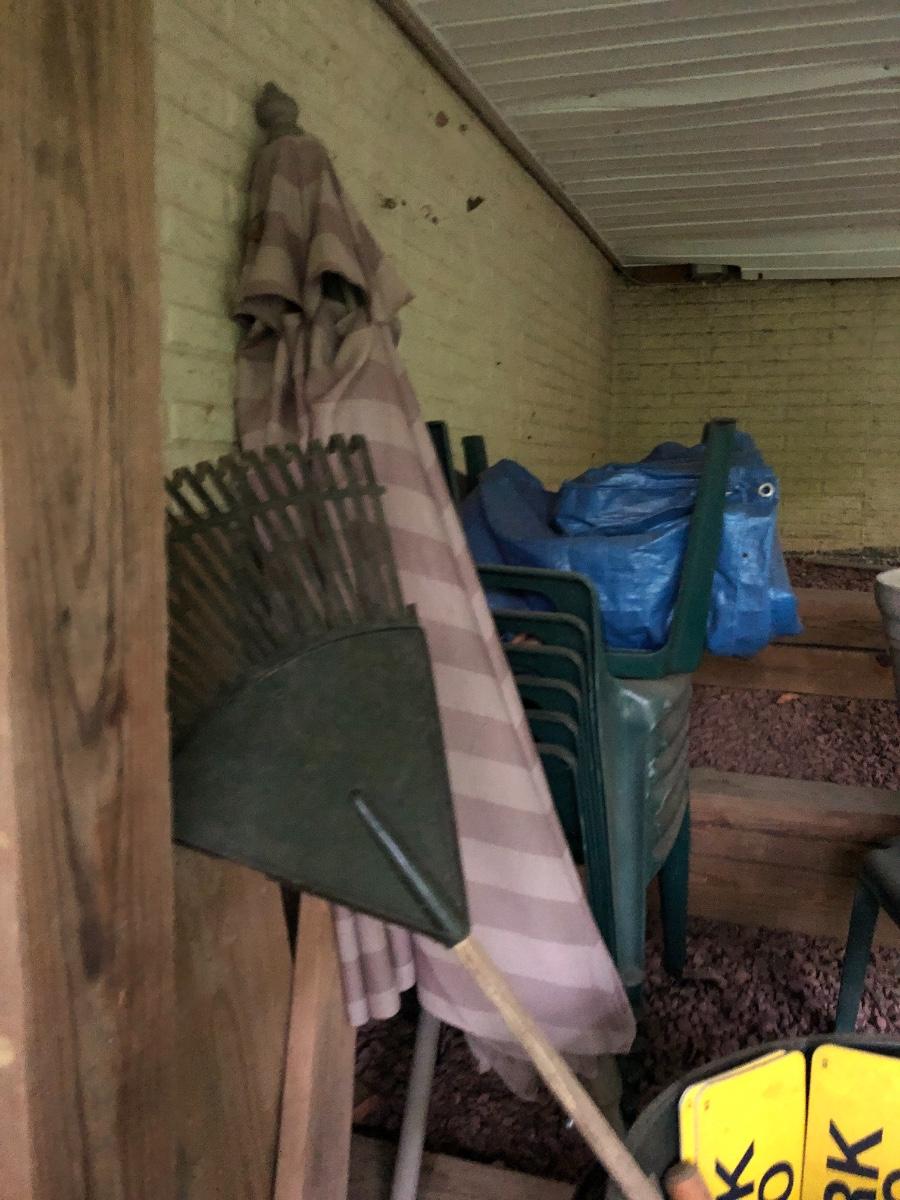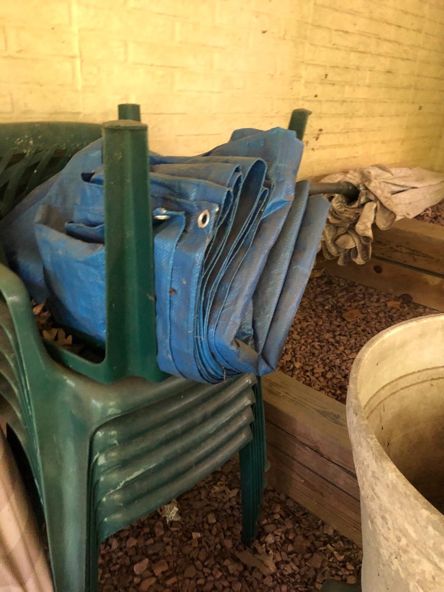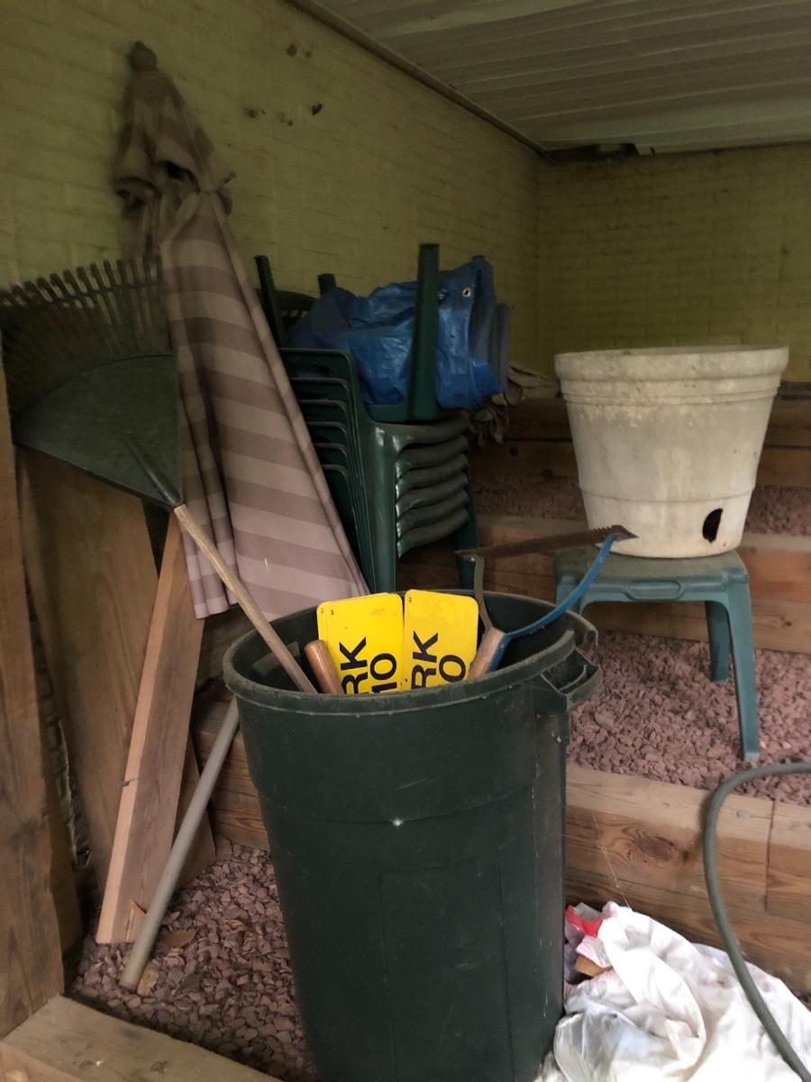 We have added many quality photos for each lot showing content, condition, & dimensions. Feel free to e-mail or text any questions. All items are sold as is, as found in the estate. Please see all photos for content, measurements and condition. Unknown condition... Two Umbrellas, Green Plastic Outdoor Patio Chairs, Small Green Outdoor Table, Plant Pot, Blue Tarp, Rake/Garden Tools in Green Trash Can, to include the Green Trash Can.