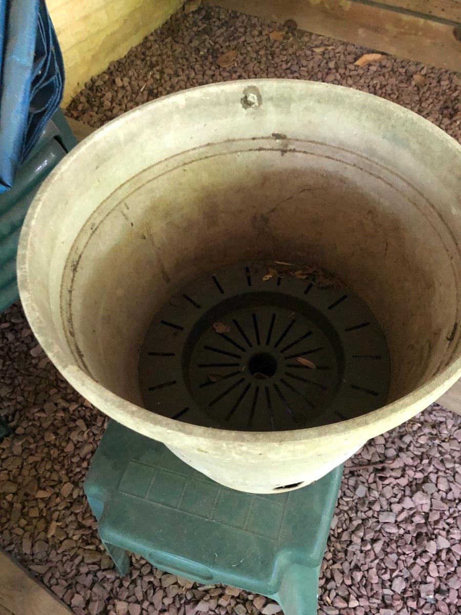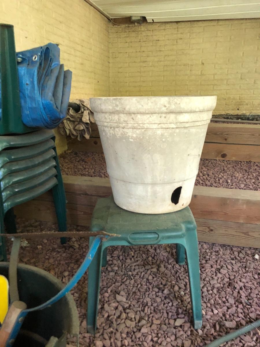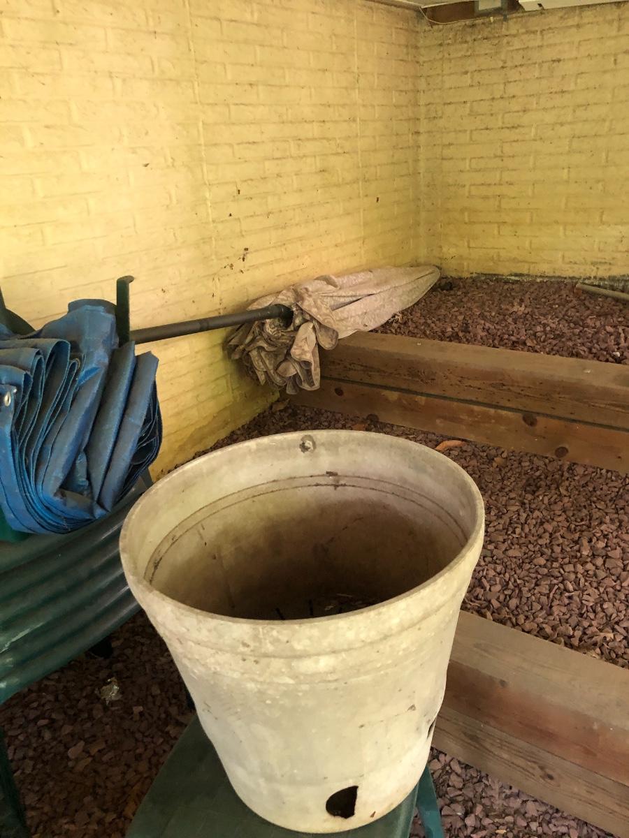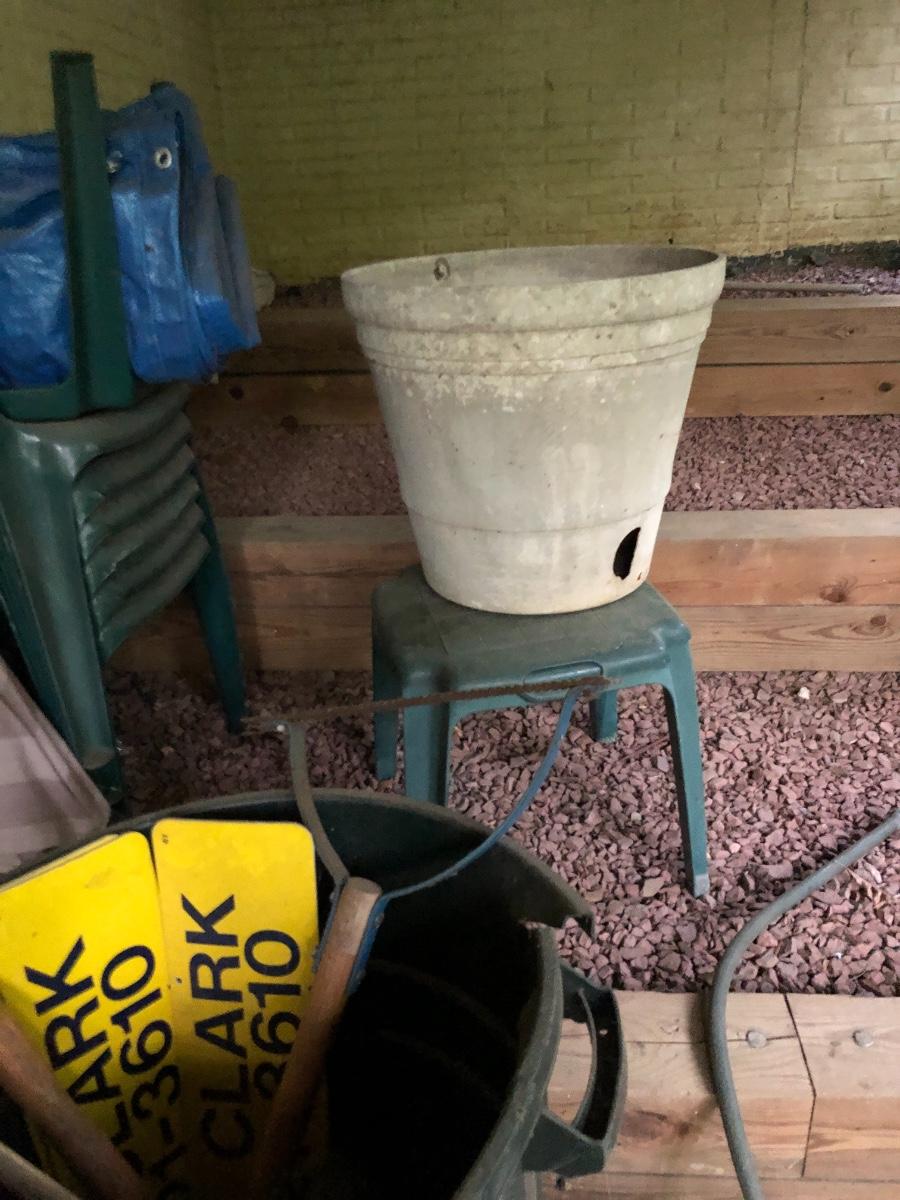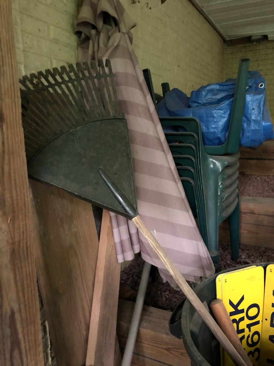 We have added many quality photos for each lot showing content, condition, & dimensions. Feel free to e-mail or text any questions. All items are sold as is, as found in the estate. Please see all photos for content, measurements and condition. Unknown condition... Two Umbrellas, Green Plastic Outdoor Patio Chairs, Small Green Outdoor Table, Plant Pot, Blue Tarp, Rake/Garden Tools in Green Trash Can, to include the Green Trash Can.