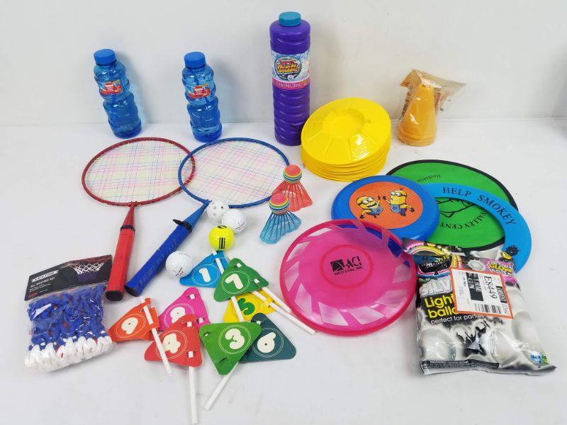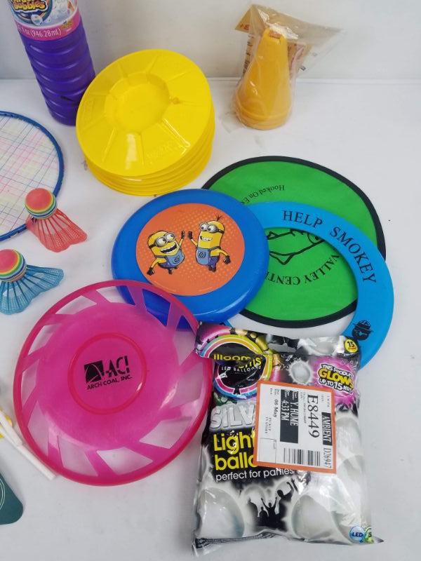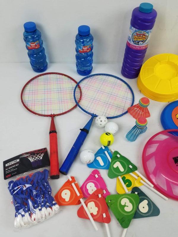 Misc Outdoor Toys. Bubbles, Badminton, Frisbees, etc with Blue Basket