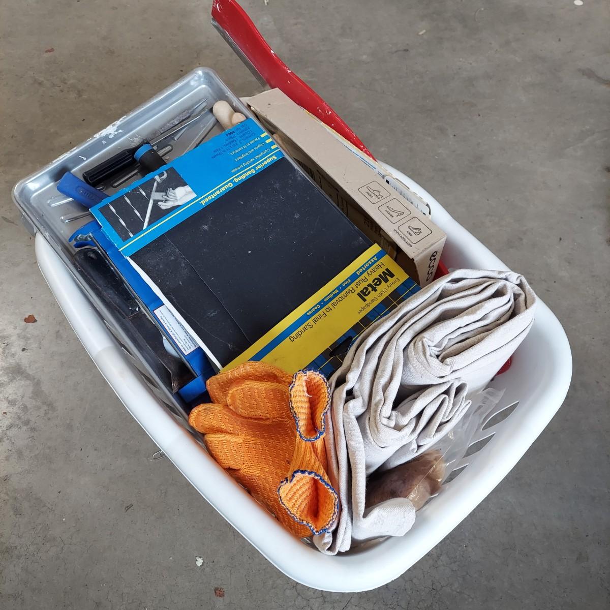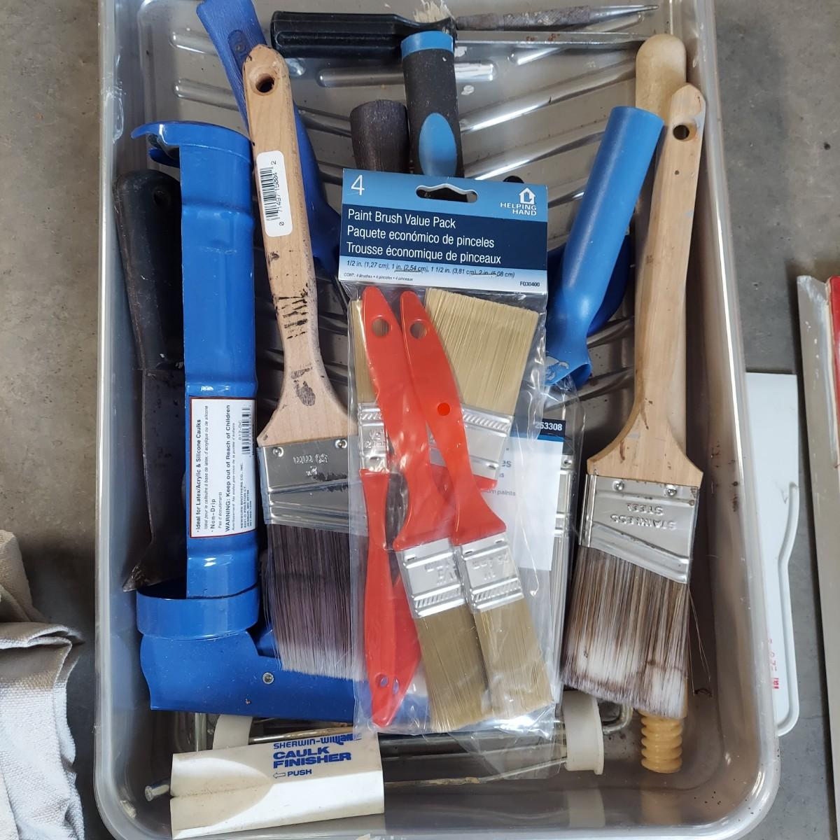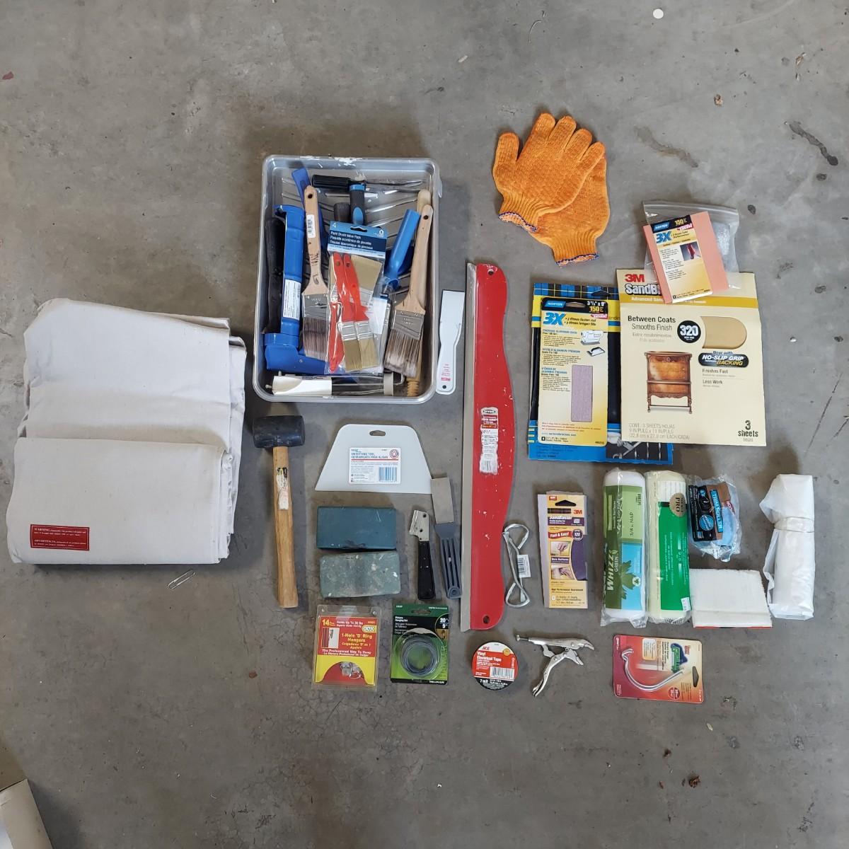 Miscellaneous painting supplies including brushes, a tarp, gloves, sandpaper and more. Please see photos for details. Local Pickup Only