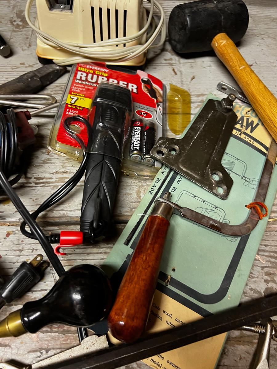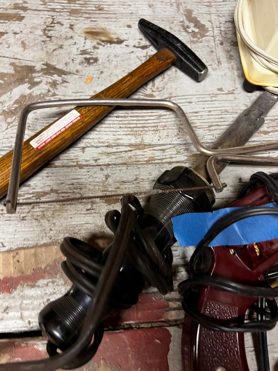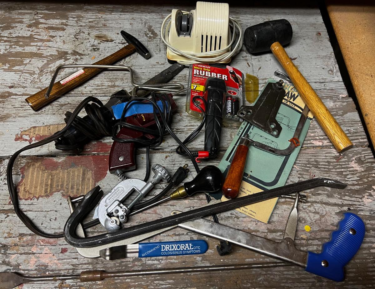 Misc. Pile of Tools: Saw, Hammer, Rubber Mallet Knife Sharpener