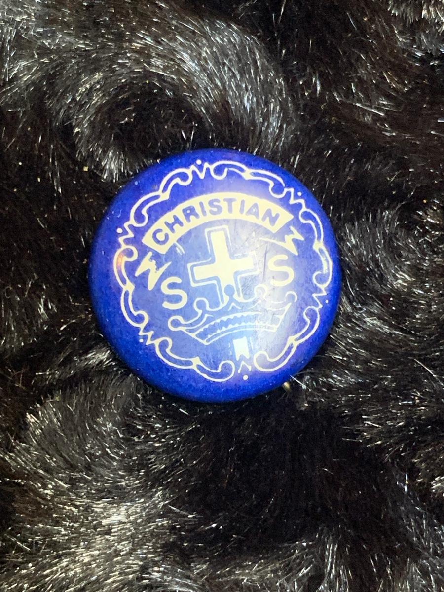 Antique Christian SS Sunday School Button Pinback Little System Cross + Crown