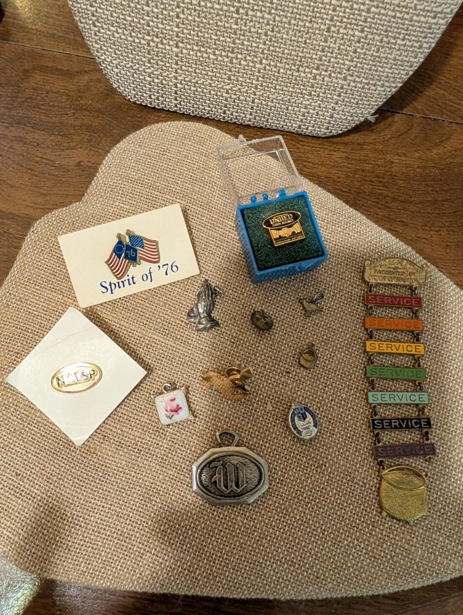 Nice collection of pins and pendants typewriter pin United farm agency pen NAESP pin national association of elementary school principals membership lapel pin praying hands charm, vintage little chicken charm, vintage pot of gold charm, cross pin was screw back, Sarah Coventry galloping horse lapel pin gold toned, pretty porcelain Rose pendant, Spirit of 76 pin, vintage order of the rainbow for girls merit service award pin broken pot of gold.