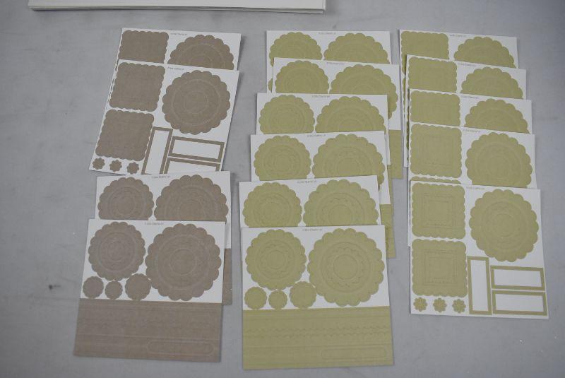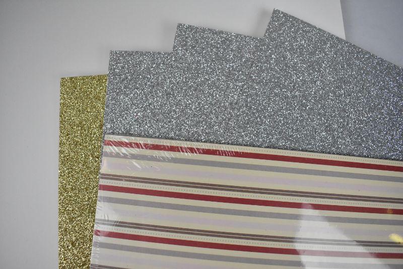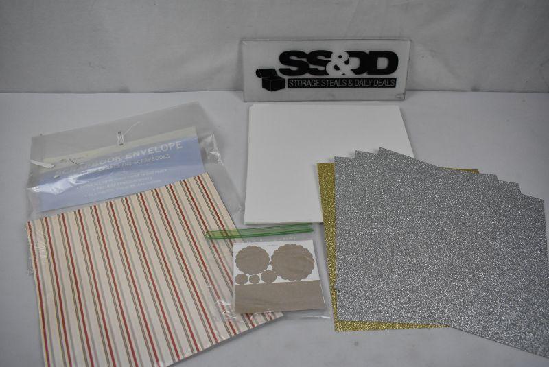 Misc Scrapbook Lot: Scrapbook Envelope, Cream Cardstock 12x12 (qty 40+), 3 Silver Glitter, 1 Gold Glitter. SU! Paper pack, sealed but bent, SU! Stickers, 15 small sheets open package