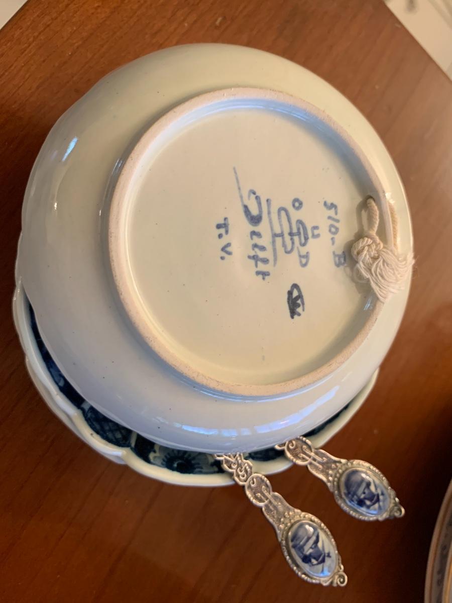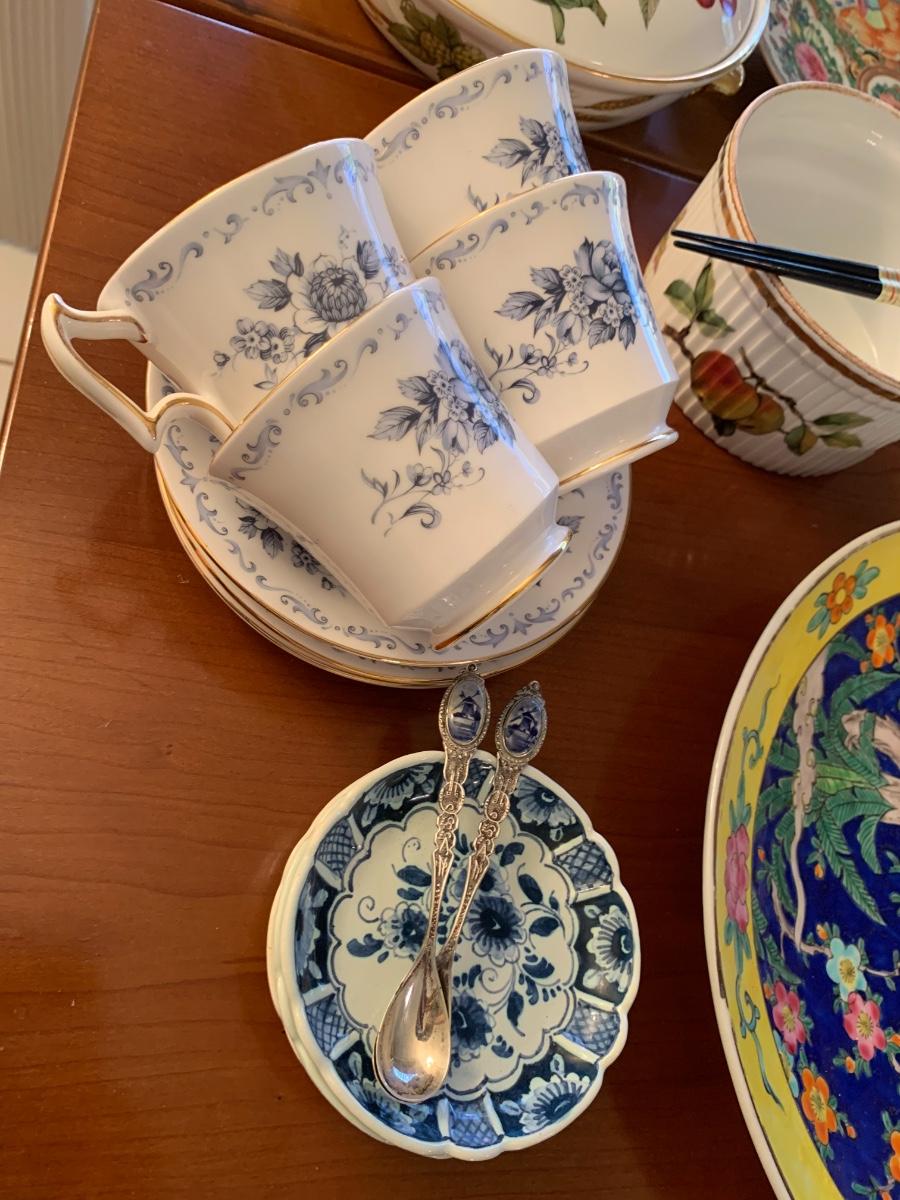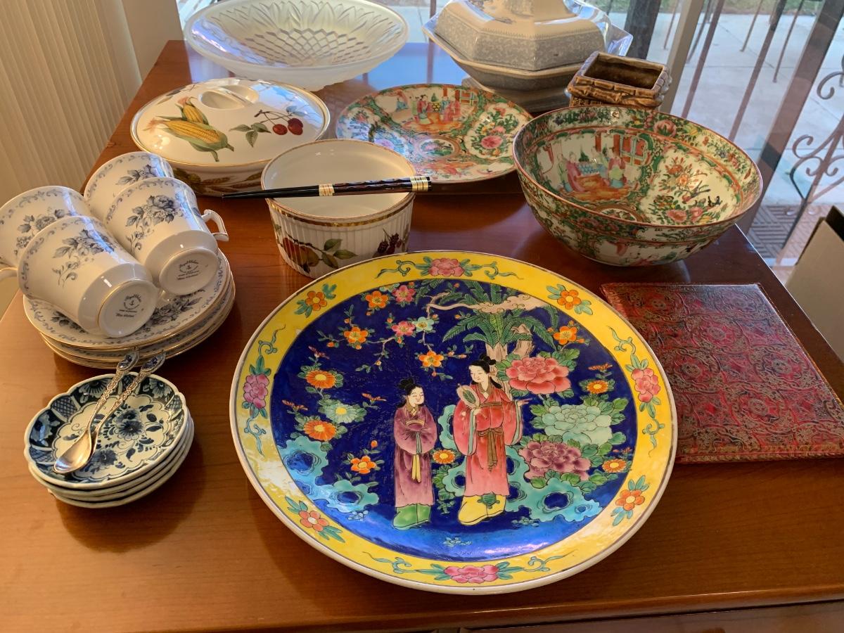Lot of misc dishes and serving ware including platter from Japan, Oriental bowl and plate, smell Delft saucers and 2 collectors spoons, Ironstone and glass.