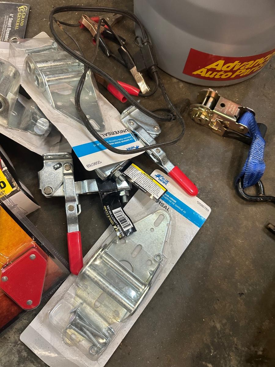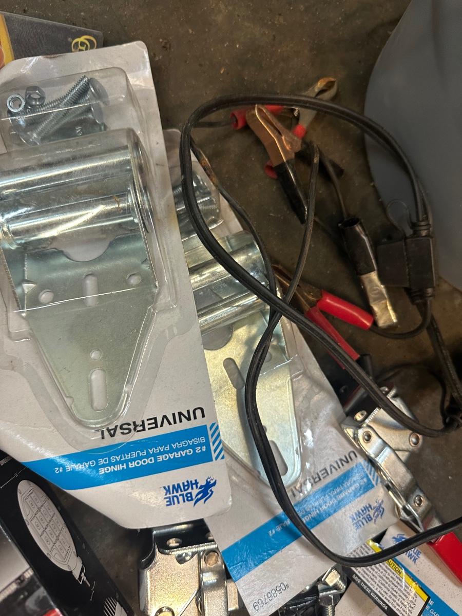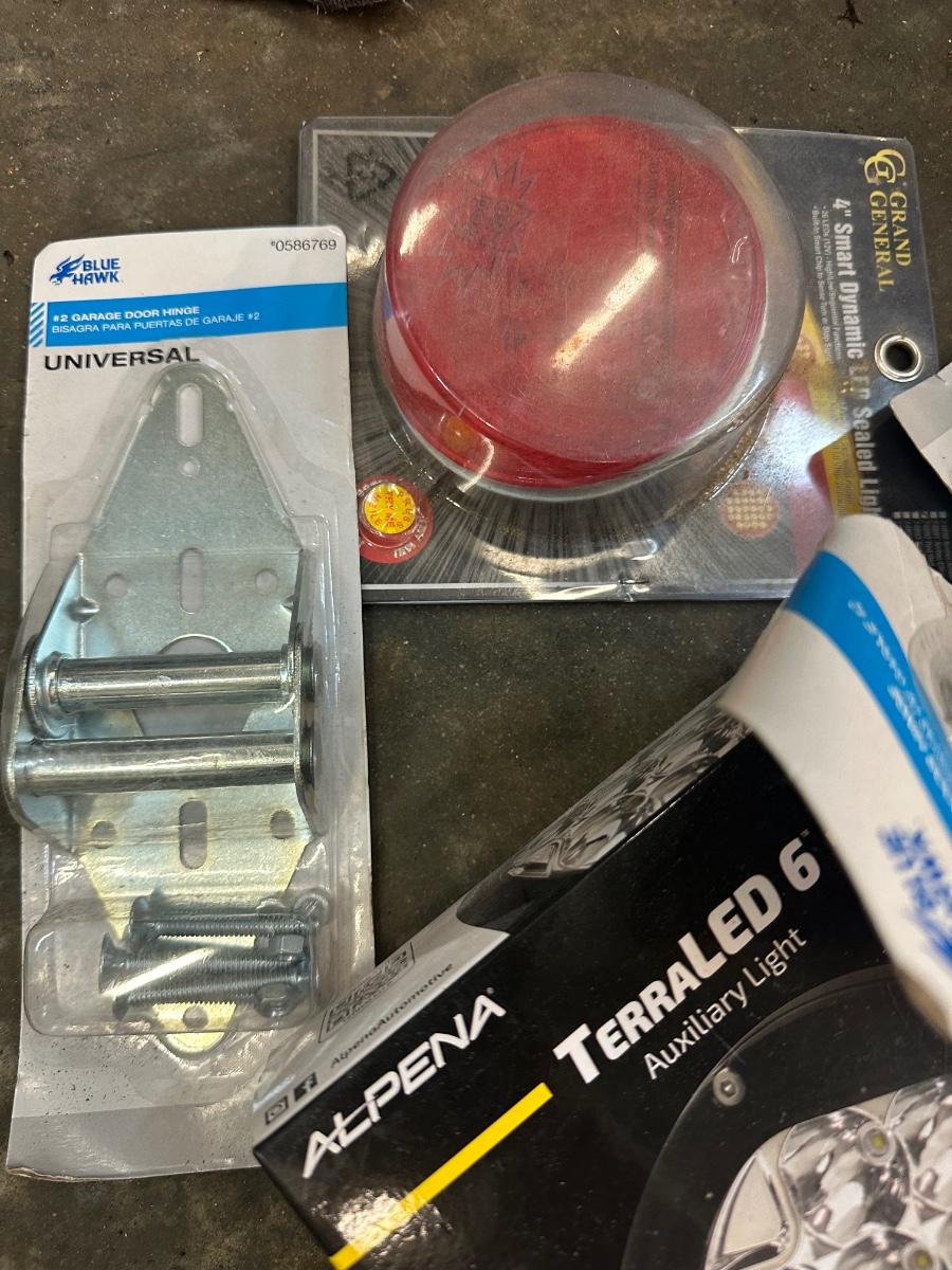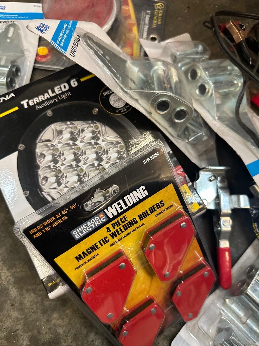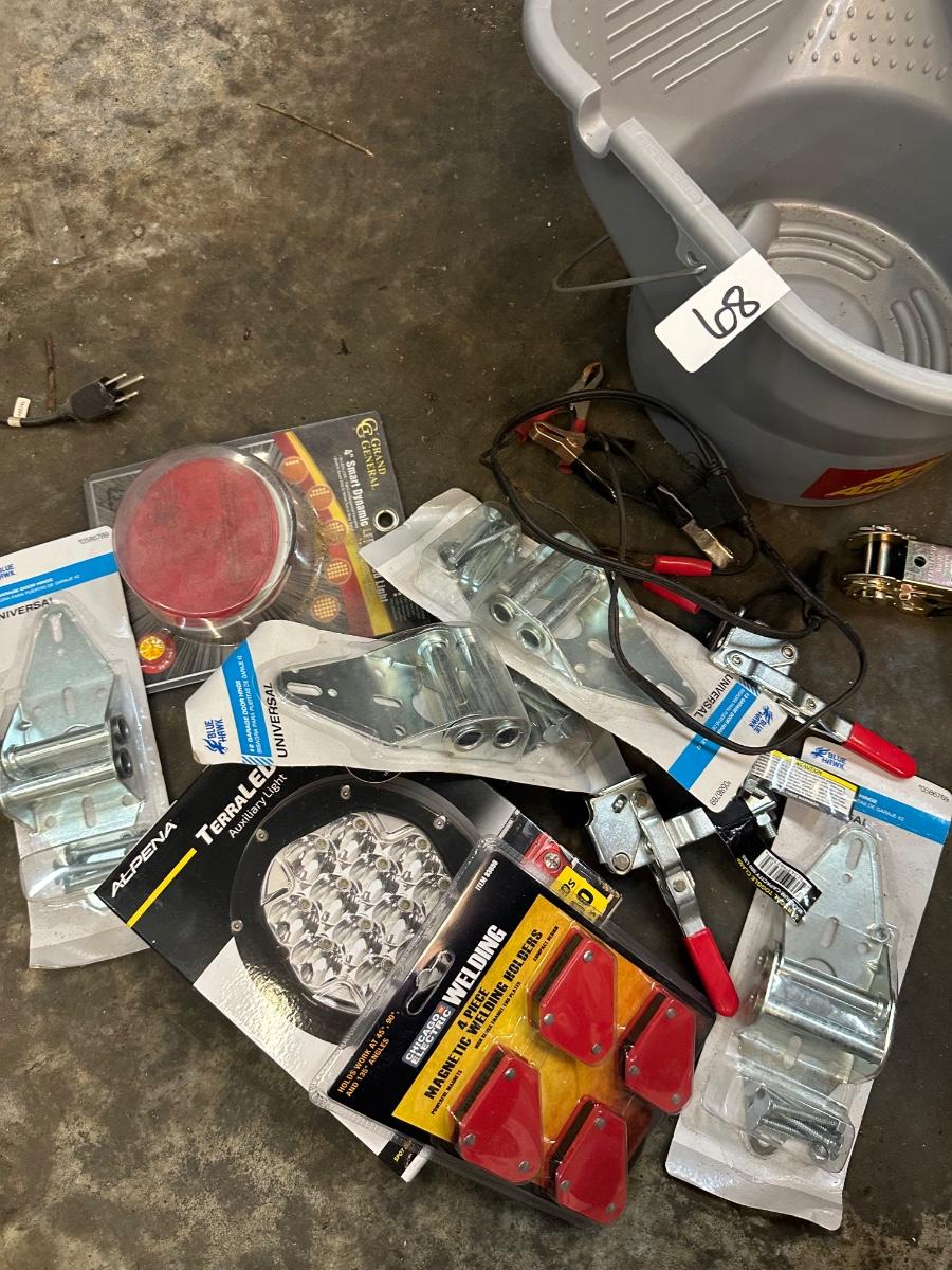 MISC SHOP LOT INCLUDES GARAGE DOOR HINGES, MAGNETIC WELDING HOLDERS, AUXILLARY LIGHTS, AND BCKET