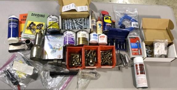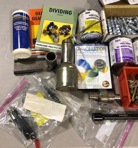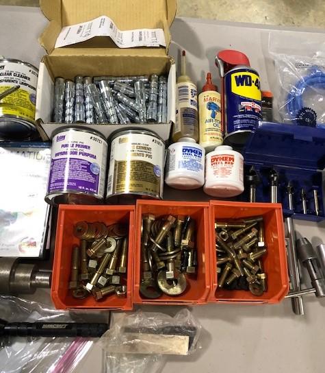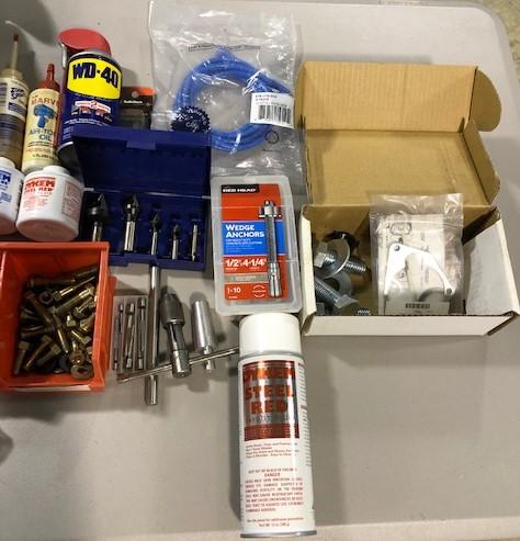 Cat 6 patch cable, WD40, air tool oiler, DVDs, books, layout fluid, PVC cement, wedge anchors & more. Some items are used