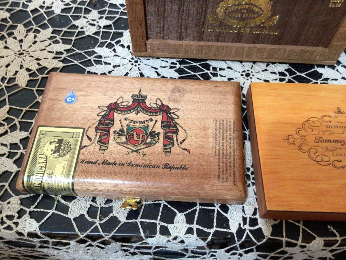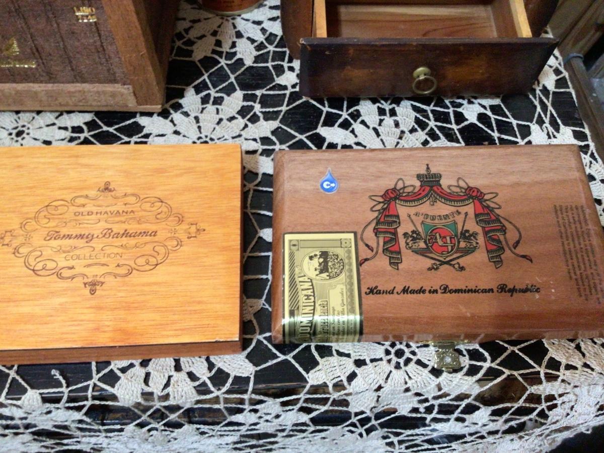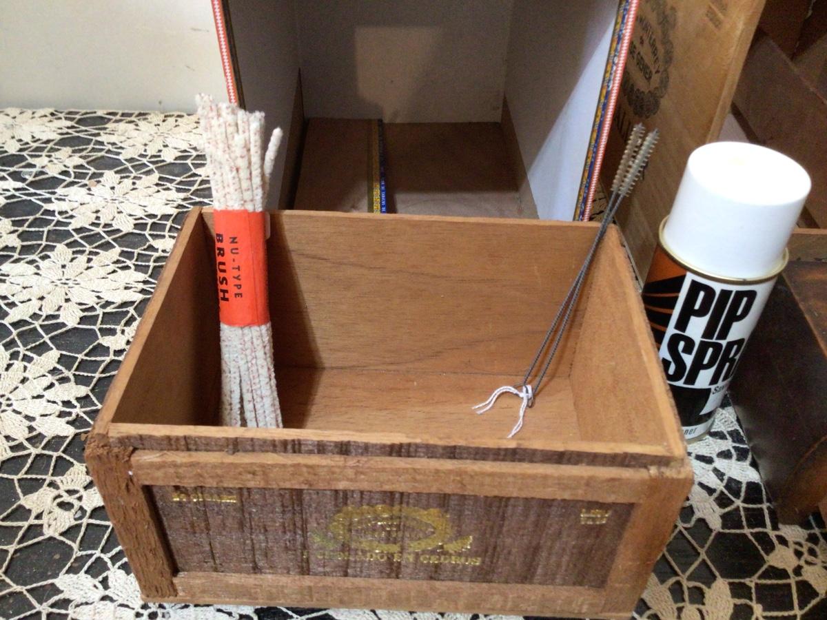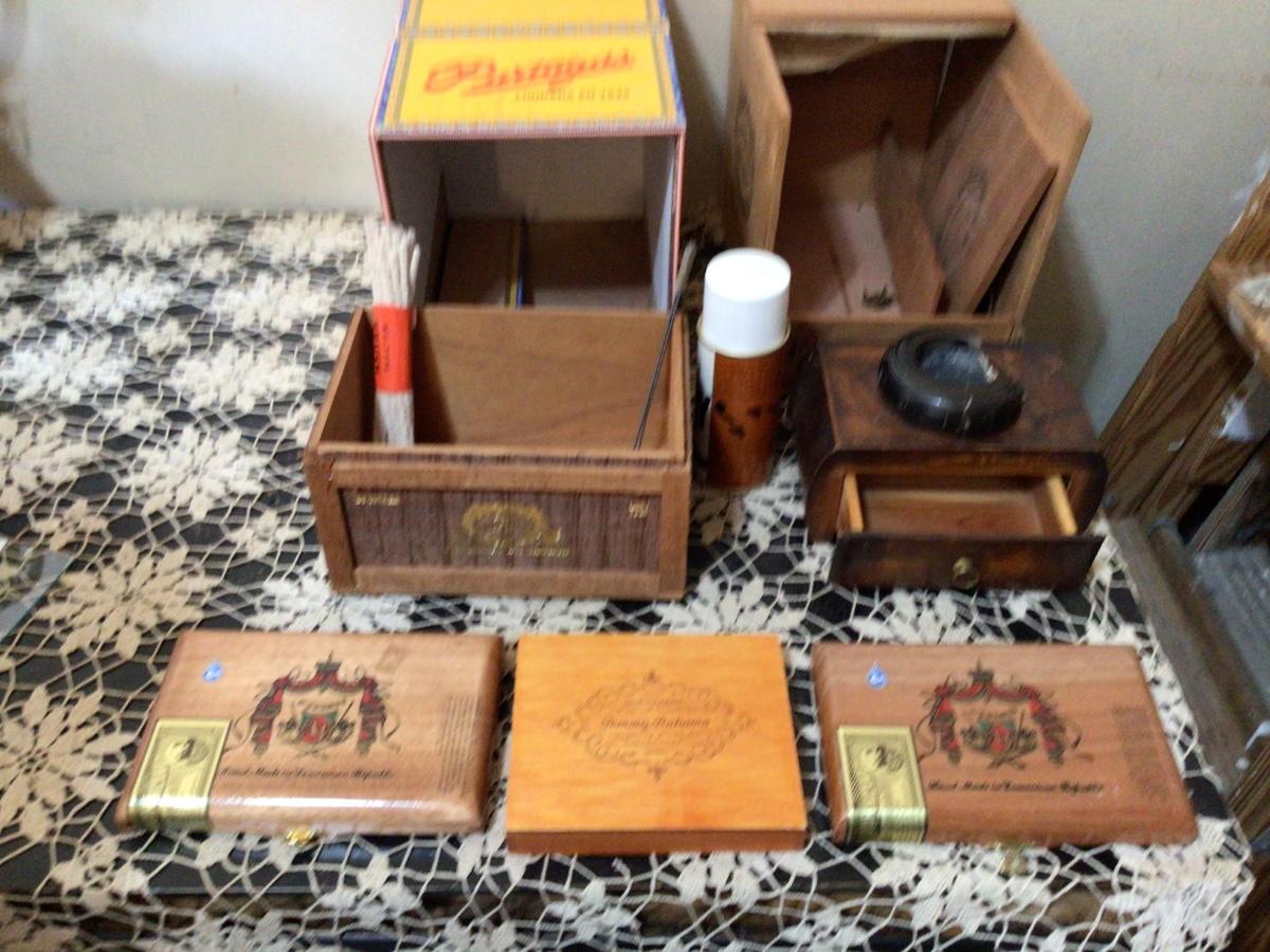 You get 3 wood cigar boxes with lids, large cardboard cigar boxes, large woodcigar box, wood Box with draw, pipe cleaners, spray.