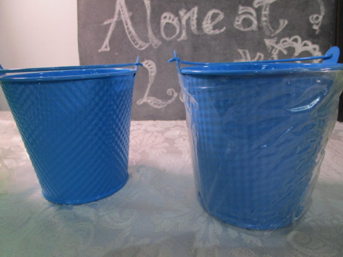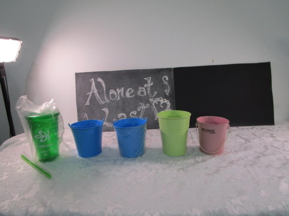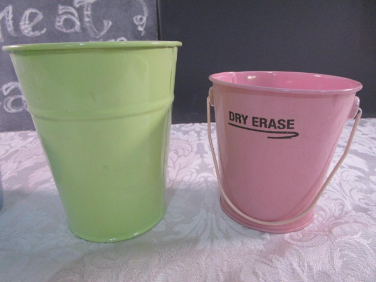 2- chalk boards 11"x17",new 4 tin buckets, One new water cup