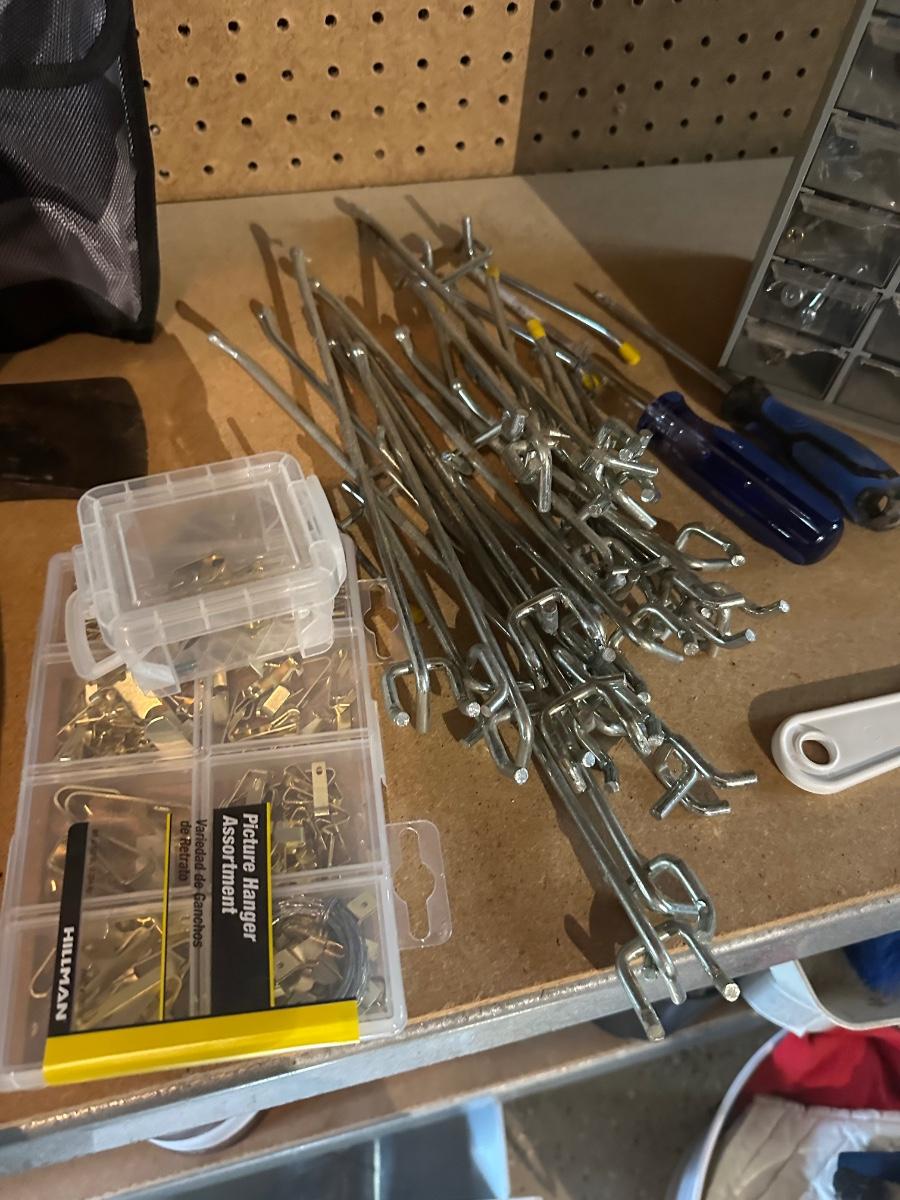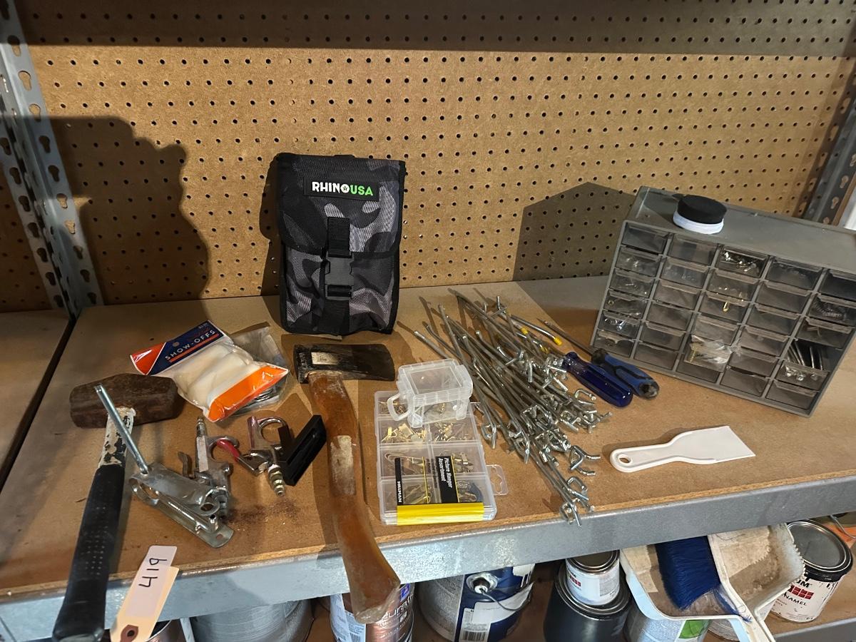 MISC TOOLS, SM SLEDGEHAMMER, HATCHET, FOLDING SMALL SHOVEL, SCREWDRIVERS, PEG BRACKETS, PICTURE HANGING & MORE!
