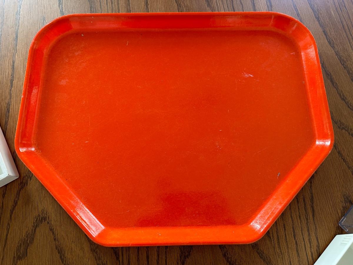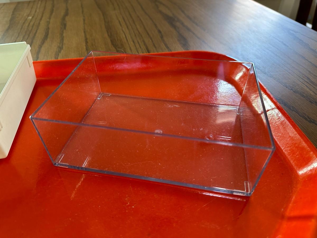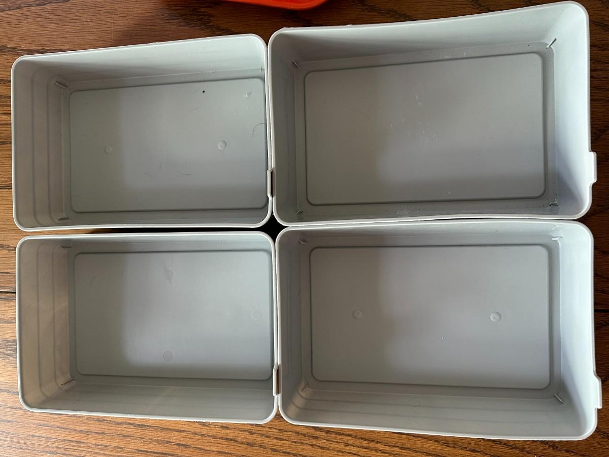 White Tray 18.5" x 12.75", 4 Gray Bins 10" x 7", 4 Navy Bins 7" x 5", 1 Aqua Bin 10" x 3", Orange Lunchroom Tray, small white bin, small clear bin.