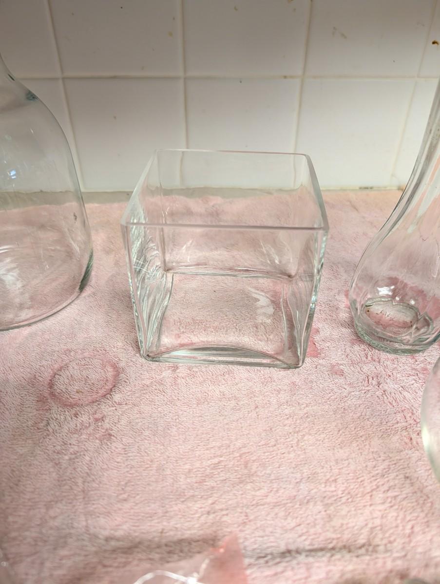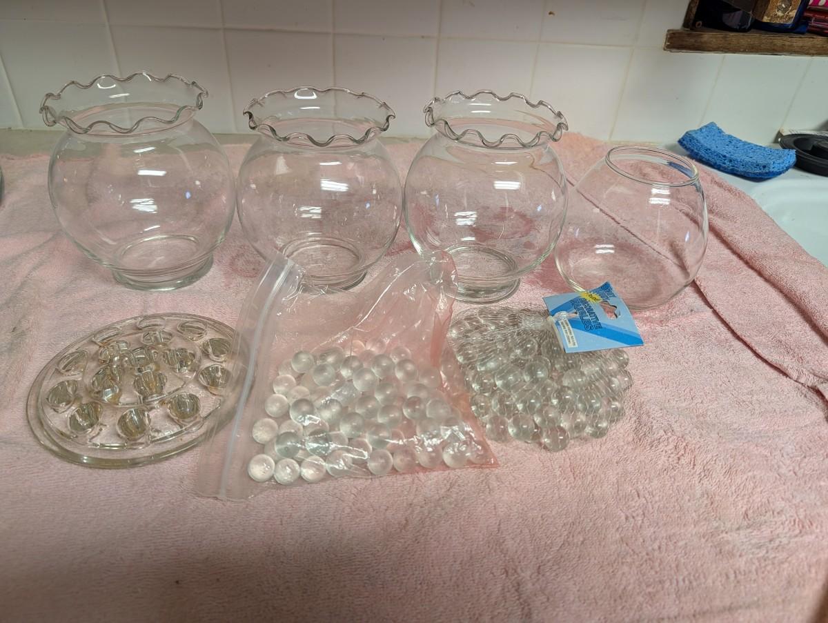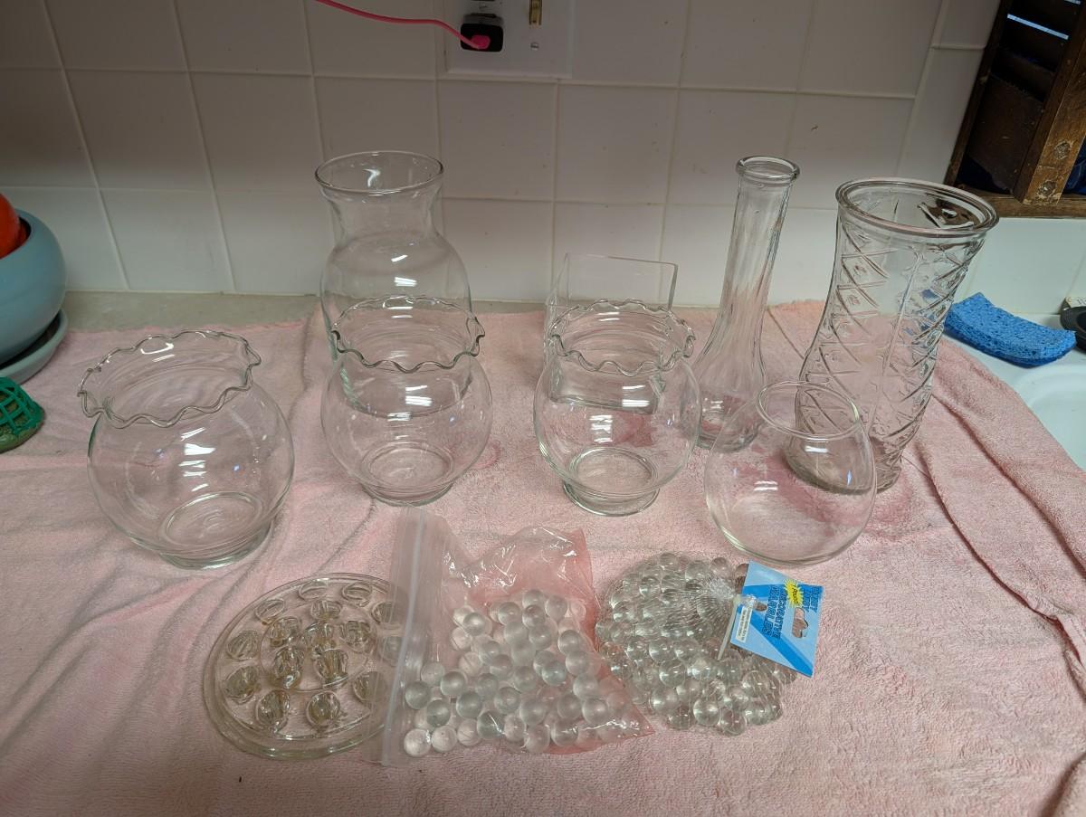 Mixture of different sizes of vases, marbles for the round ones, glass flower frog.