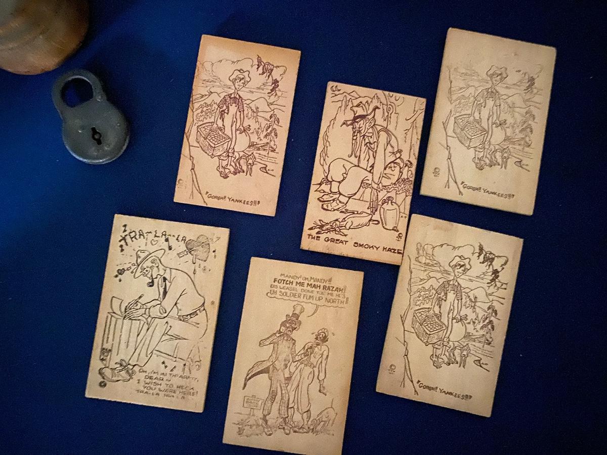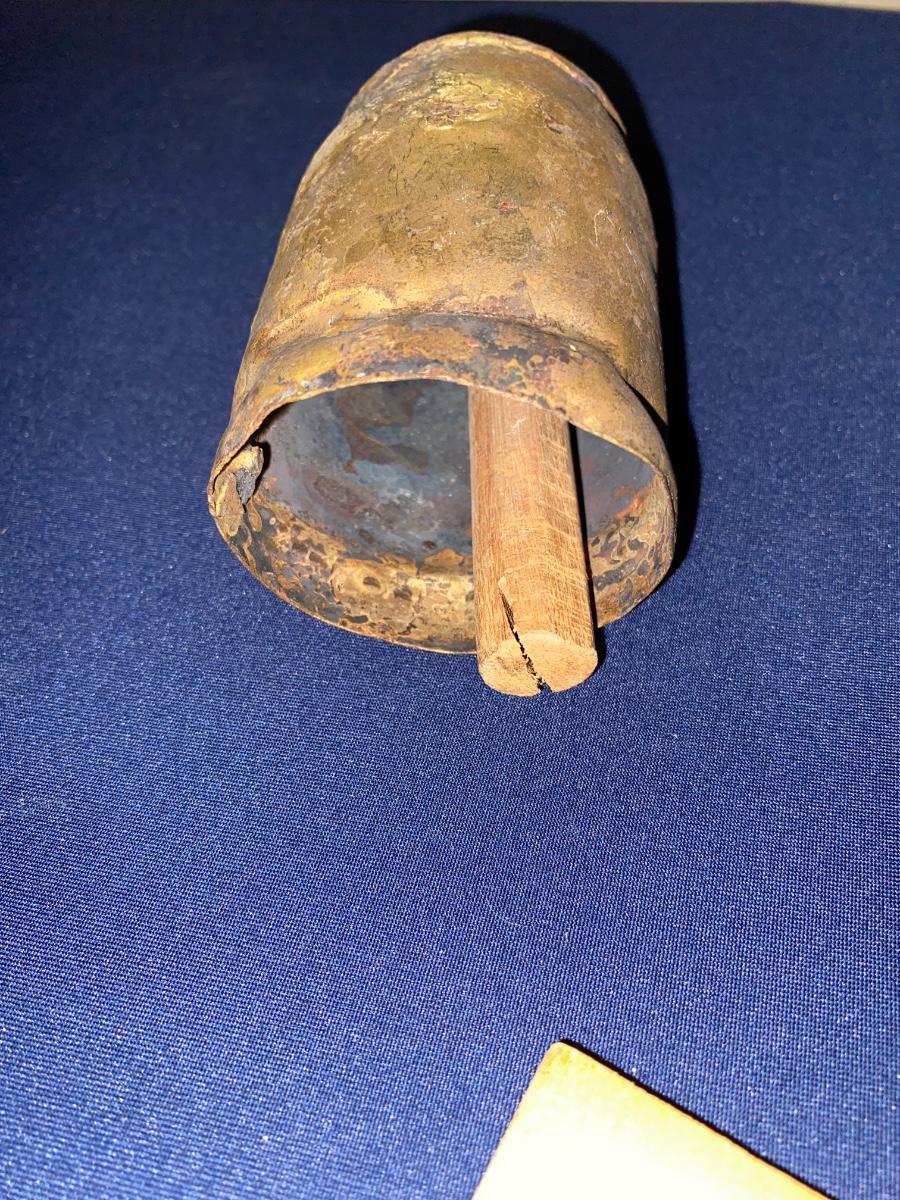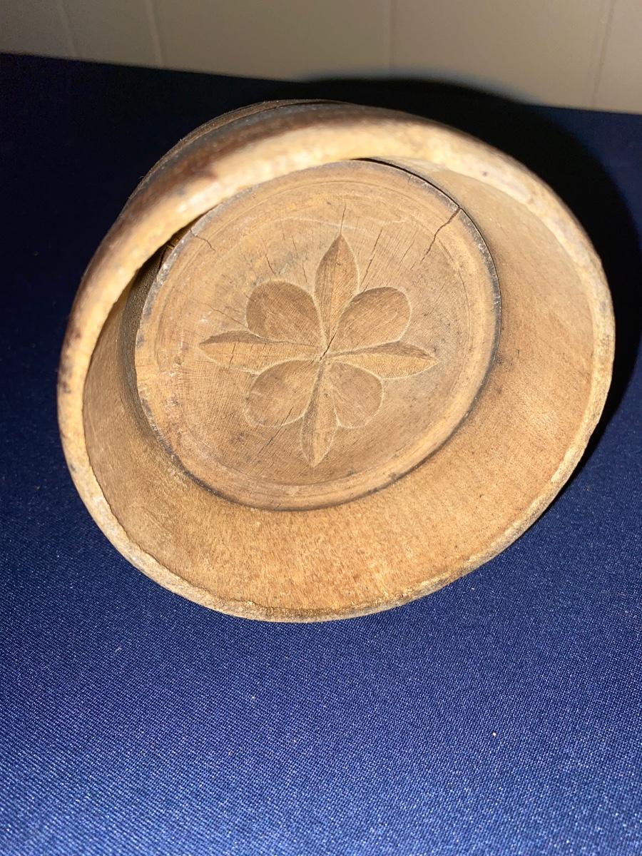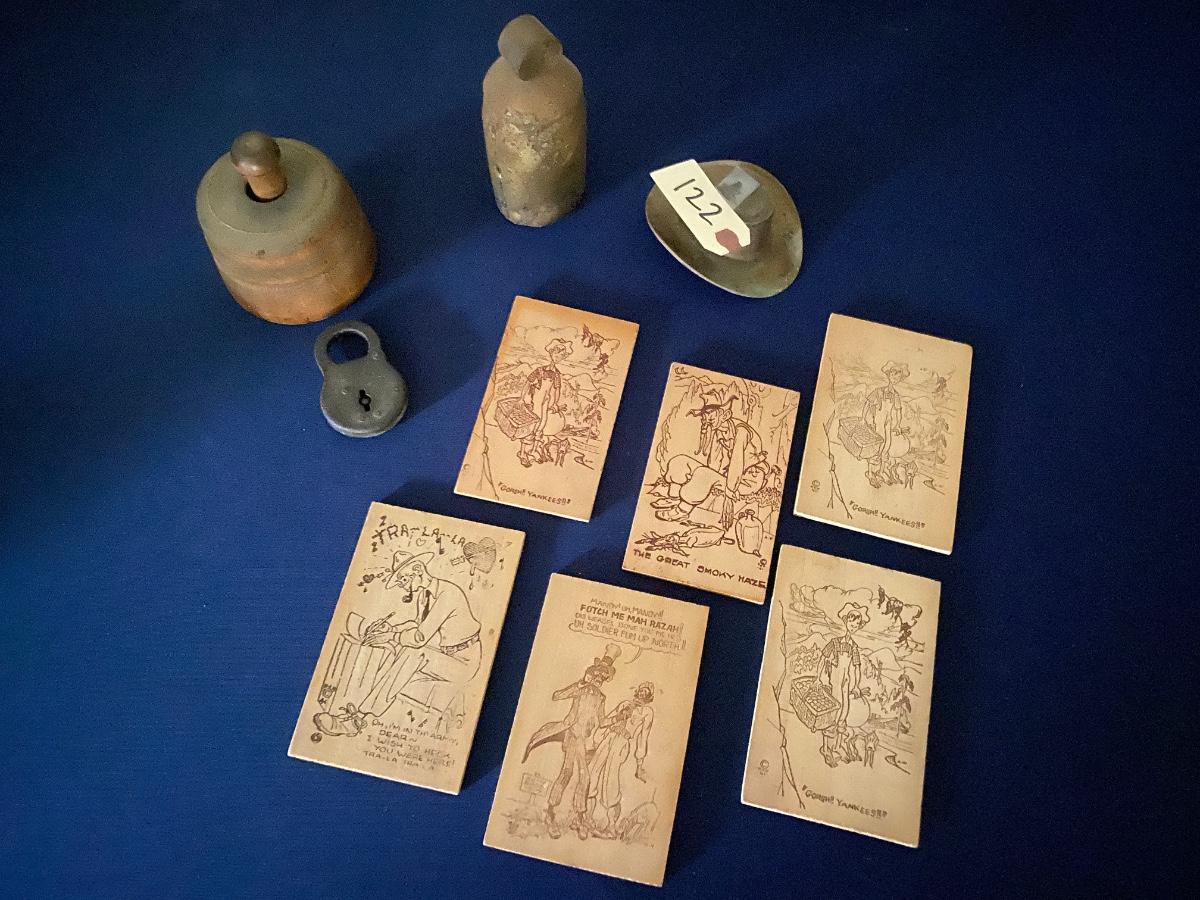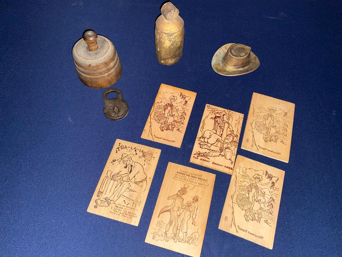 Butter Mold, Pad Lock, Brass Bell, Brass Cowboy Hat, and Wooden Post Cards As Pictured