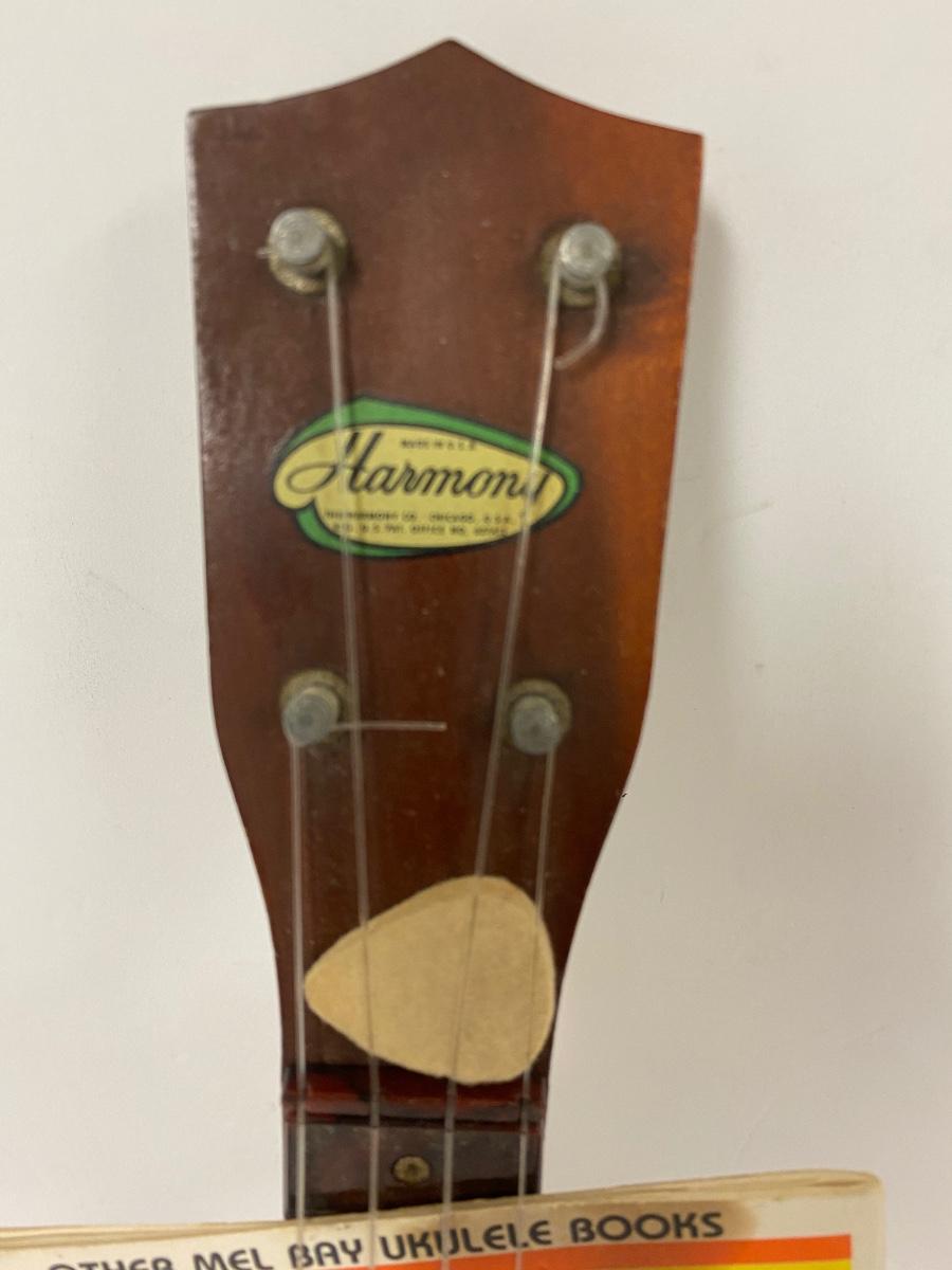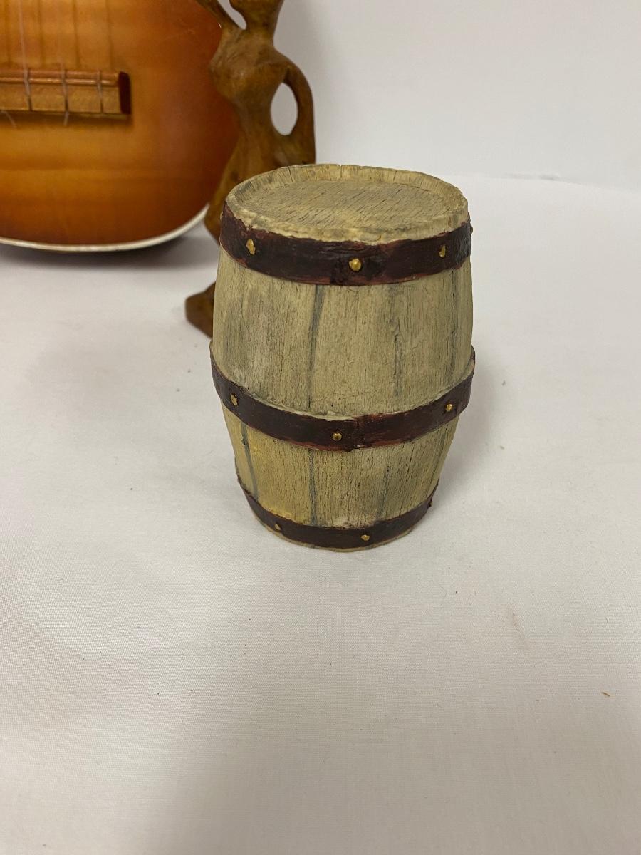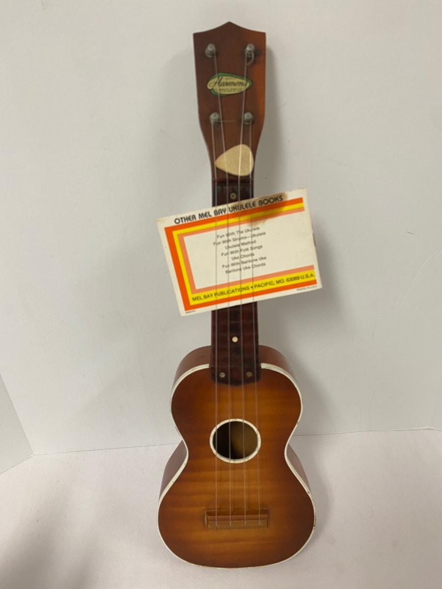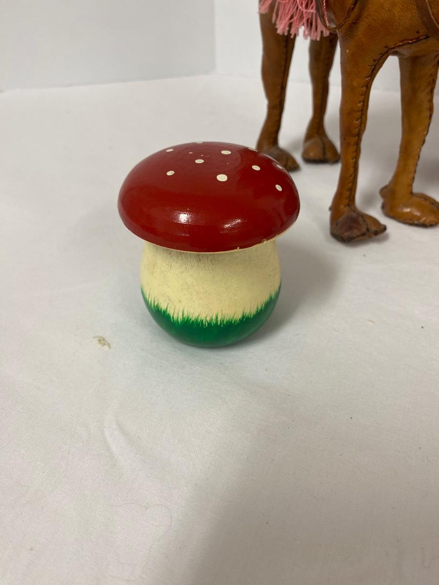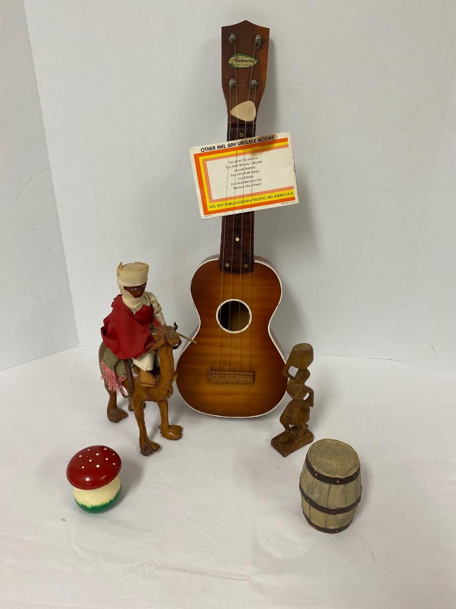 Misc. Vintage Collectible Lot, Vintage mushroom Tiddlywinks Game, Leather Camel with Rider, Wooden Statue, Harmony Ukulele,