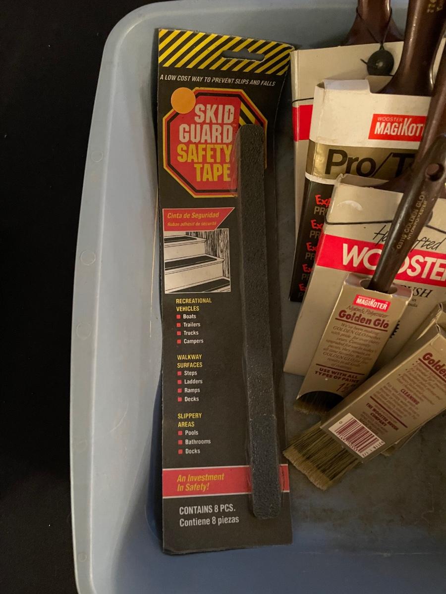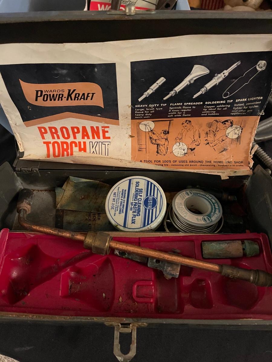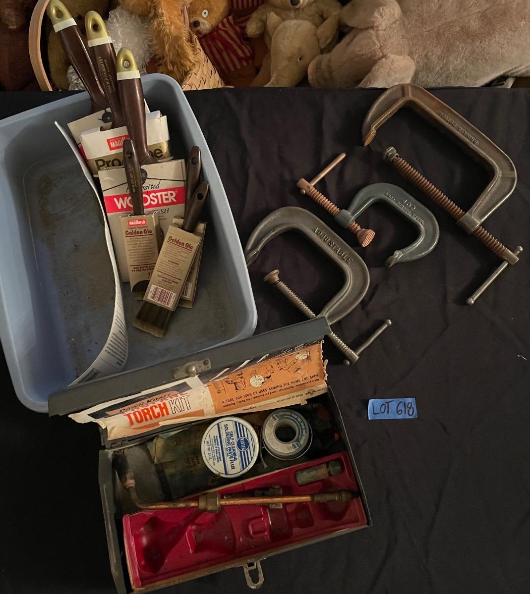 (3) Vintage heavy metal clamps, Wards Power - Kratt propane torch kit, (3) Large size brand new paint brushes, (3) small new paint brushes, skid guard safety tape.