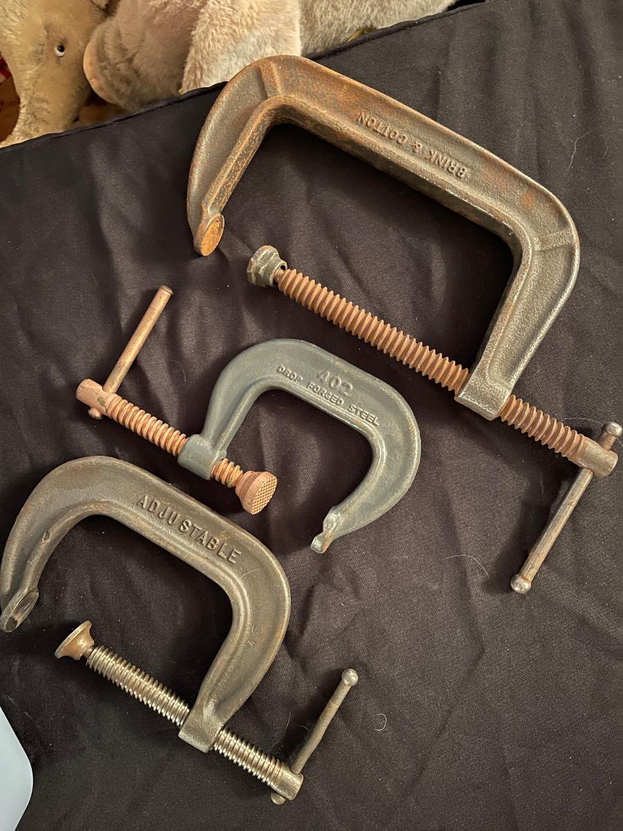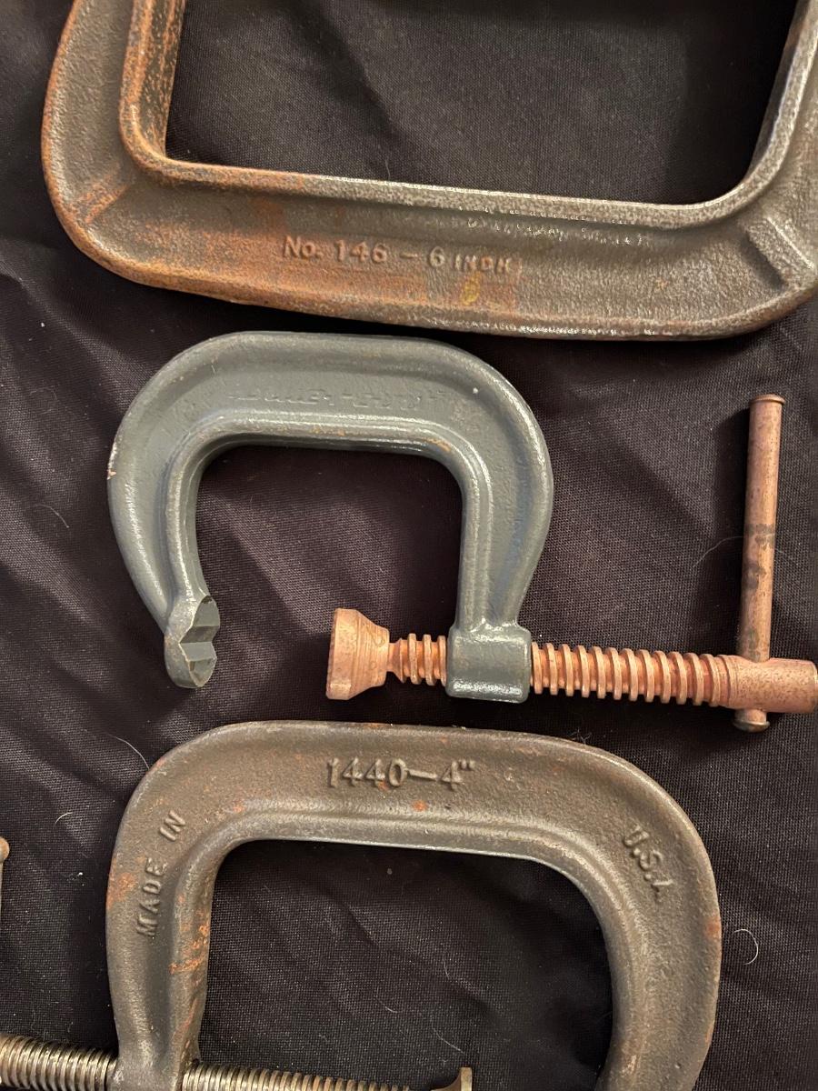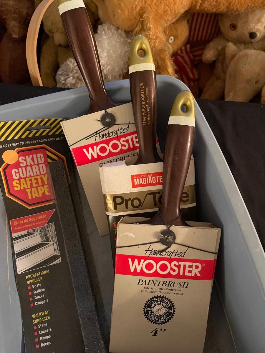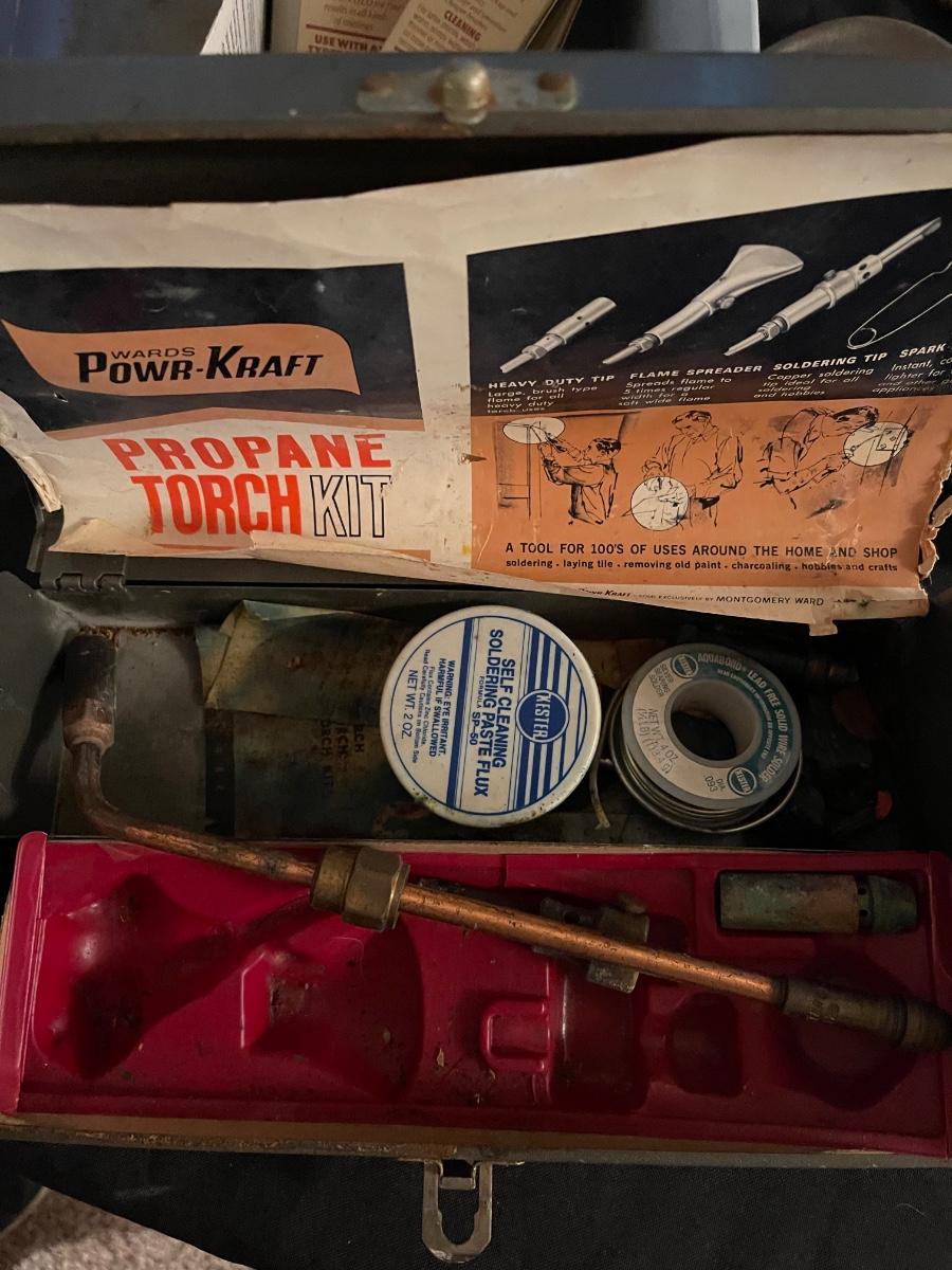(3) Vintage heavy metal clamps, Wards Power - Kratt propane torch kit, (3) Large size brand new paint brushes, (3) small new paint brushes, skid guard safety tape.