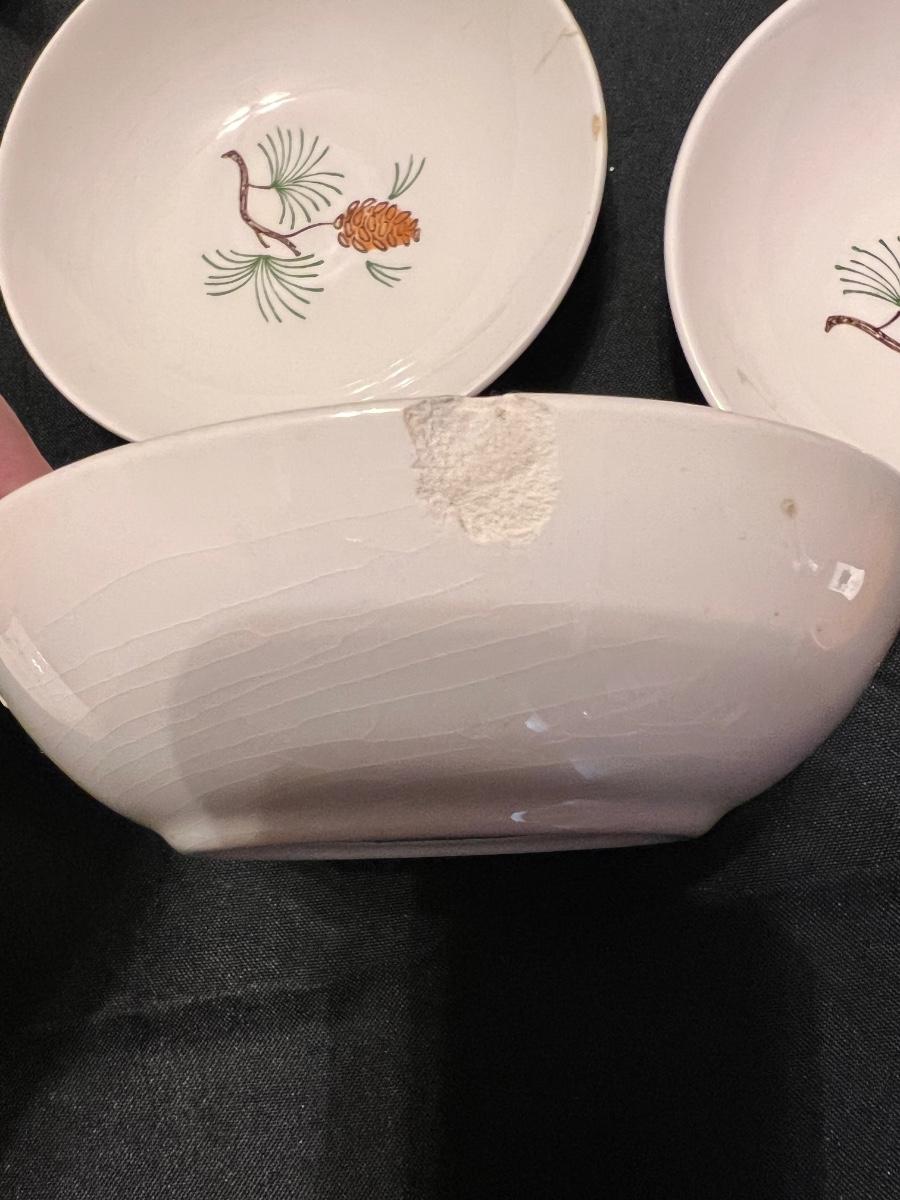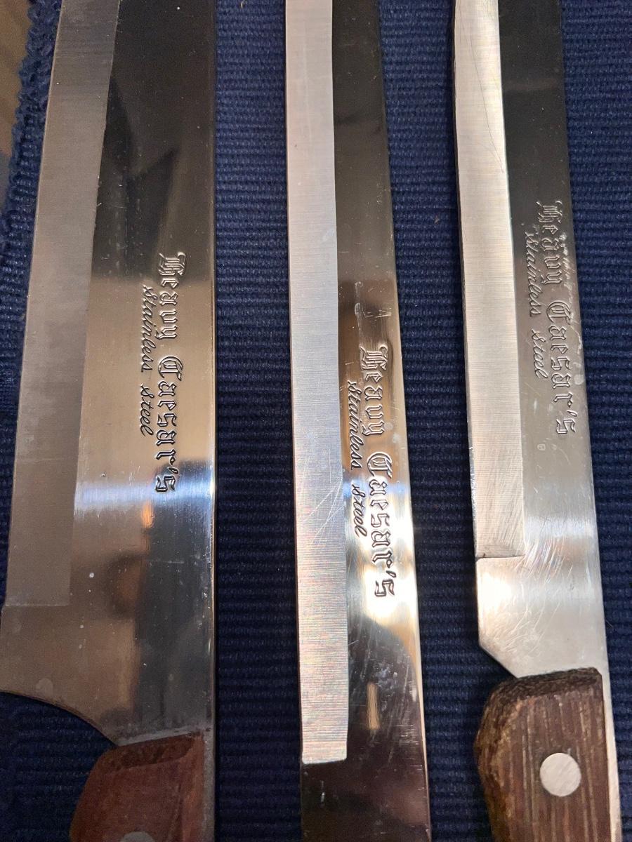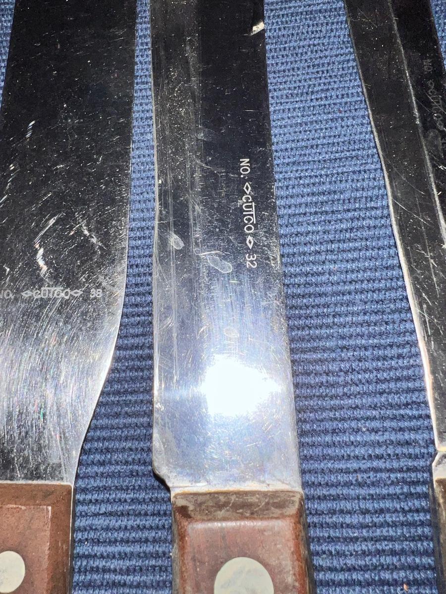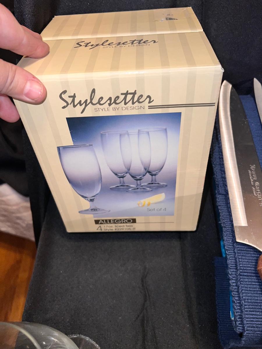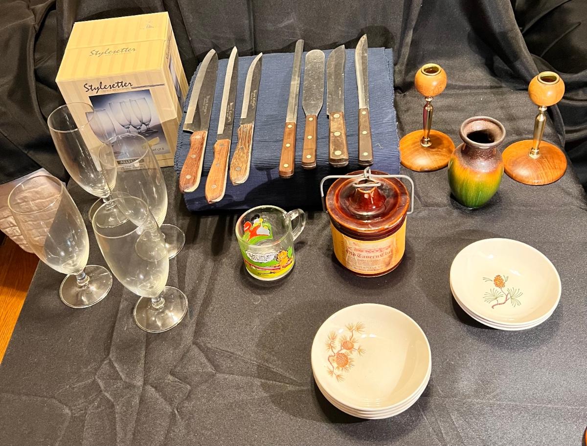 Cutco knives are the 4 on the right, the set of 3 on the left is Heavy Caesar’s. The ice tea glasses will come in a set of 16 in boxes. Candlestick holders are Scandinavian Myrtlewood. Garfield cup. Small pine cone bowls. Some have some chips. See in pictures.