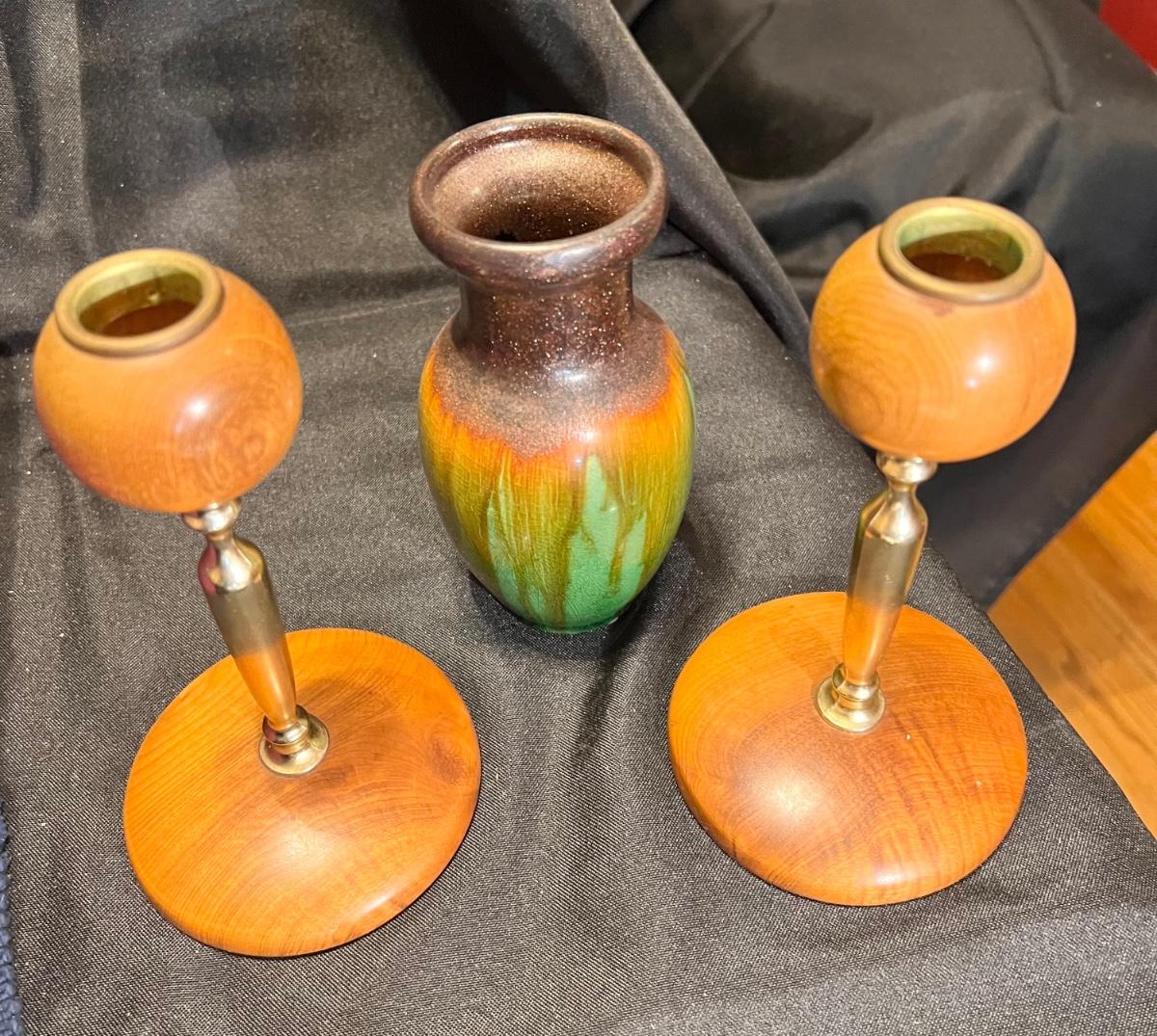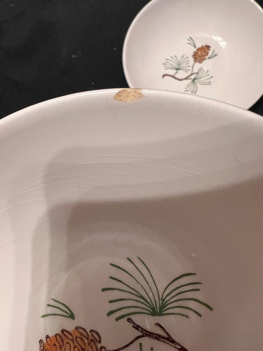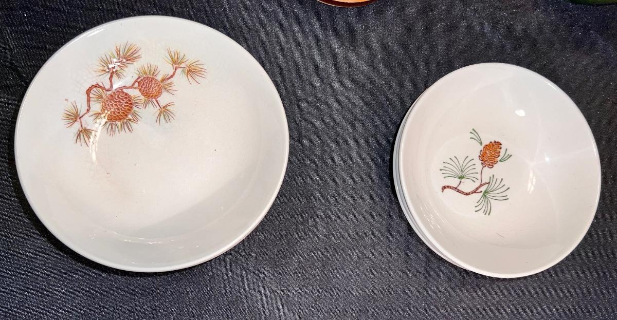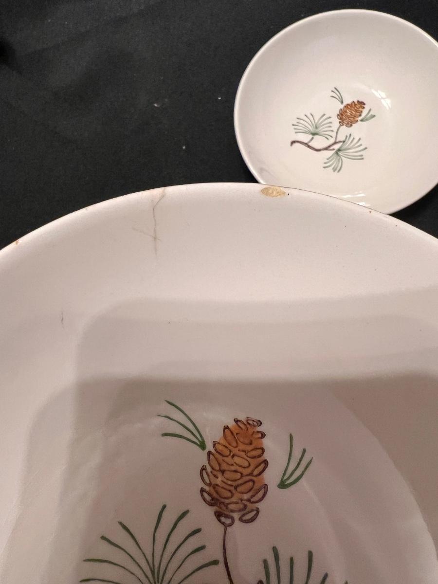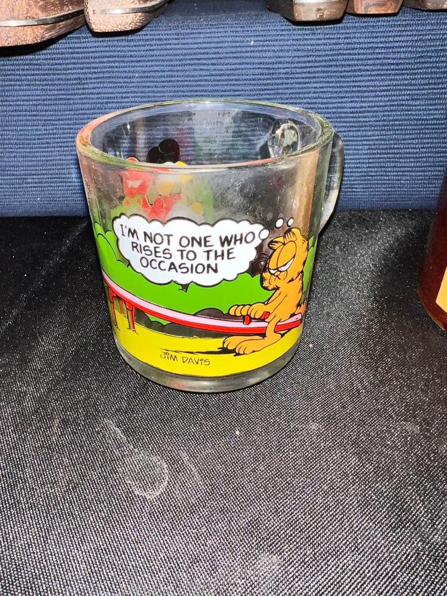 Cutco knives are the 4 on the right, the set of 3 on the left is Heavy Caesar’s. The ice tea glasses will come in a set of 16 in boxes. Candlestick holders are Scandinavian Myrtlewood. Garfield cup. Small pine cone bowls. Some have some chips. See in pictures.