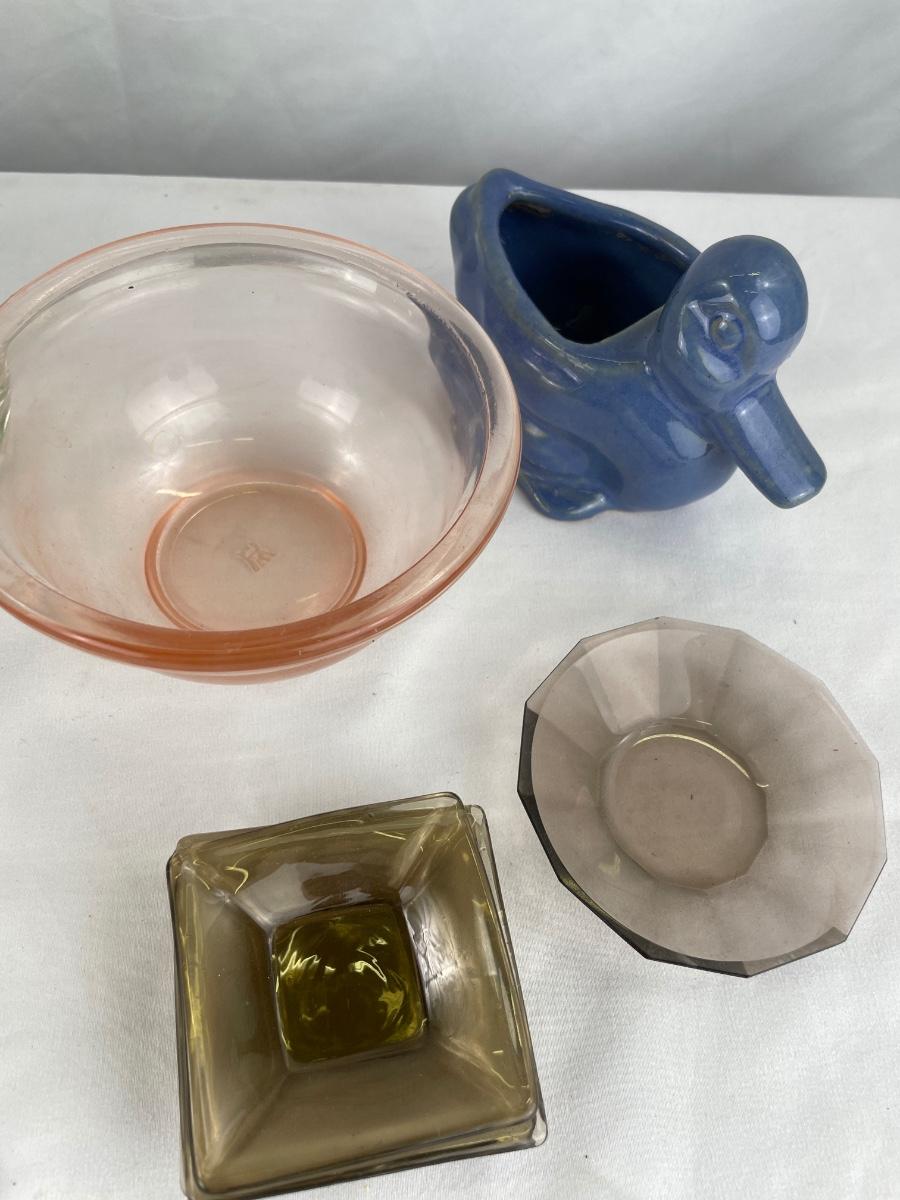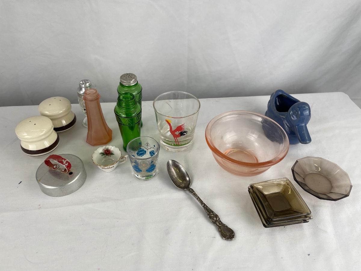 Salt and pepper, shakers, small pink glass bowl, duck planter, and more