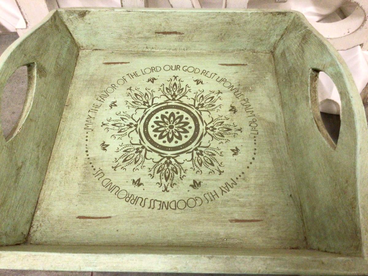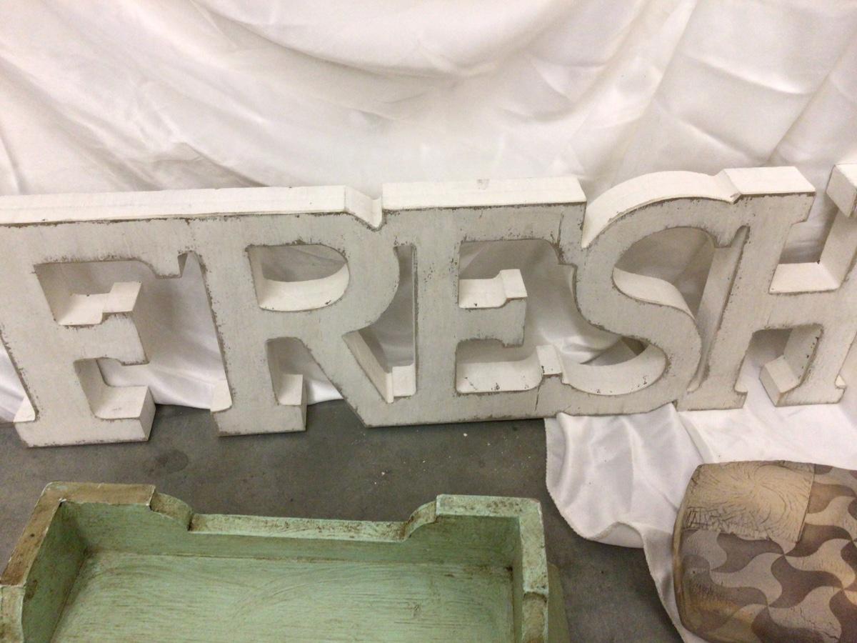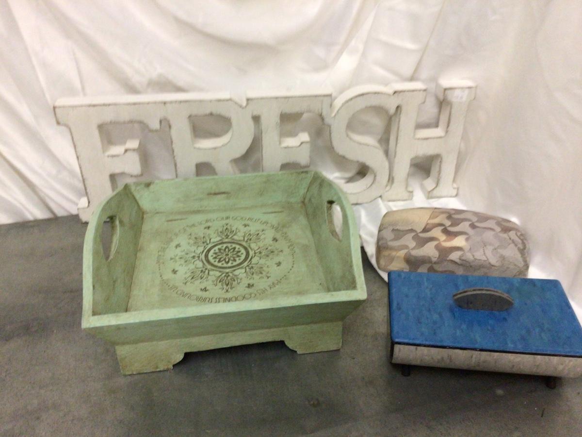 You get wood Fresh sign, wood square tray, decorative stone and neat resign covered dish.