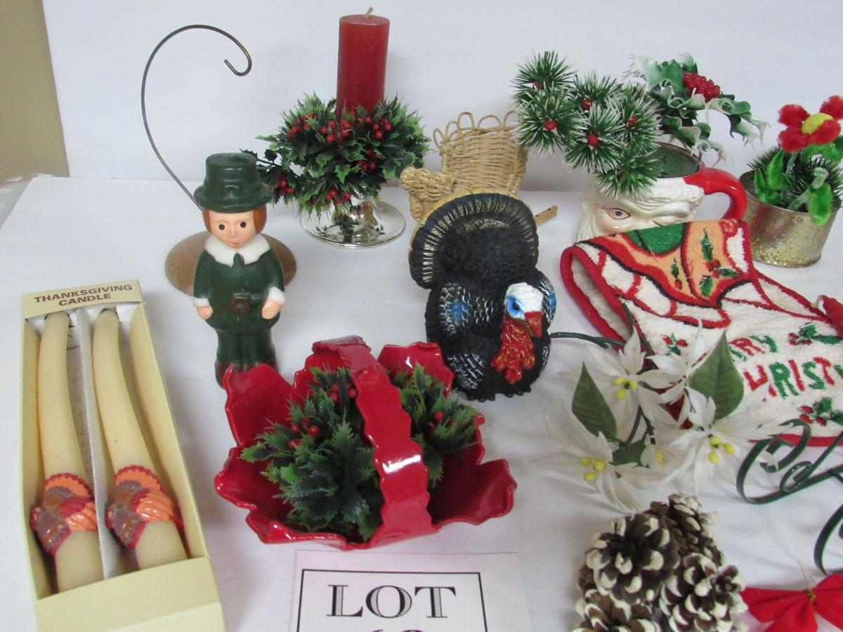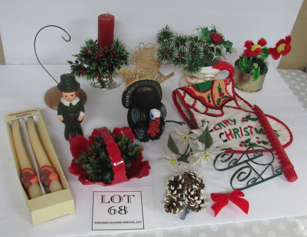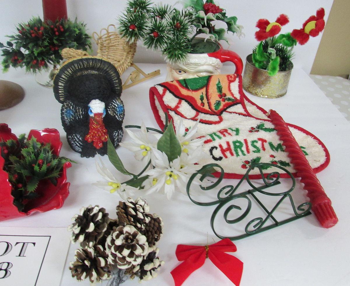 Thanksgiving and Christmas decor, rubber turkey, taper candles are warped, candles, greens, stocking, sleighs, pinecones. Used condition. A nice lot for repurposing or crafting.