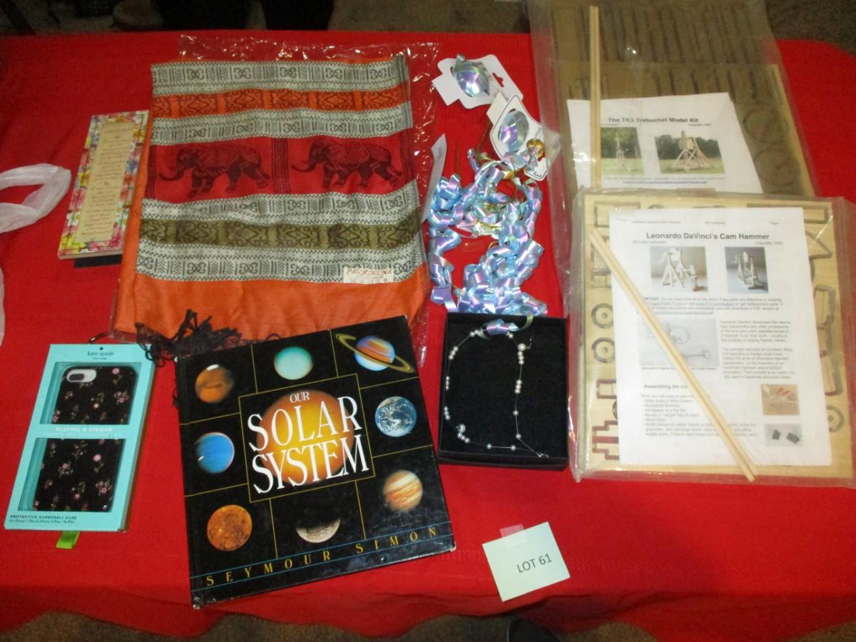 The TK3 Trebuchet Model Kit (may be incomplete). Kate Spade Phone Case, Necklace, Solar system book