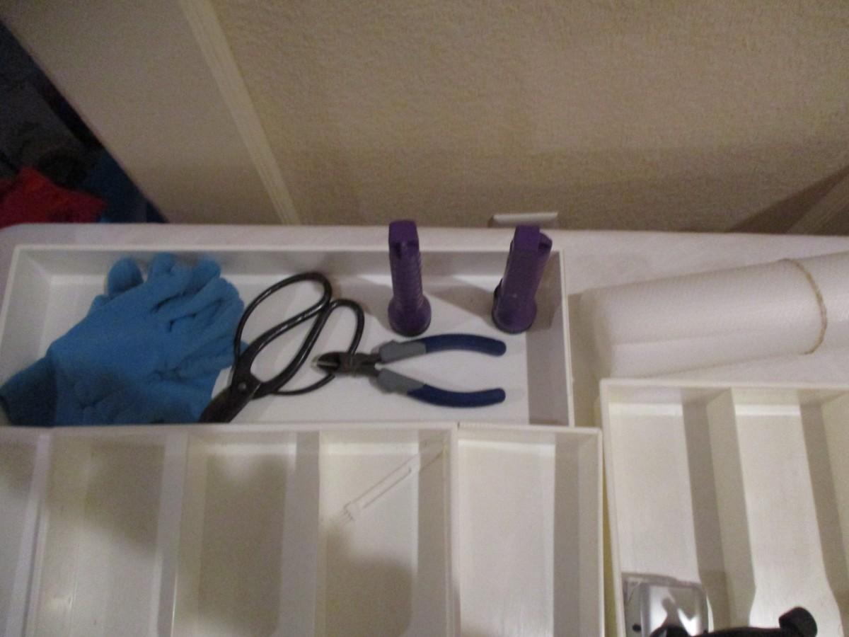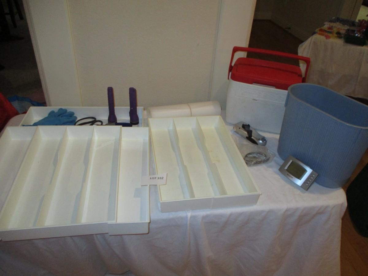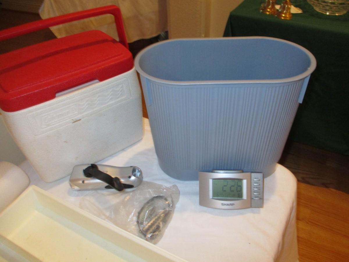 small cooler, wastebasket, flashlights, wind up charging hand light, plastic trays, garden gloves