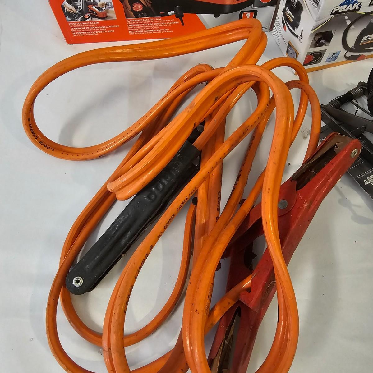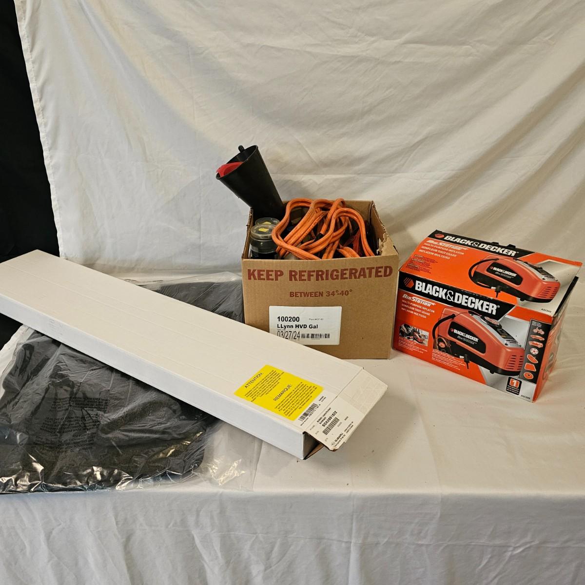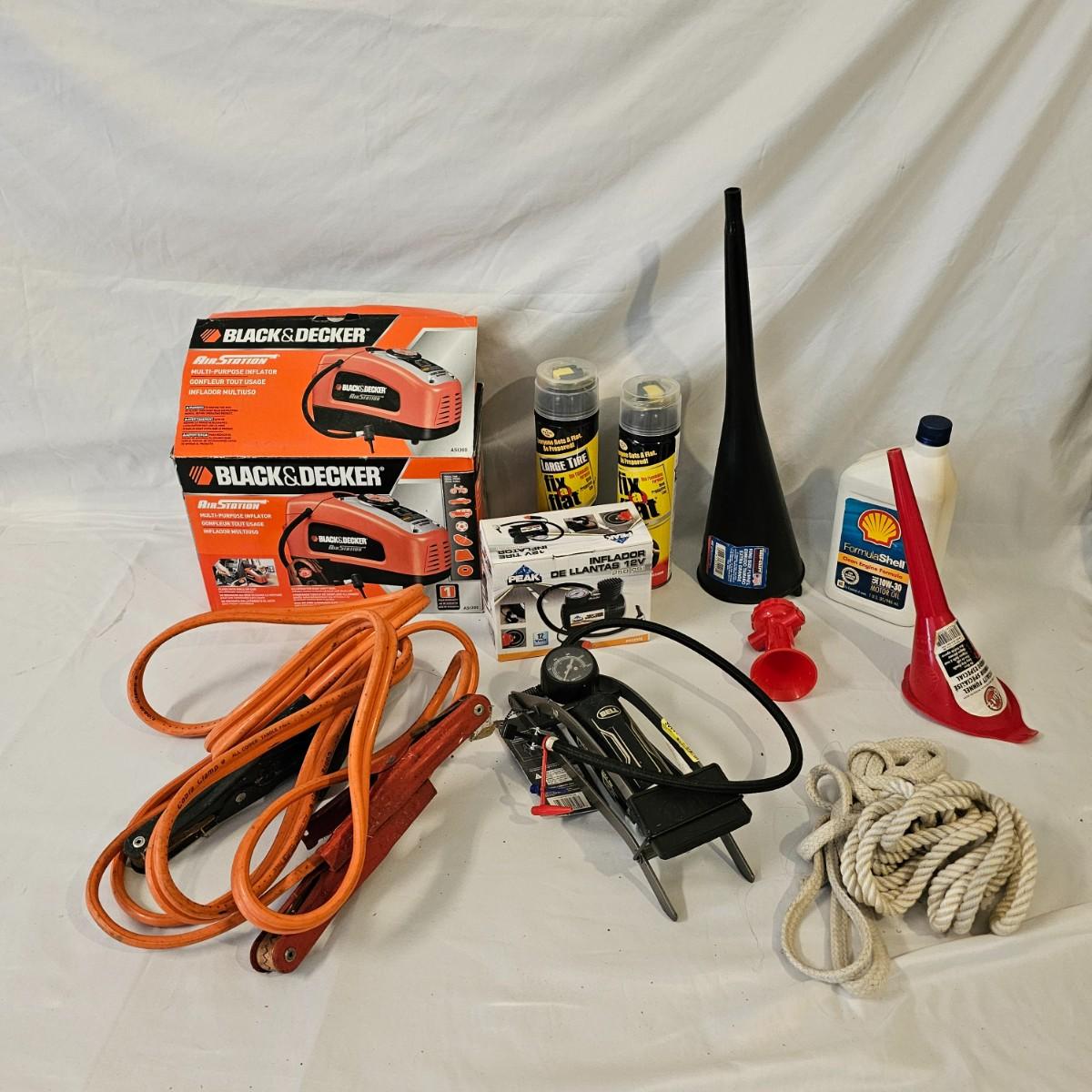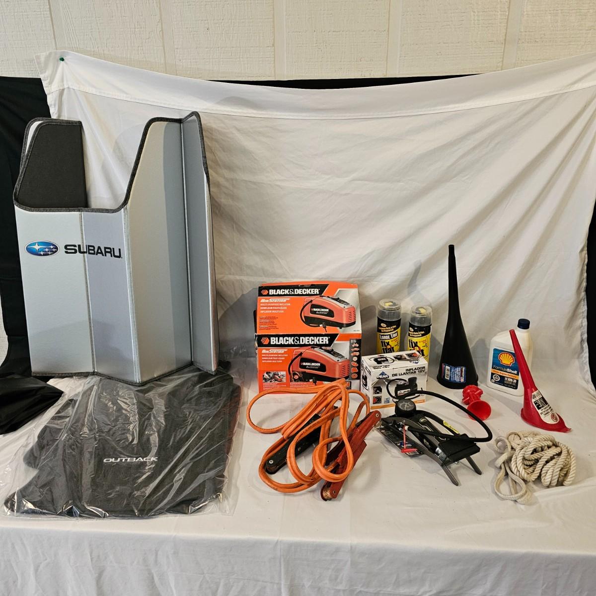 Assorted items for car care and more. Jumper cables, two cans fix a flat, some funnels, two different air compressors. Also some decor parts for Subaru Outback, floor mats and a sunshade, new in packages. Black & Decker Air Station compressor uses AC or DC. All plug in items powered on when plugged in. See photos for details. Local pickup only.