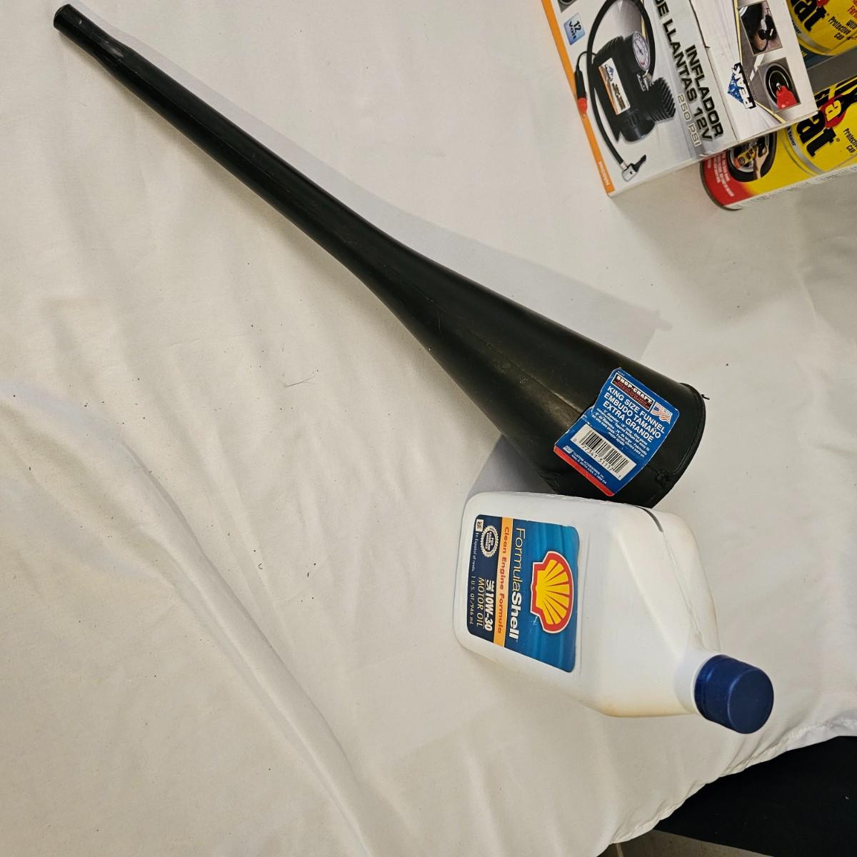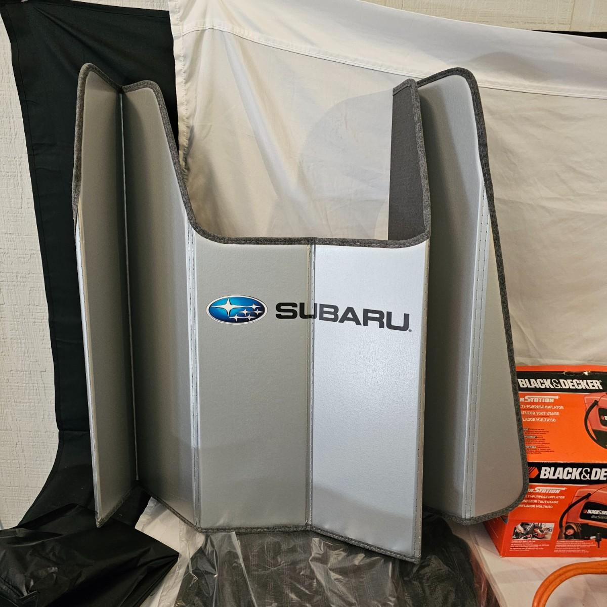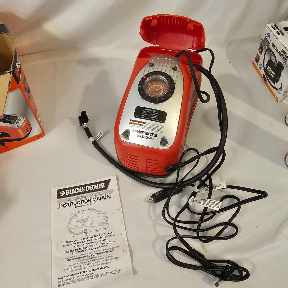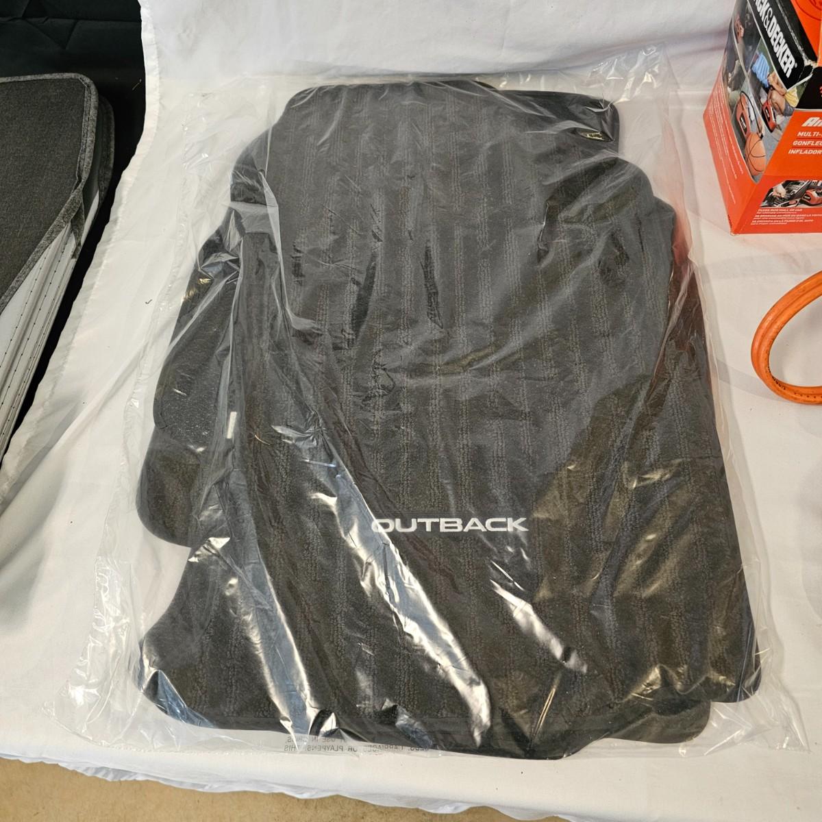 Assorted items for car care and more. Jumper cables, two cans fix a flat, some funnels, two different air compressors. Also some decor parts for Subaru Outback, floor mats and a sunshade, new in packages. Black & Decker Air Station compressor uses AC or DC. All plug in items powered on when plugged in. See photos for details. Local pickup only.