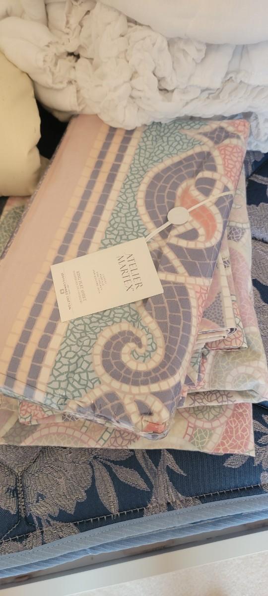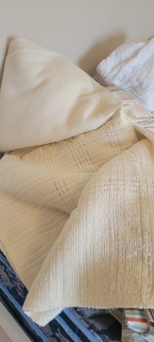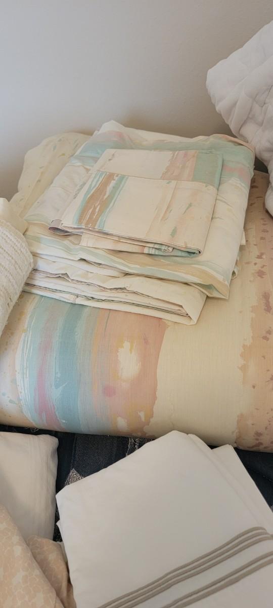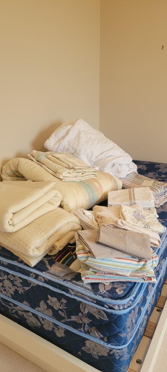 Ralph lauren blanket, twin comforter and sheets, atelier Martex king flat sheet, and miscellaneous pillowcases, mattress pads. Various sizes.