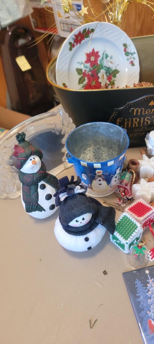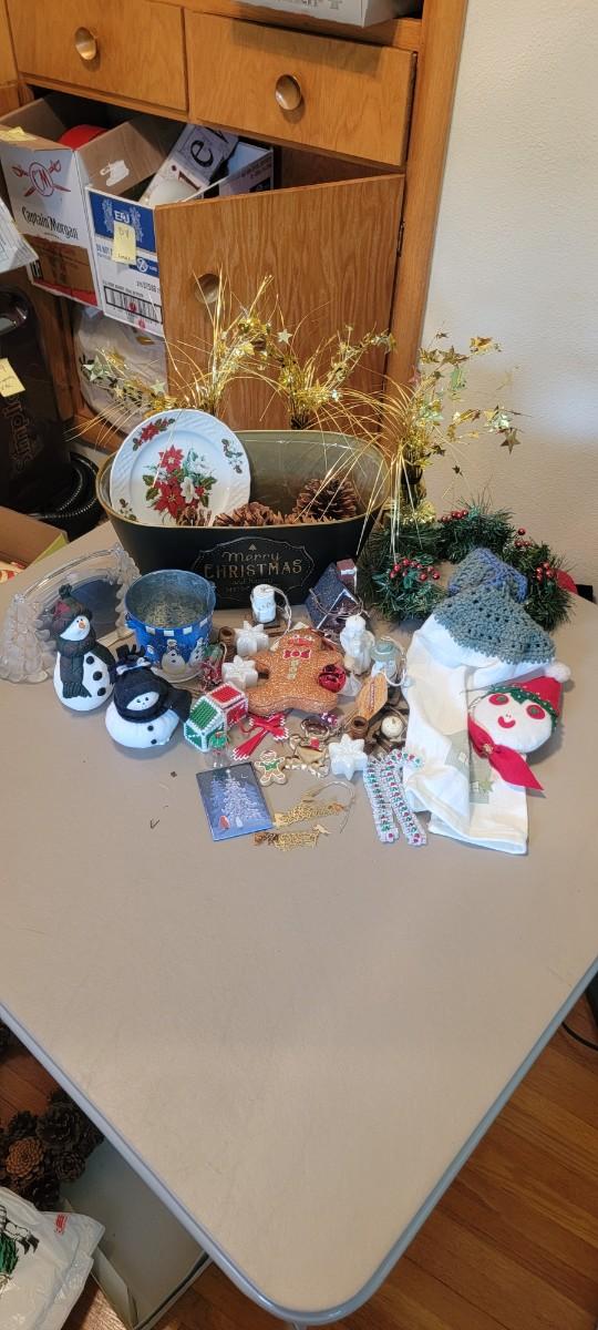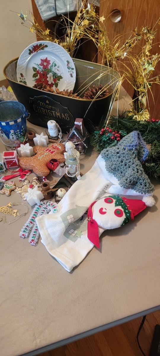 Miscellaneous Christmas ornaments. Towel, tin and more