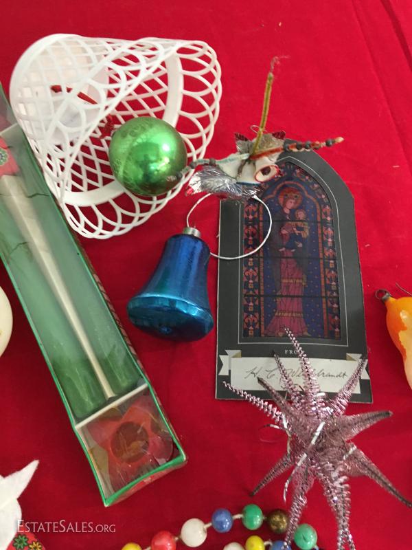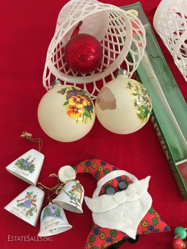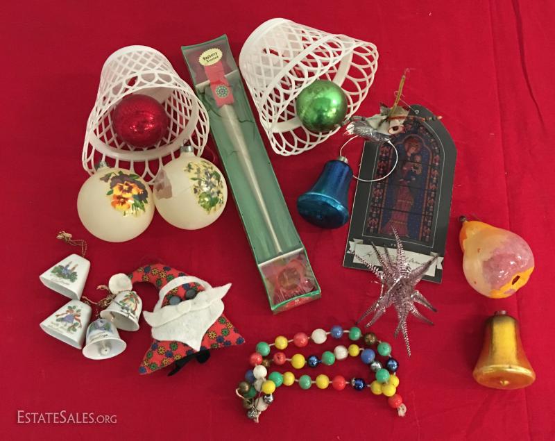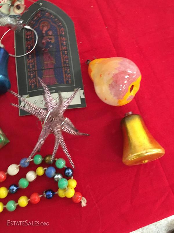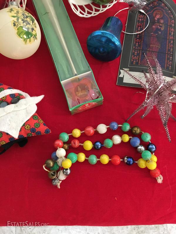 Miscellaneous Christmas Decorations Beads Bells 1950's show some wear from use, paint flacking on a few bulbs.