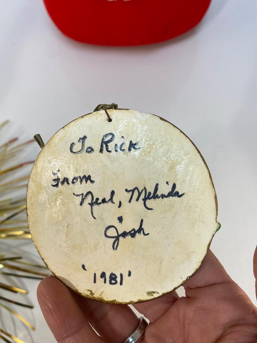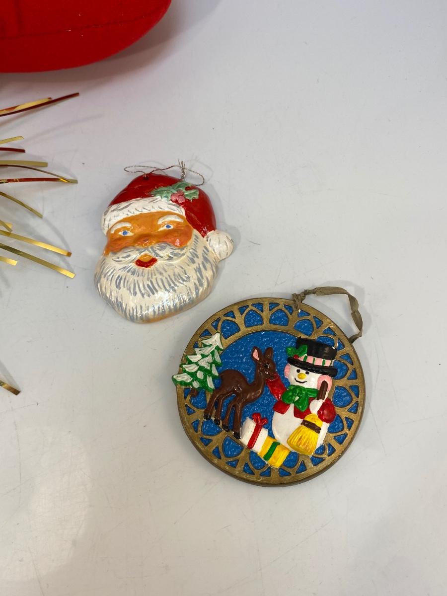 Miscellaneous Christmas Holiday Retro Decor Plush Mrs Claus Gold Foil Candle and Two Hand Panted Ornaments. Fair conditions.