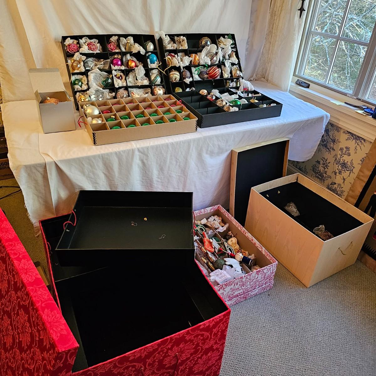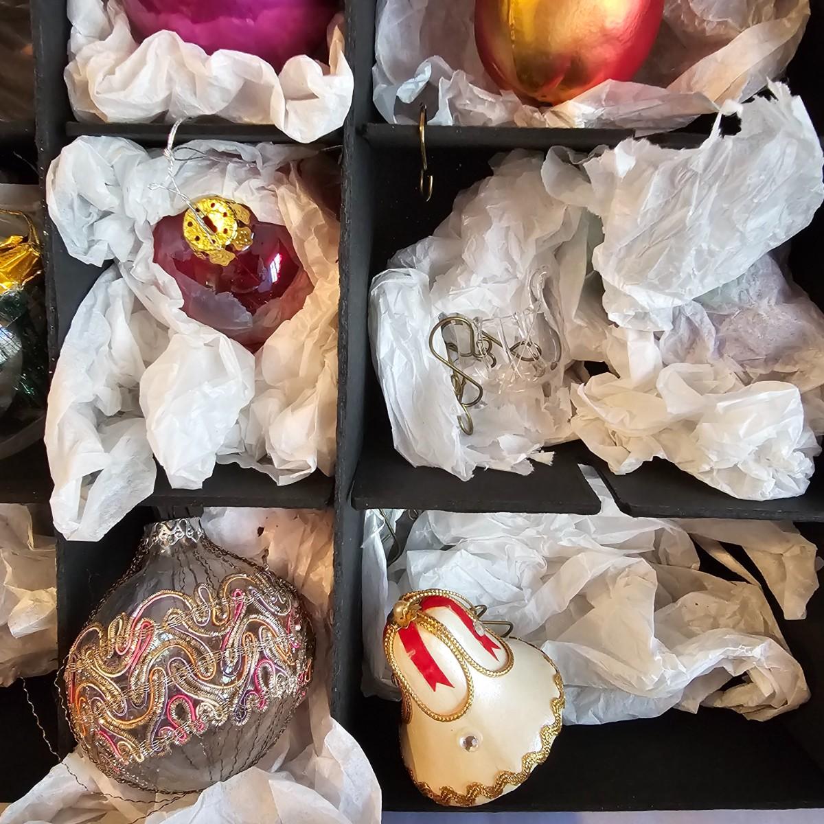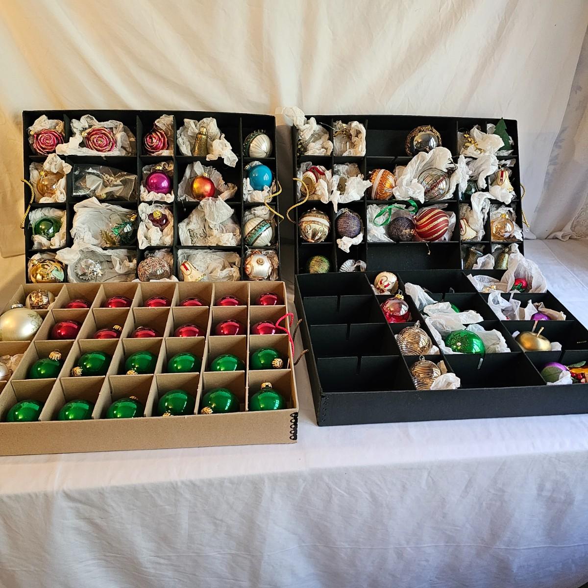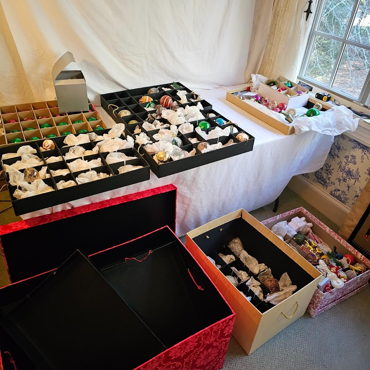 Three hardshell ornament storage boxes and dozens of ornaments to fill them. Lift out trays stack inside to protect delicate items. Glass, foam, plastic, resin and more with different themes and styles. A few vintage round glass balls and others. Boxes measure as follows: red-32 " x 23" x 17"H, pink- 22" x 16" x 8"H, and white- 22" x 16" x 14"H. See photos for details. Local pickup only.