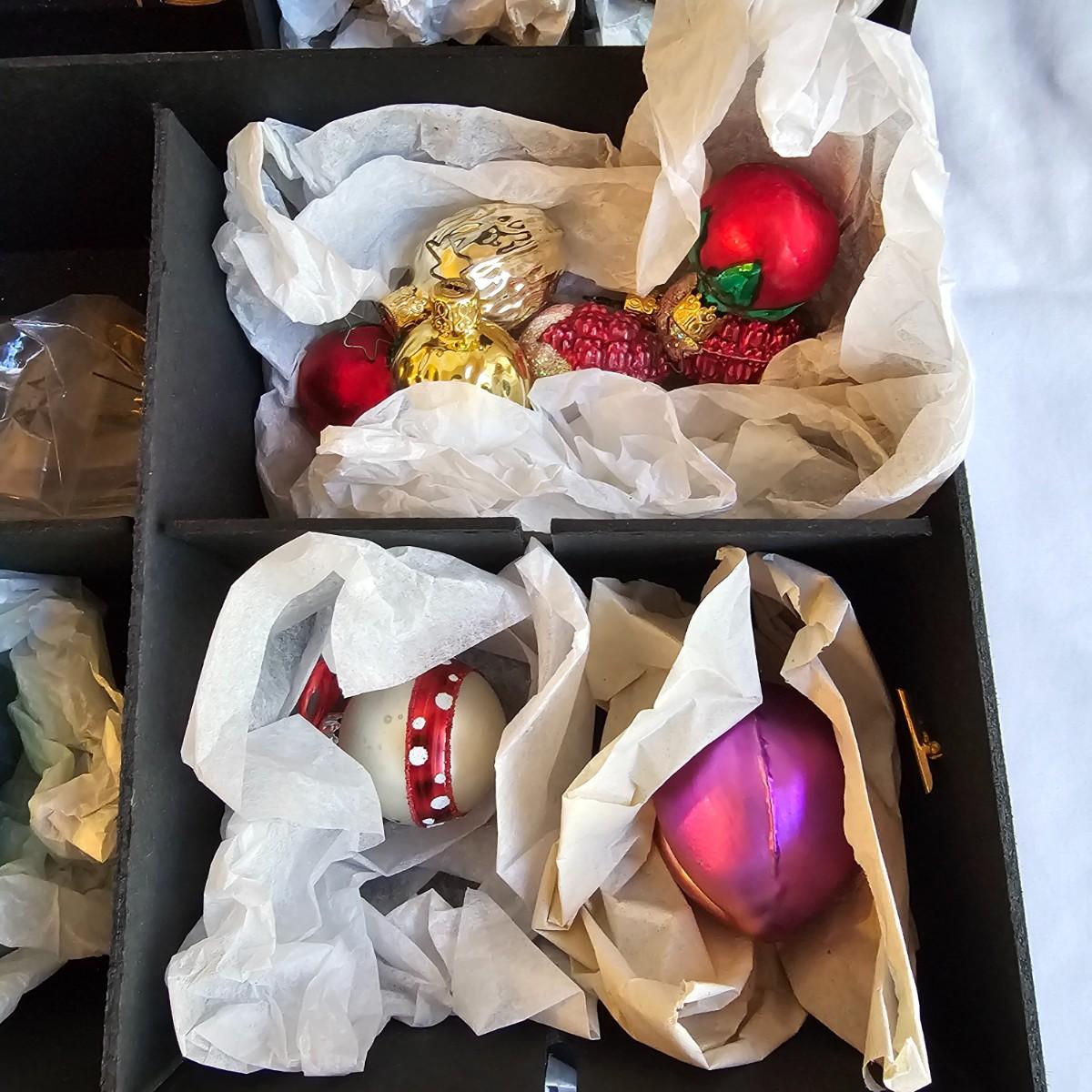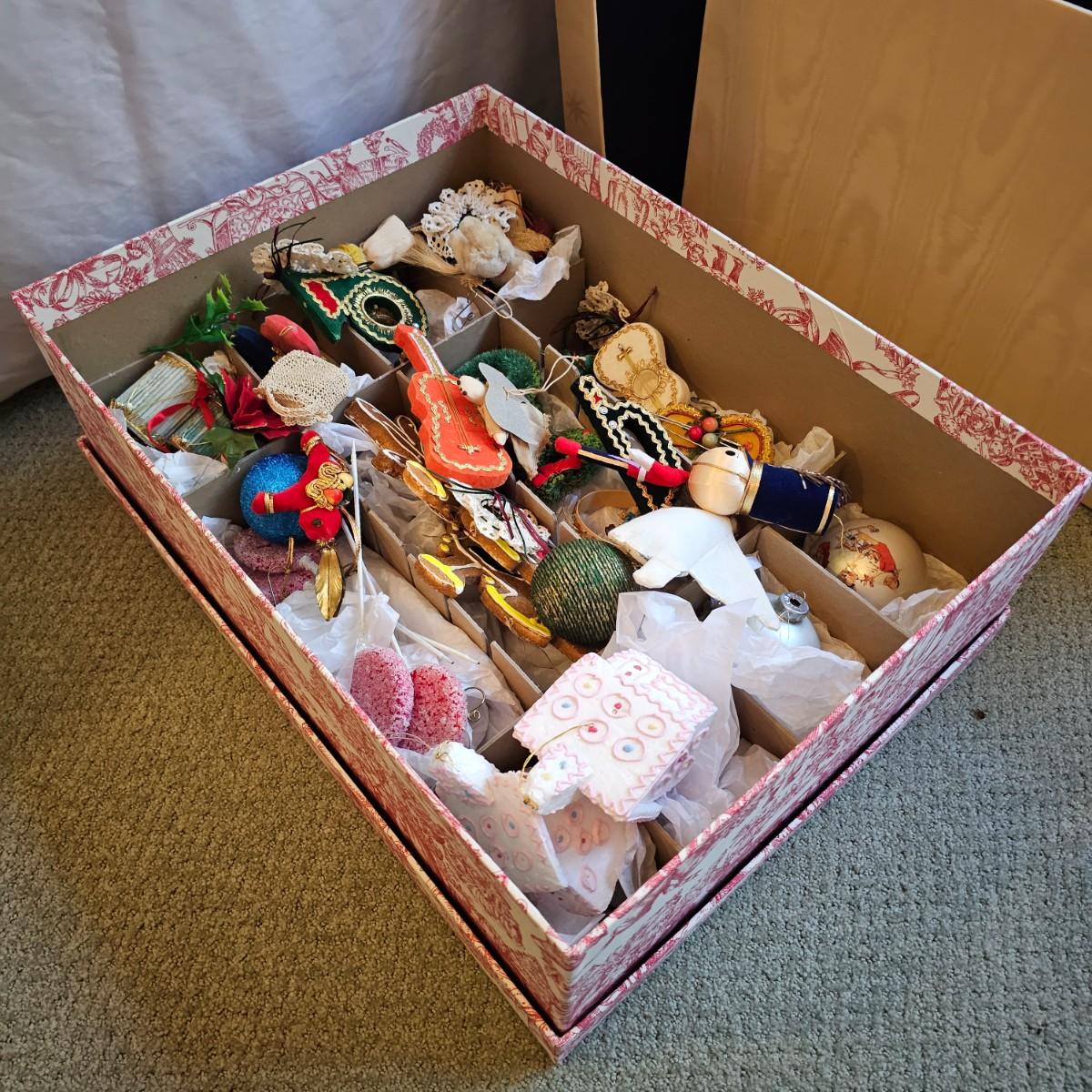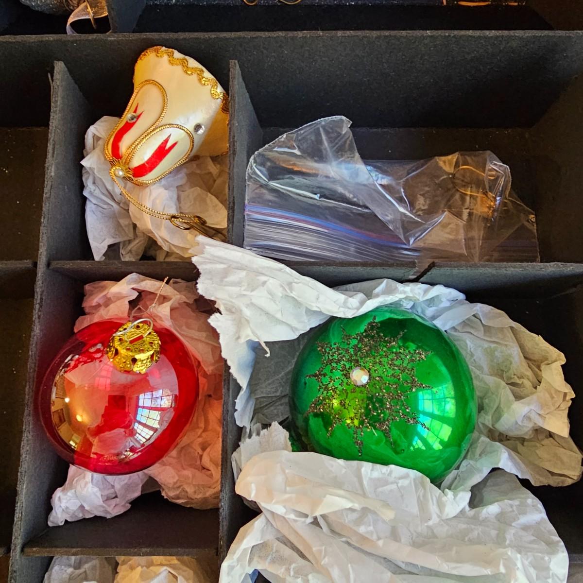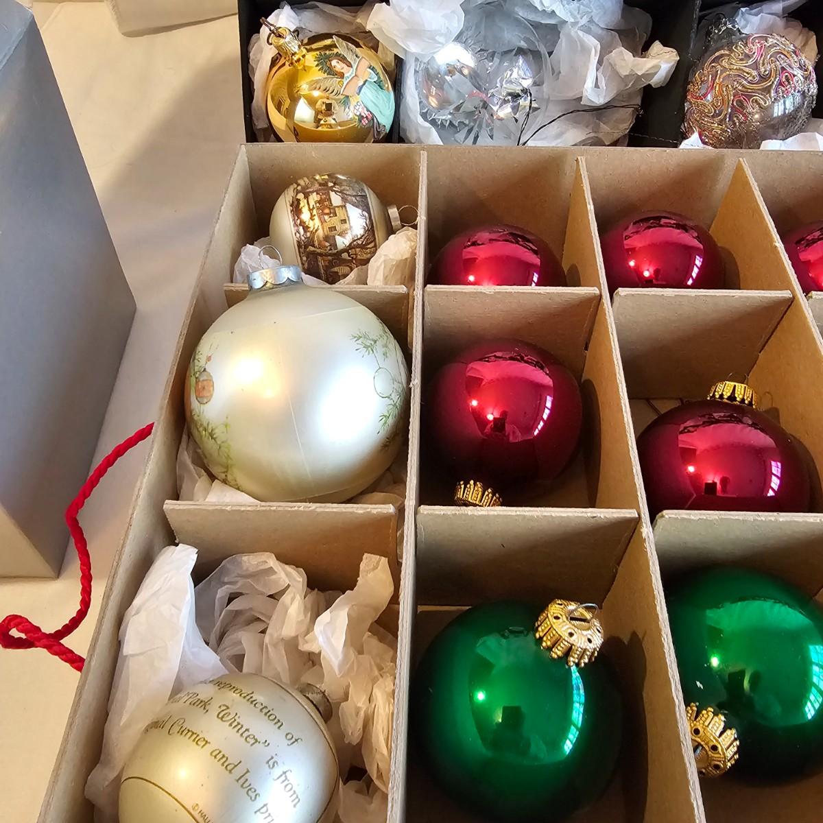 Three hardshell ornament storage boxes and dozens of ornaments to fill them. Lift out trays stack inside to protect delicate items. Glass, foam, plastic, resin and more with different themes and styles. A few vintage round glass balls and others. Boxes measure as follows: red-32 " x 23" x 17"H, pink- 22" x 16" x 8"H, and white- 22" x 16" x 14"H. See photos for details. Local pickup only.