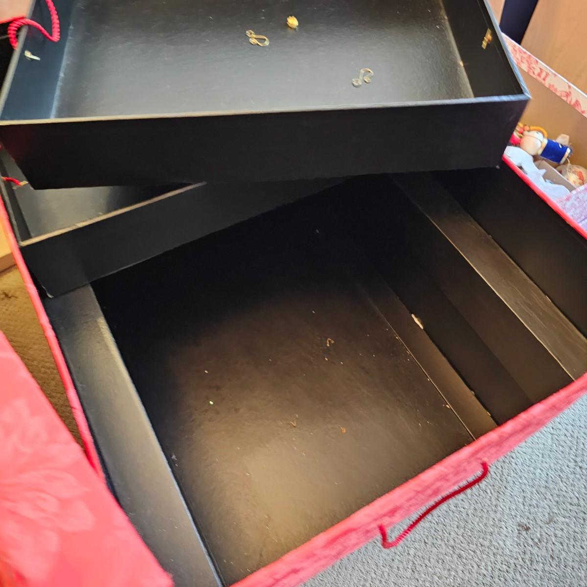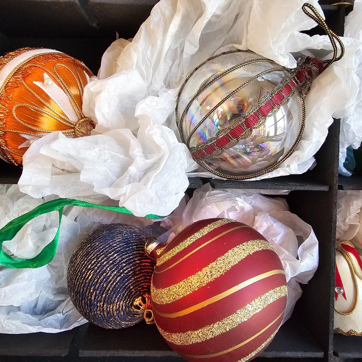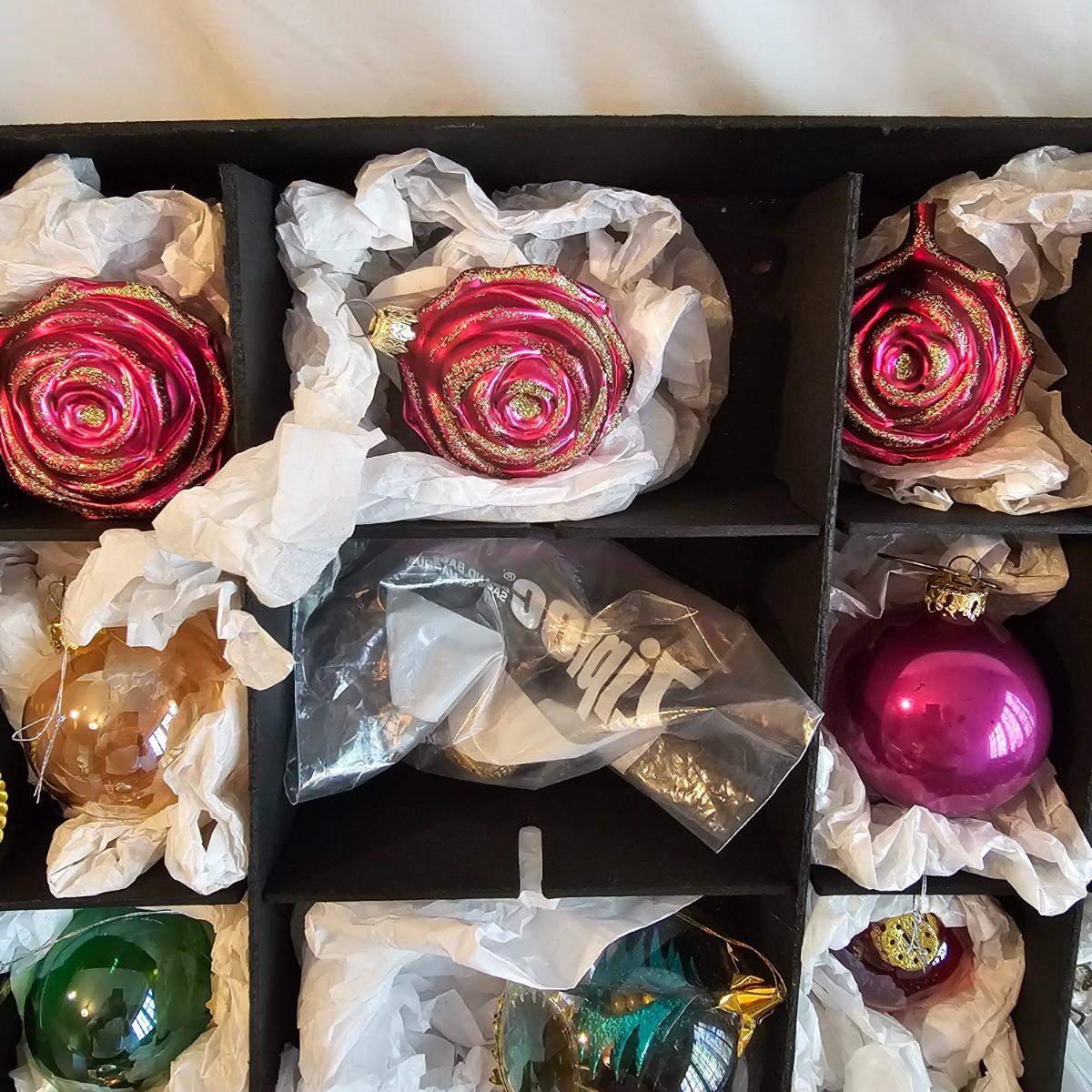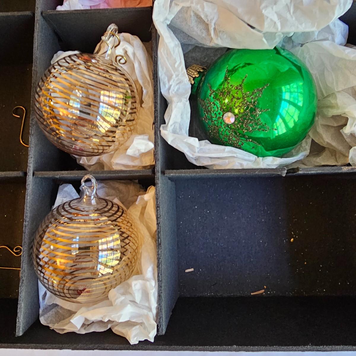 Three hardshell ornament storage boxes and dozens of ornaments to fill them. Lift out trays stack inside to protect delicate items. Glass, foam, plastic, resin and more with different themes and styles. A few vintage round glass balls and others. Boxes measure as follows: red-32 " x 23" x 17"H, pink- 22" x 16" x 8"H, and white- 22" x 16" x 14"H. See photos for details. Local pickup only.