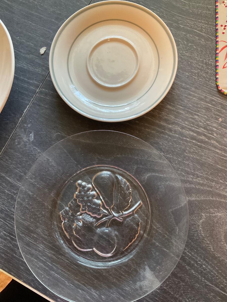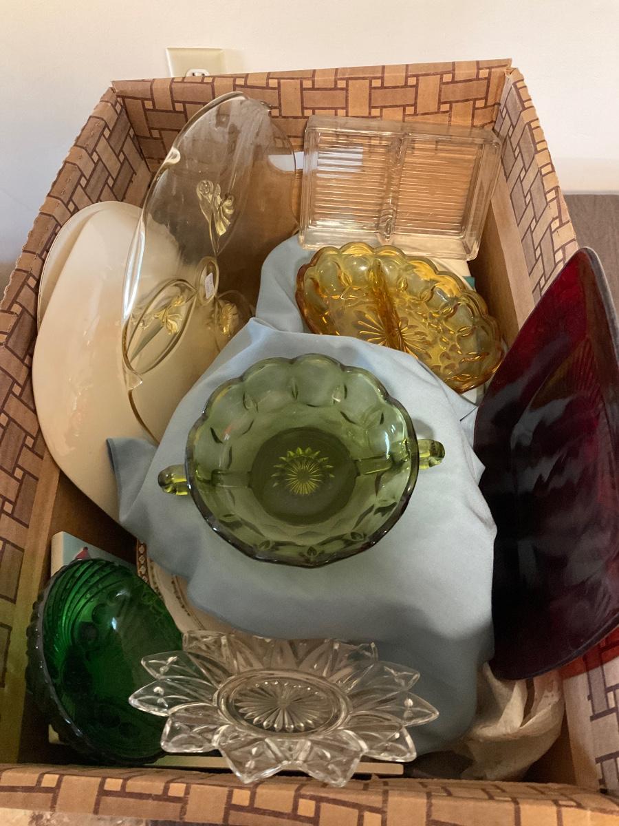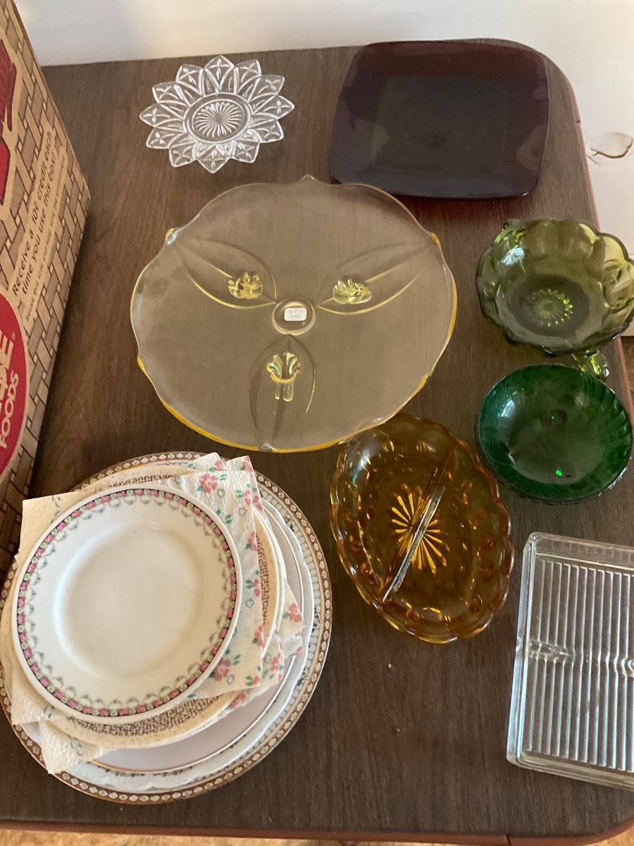 Box of miscellaneous colored glass and multiple clear plates with fruit and cream plates with gray stripe