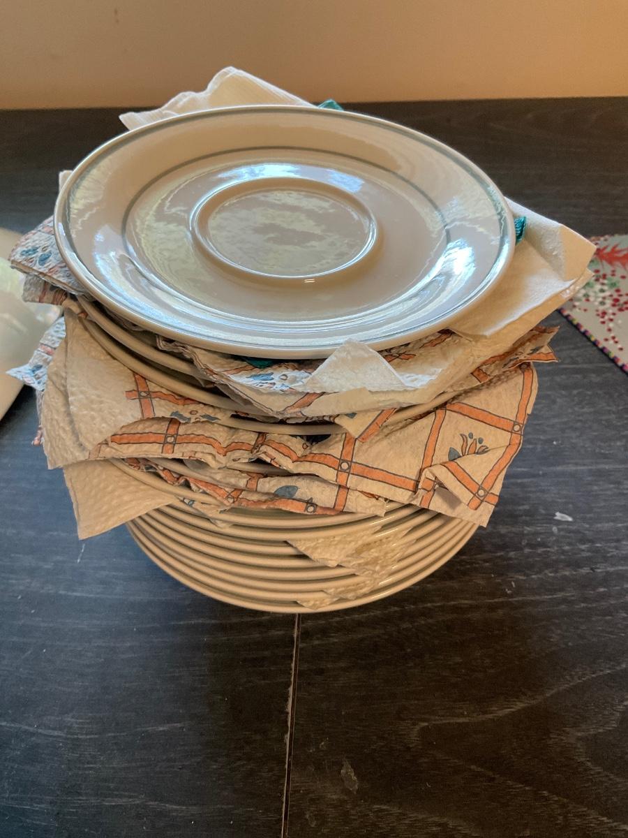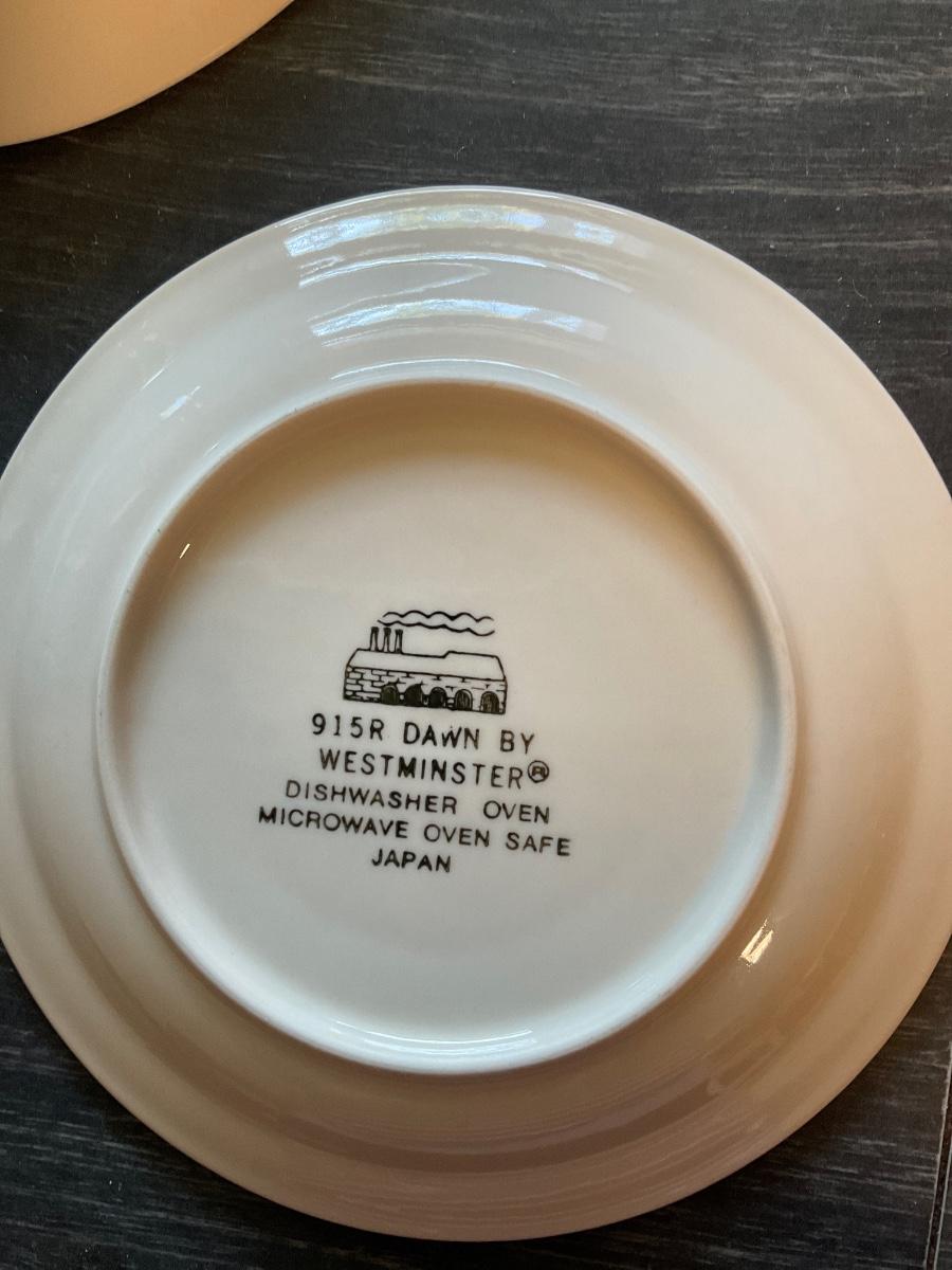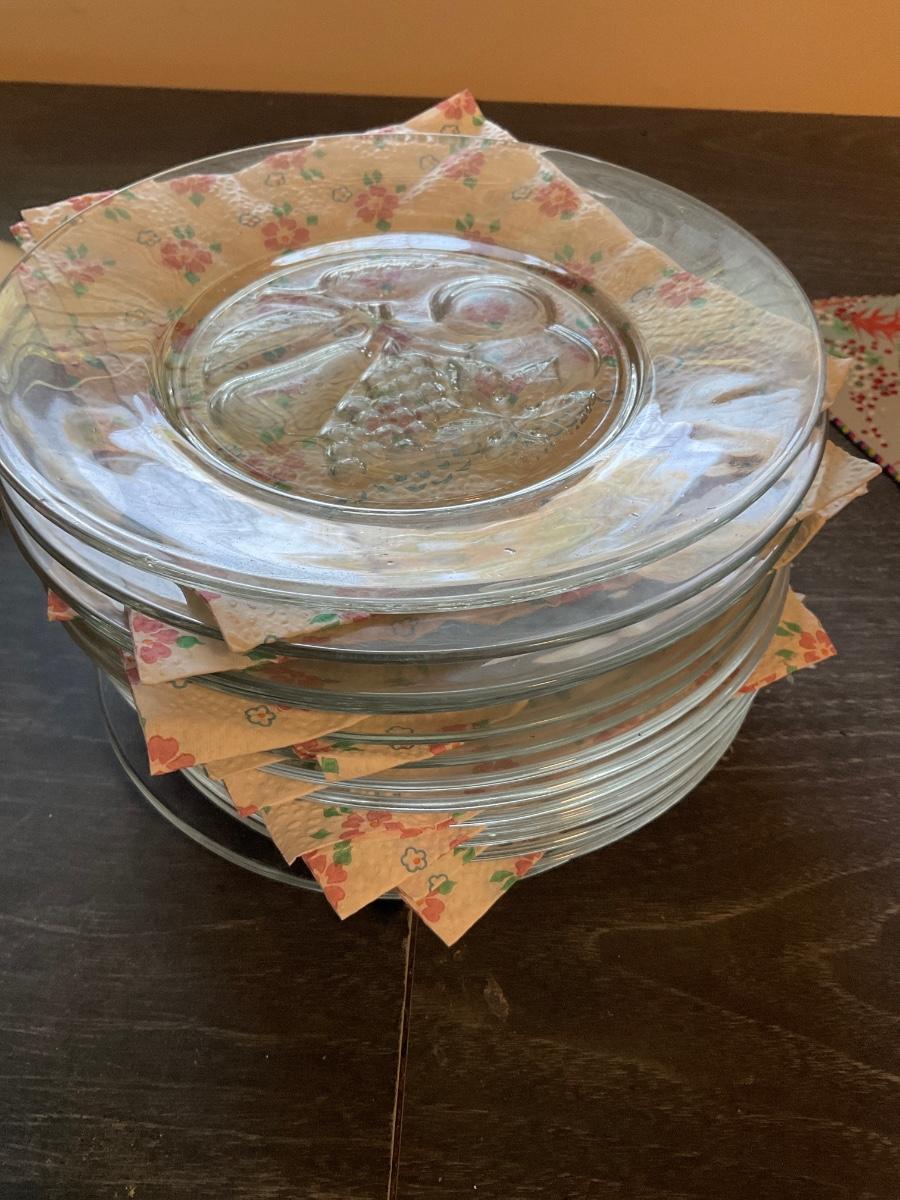 Box of miscellaneous colored glass and multiple clear plates with fruit and cream plates with gray stripe