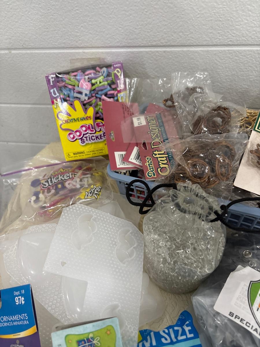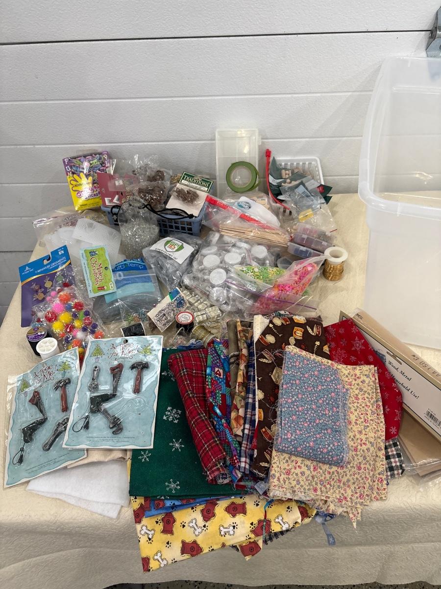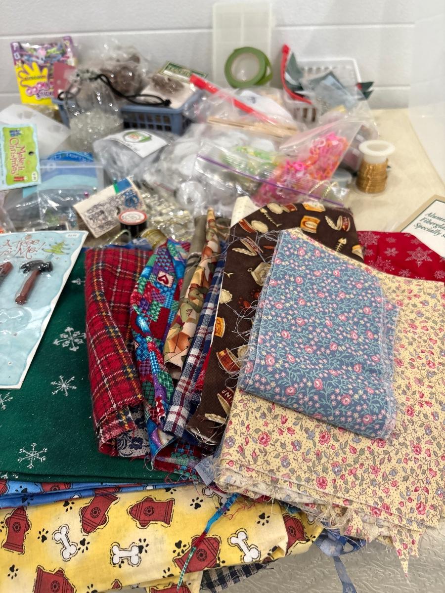 Miscellaneous crafting items which include cool foam stickers, some fabric, and other items in tote.