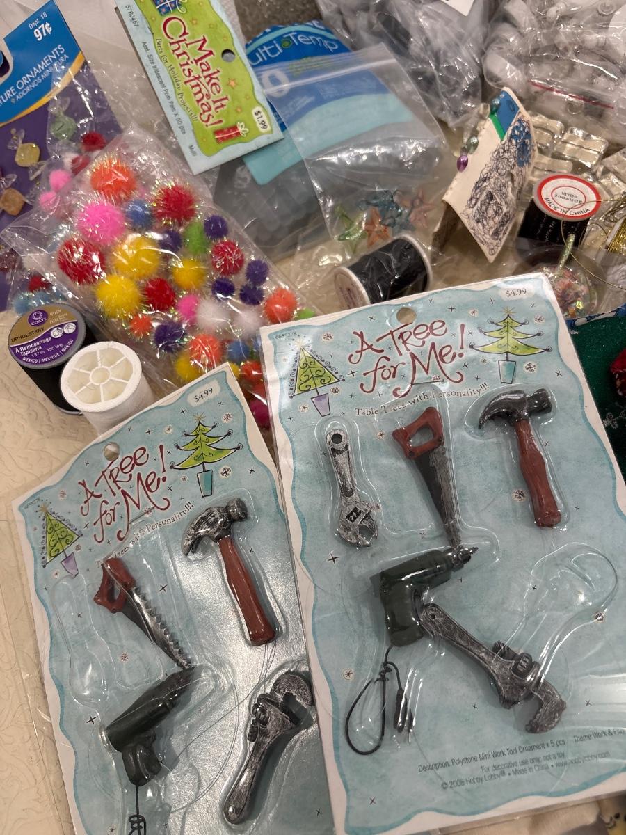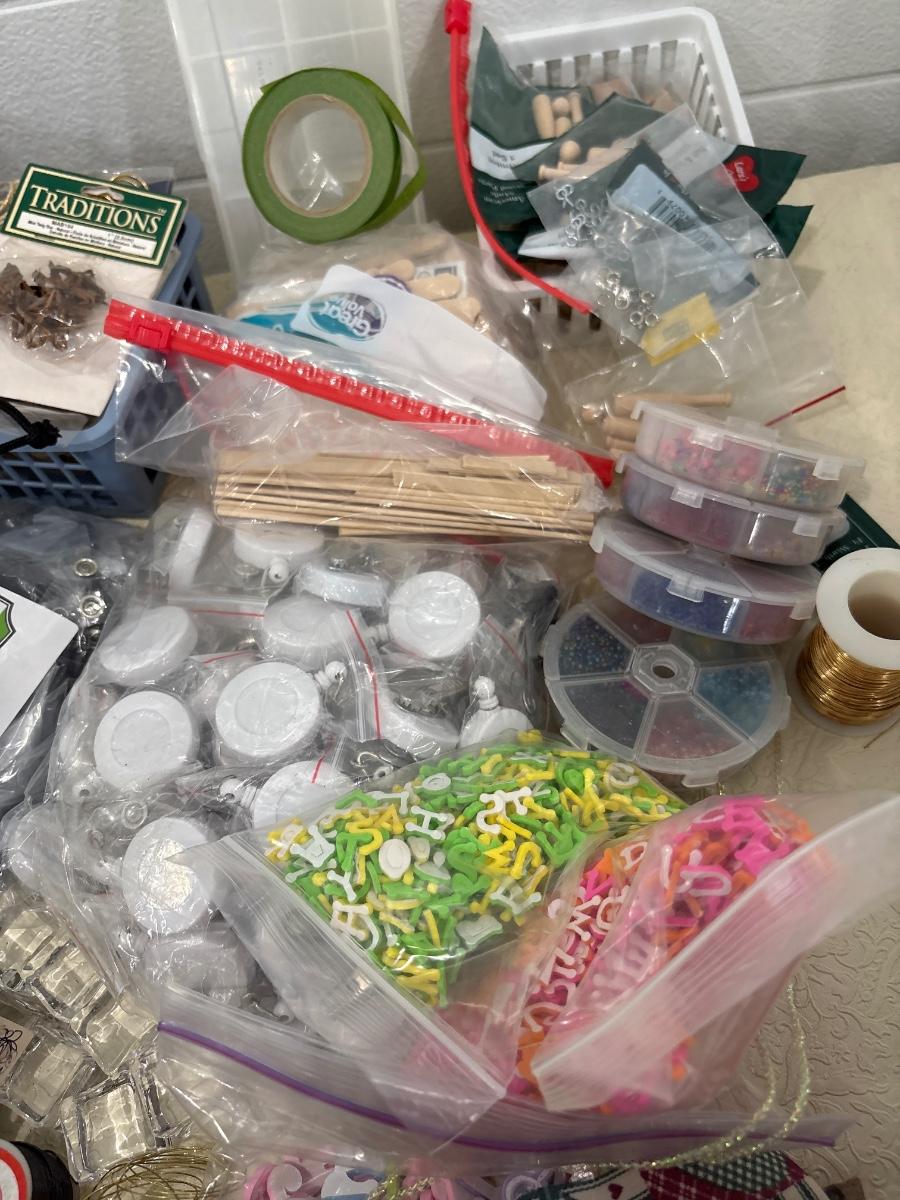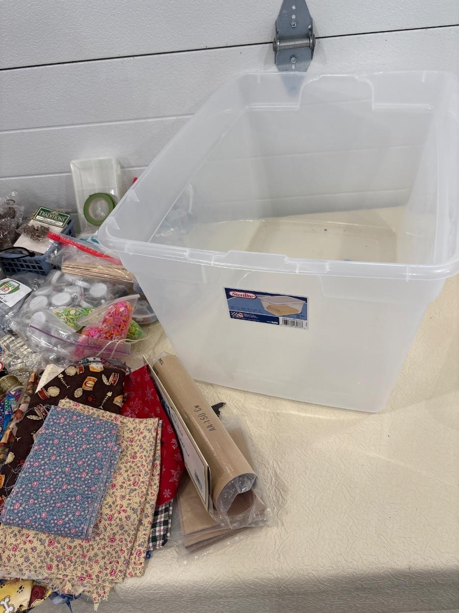 Miscellaneous crafting items which include cool foam stickers, some fabric, and other items in tote.
