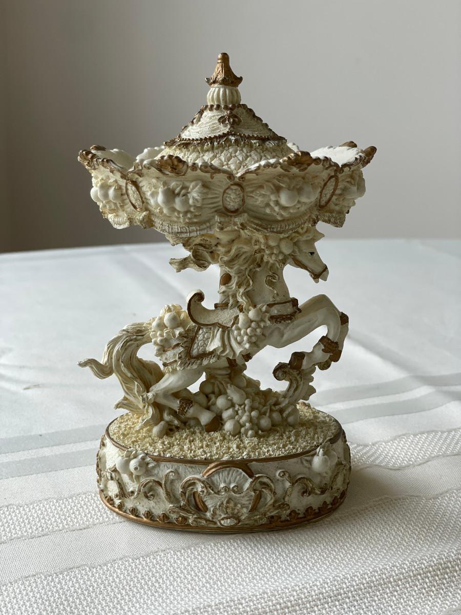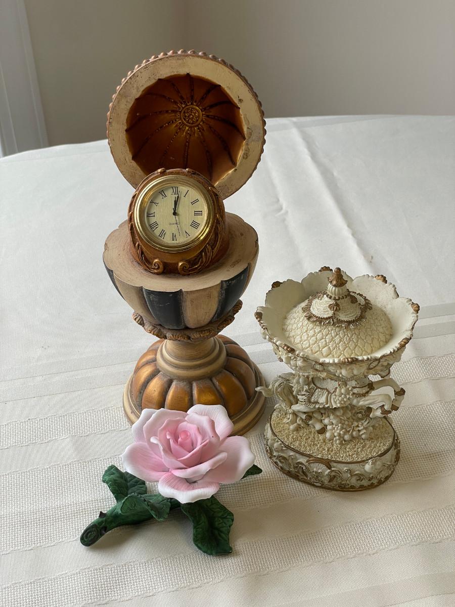 Hand-Painted Clock Decor (battery operated, unknown working condition), Herco Professional horse/carousel figurine, and glass flower figurine