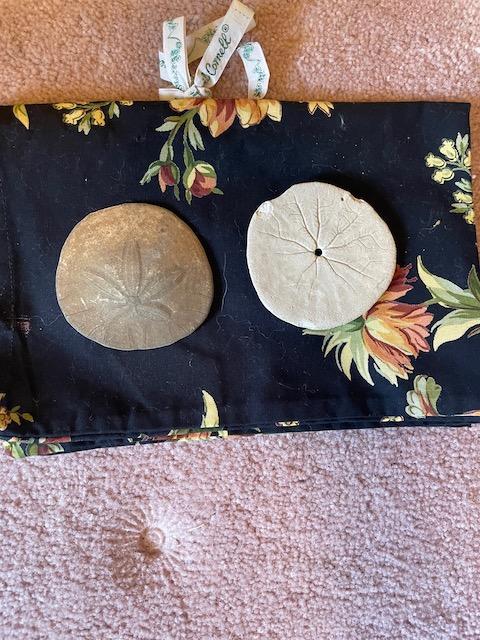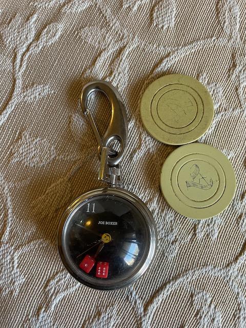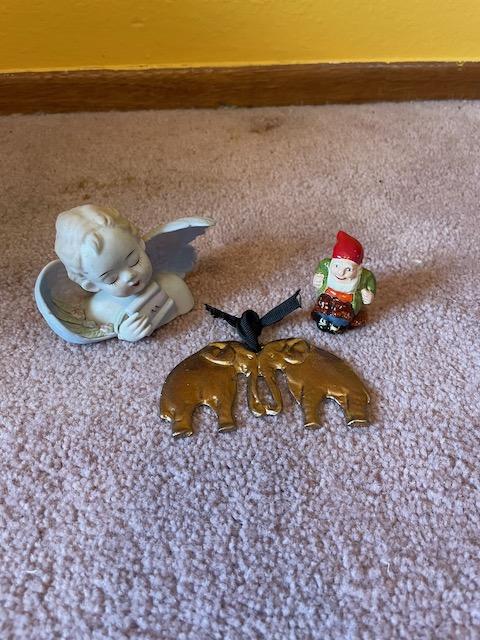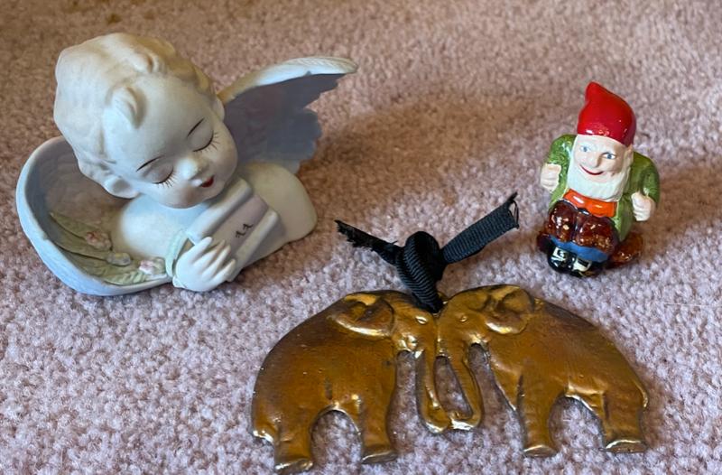 2 sand dollars, Porcelain angel head, small gnome, metal elephant hanging, 6 crystal candle holders and a poket watch with dice hands. Poker chips in picture for size reference - not included. Blue fabric under sand dollars not included.