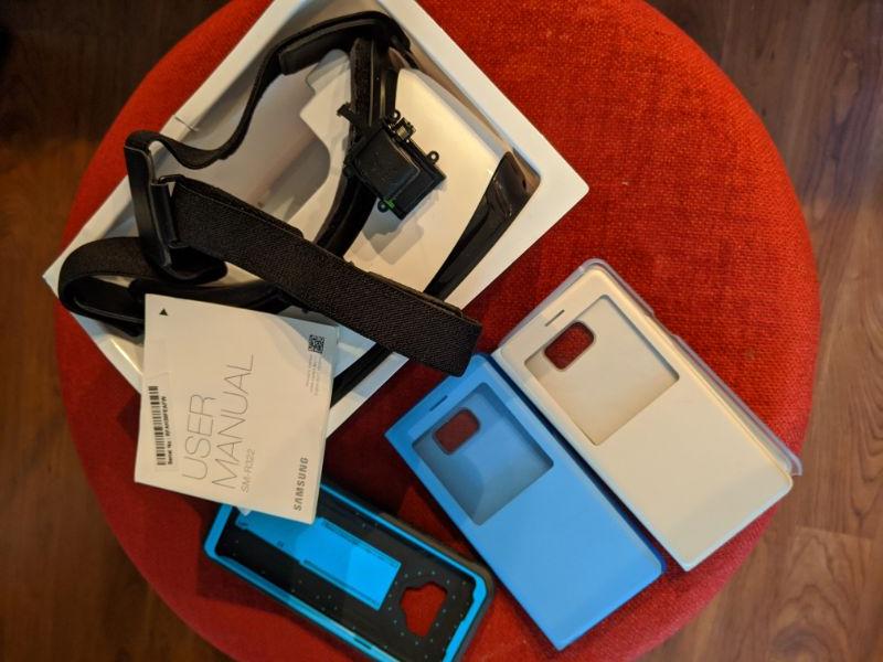 Samsung VR goggle with the micro USB removed. Sold as is. Samsung phone cases. Likely Galaxy S series and Note 7 or 8. Rechargeable battery charger x2.