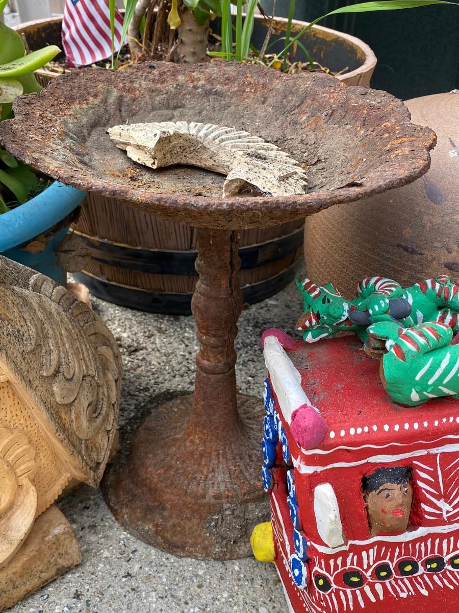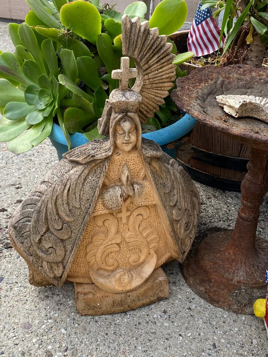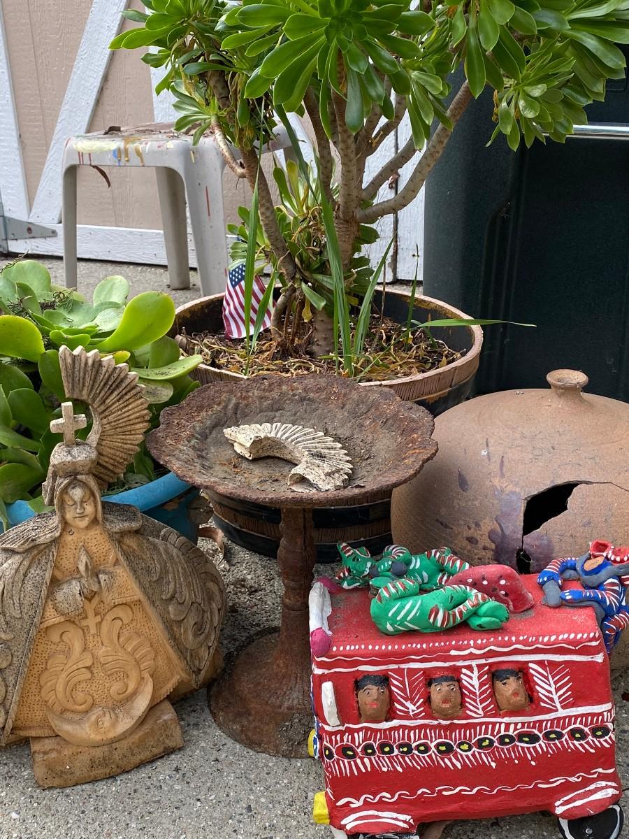 Miscellaneous Garden Yard Art and Potted Succulent Lot. Garden art is in weathered condition. Plants are nicely established. Plastic pots.