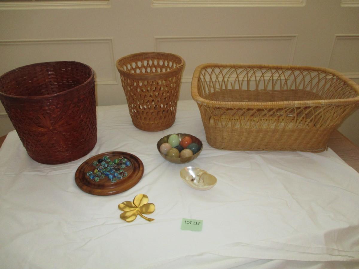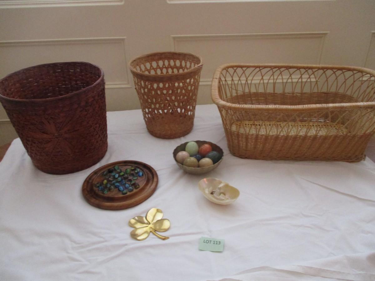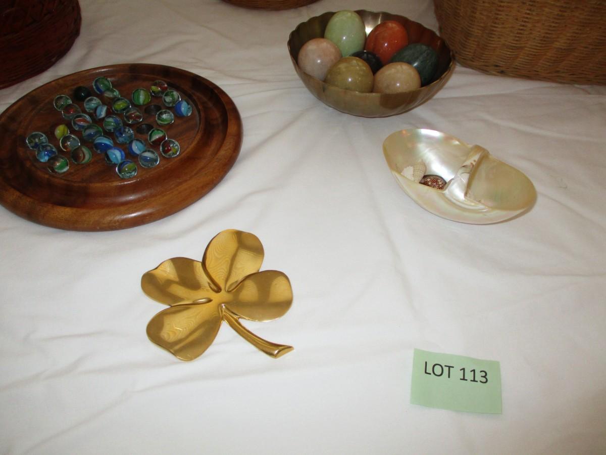 24kt gold plate 4 leaf clover. Shell basket. IQ Marble game. Marble eggs in brass bowl. Straw waste baskets.