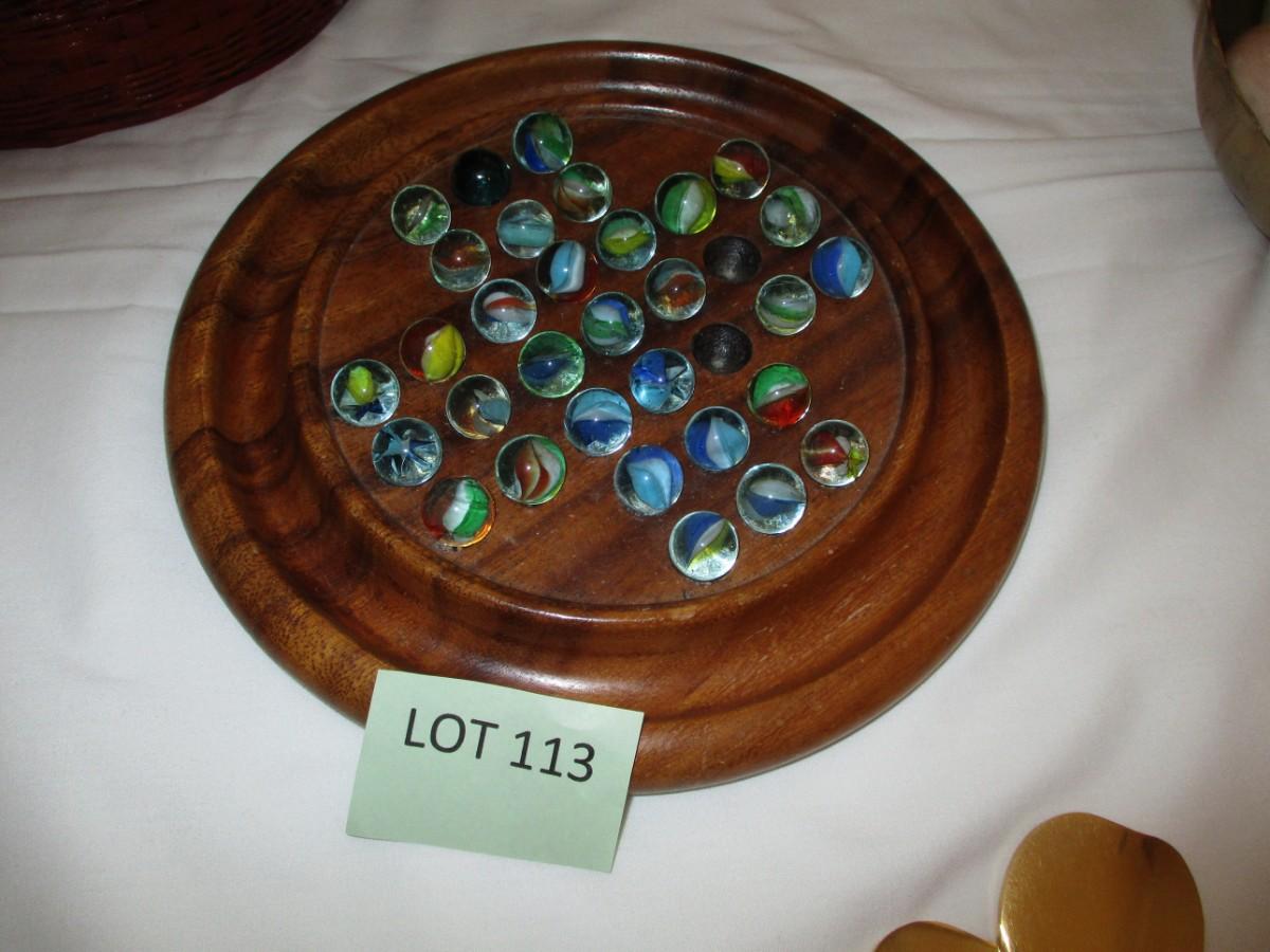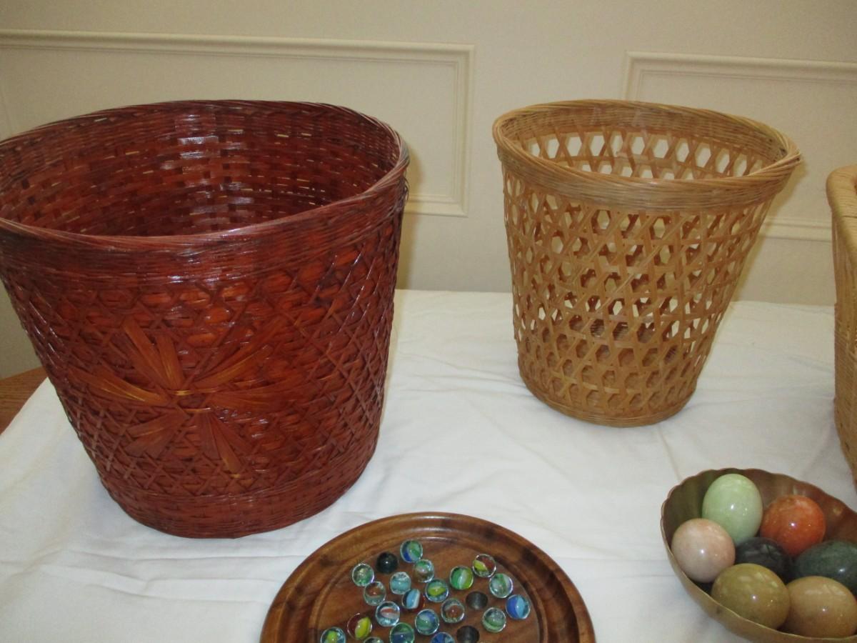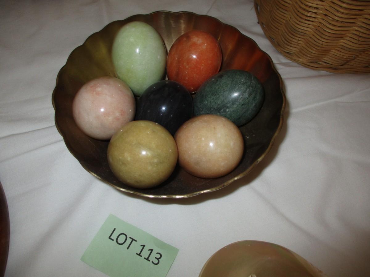 24kt gold plate 4 leaf clover. Shell basket. IQ Marble game. Marble eggs in brass bowl. Straw waste baskets.